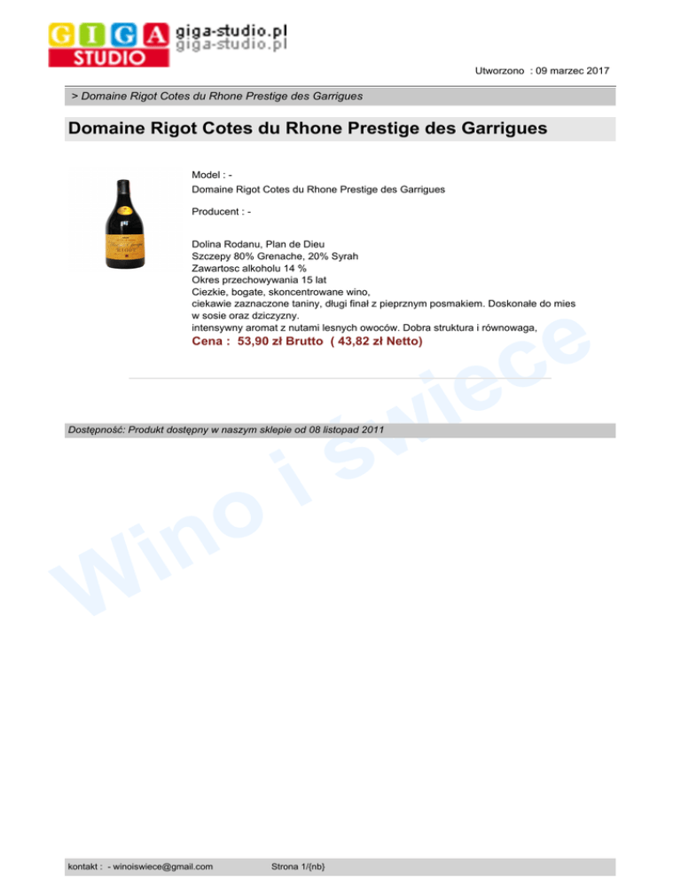 Utworzono : 09 marzec 2017 > Domaine Rigot Cotes du Rhone Prestige des Garrigues Domaine Rigot Cotes du Rhone Prestige des Garrigues Model : Domaine Rigot Cotes du Rhone Prestige des Garrigues Producent : Dolina Rodanu, Plan de Dieu Szczepy 80% Grenache, 20% Syrah Zawartosc alkoholu 14 % Okres przechowywania 15 lat Ciezkie, bogate, skoncentrowane wino, ciekawie zaznaczone taniny, długi finał z pieprznym posmakiem. Doskonałe do mies w sosie oraz dziczyzny. intensywny aromat z nutami lesnych owoców. Dobra struktura i równowaga, Cena : 53,90 zł Brutto ( 43,82 zł Netto) e i w ś Dostępność: Produkt dostępny w naszym sklepie od 08 listopad 2011 W i o in kontakt : - [email protected] Strona 1/{nb} e c