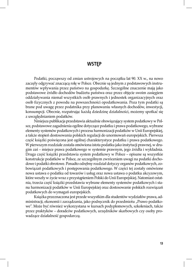 Wstęp Podatki, począwszy od zmian ustrojowych na początku lat 90. XX w., na nowo zaczęły odgrywać znaczącą rolę w Polsce. Obecnie są jednym z podstawowych instrumentów wpływania przez państwo na gospodarkę. Szczególne znaczenie mają jako podstawowe źródło dochodów budżetu państwa oraz przez objęcie swoim zasięgiem oddziaływania niemal wszystkich osób prawnych i jednostek organizacyjnych oraz osób fizycznych z powodu na powszechności opodatkowania. Poza tym podatki są brane pod uwagę przez podatnika przy planowaniu własnych dochodów, inwestycji, konsumpcji. Obecnie, rozpatrując każdą dziedzinę działalności, możemy spotkać się z uwzględnianiem podatków. Niniejsza publikacja przedstawia aktualnie obowiązujący system podatkowy w Polsce, podstawowe zagadnienia ogólne dotyczące podatku i prawa podatkowego, wybrane elementy systemów podatkowych i procesu harmonizacji podatków w Unii Europejskiej, a także stopień dostosowania polskich regulacji do unormowań europejskich. Pierwsza część książki poświęcona jest ogólnej charakterystyce podatku i prawa podatkowego. W pierwszym rozdziale została omówiona istota podatku jako instytucji prawnej, w drugim zaś – miejsce prawa podatkowego w systemie prawnym, jego źródła i wykładnia. Druga część książki przedstawia system podatkowy w Polsce – opisane są wszystkie konstrukcje podatków w Polsce, ze szczególnym zwróceniem uwagi na podatki dochodowe i podatki obrotowe. Ponadto odrębny rozdział dotyczy organów podatkowych, zobowiązań podatkowych i postępowania podatkowego. W części tej zostały omówione nowa ustawa o podatku od towarów i usług oraz nowa ustawa o podatku akcyzowym, które weszły w życie wraz z przystąpieniem Polski do Unii Europejskiej. Natomiast ostatnia, trzecia część książki przedstawia wybrane elementy systemów podatkowych i stanu harmonizacji podatków w Unii Europejskiej oraz dostosowanie polskich rozwiązań podatkowych do wymagań europejskich. Książka przeznaczona jest przede wszystkim dla studentów wydziałów prawa, administracji, ekonomii i zarządzania, jako podręcznik do przedmiotu „Prawo podatkowe”. Może być również wykorzystana w kursach podyplomowych, szkoleniach, także przez praktyków – doradców podatkowych, urzędników skarbowych czy osoby prowadzące działalność gospodarczą. 13
