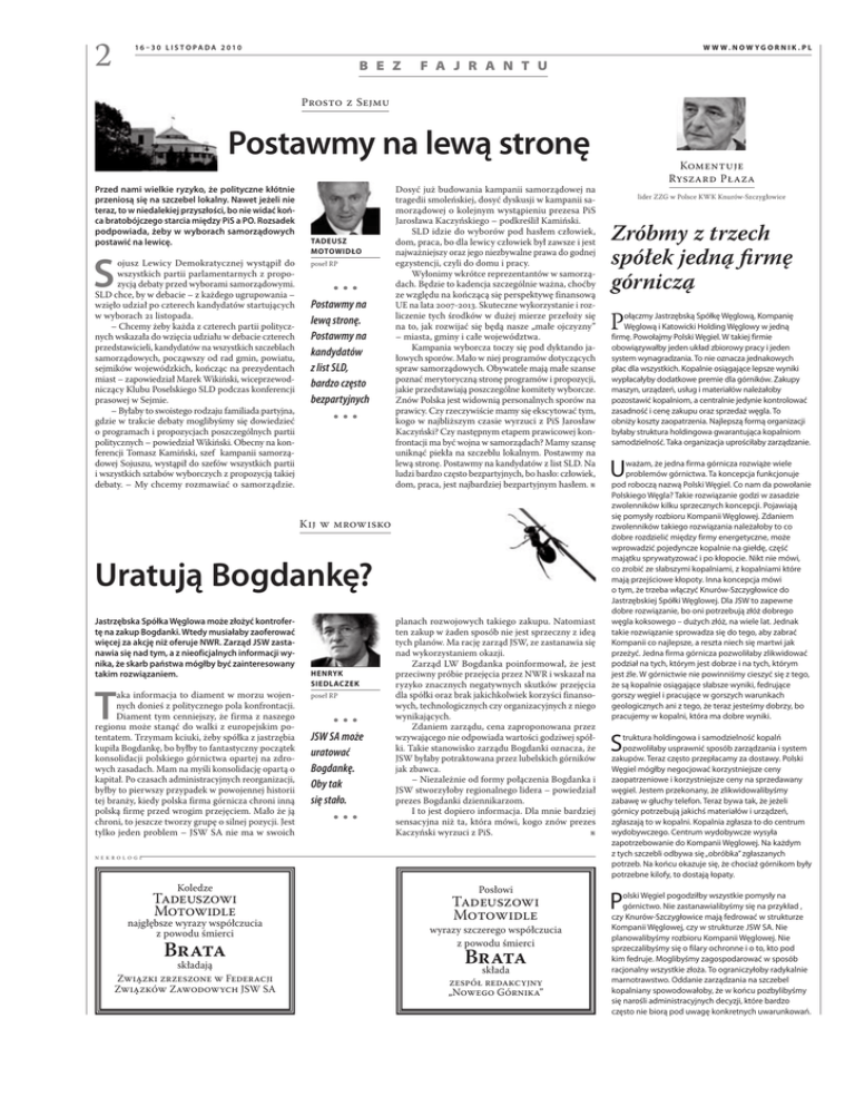 2 w w w. now ygornik . pl 16 –30 li s to pada 2010 b e z f a j r a n t u Prosto z Sejmu Postawmy na lewą stronę Przed nami wielkie ryzyko, że polityczne kłótnie przeniosą się na szczebel lokalny. Nawet jeżeli nie teraz, to w niedalekiej przyszłości, bo nie widać końca bratobójczego starcia między PiS a PO. Rozsadek podpowiada, żeby w wyborach samorządowych postawić na lewicę. S ojusz Lewicy Demokratycznej wystąpił do wszystkich partii parlamentarnych z propozycją debaty przed wyborami samorządowymi. SLD chce, by w debacie – z każdego ugrupowania – wzięło udział po czterech kandydatów startujących w wyborach 21 listopada. – Chcemy żeby każda z czterech partii politycznych wskazała do wzięcia udziału w debacie czterech przedstawicieli, kandydatów na wszystkich szczeblach samorządowych, począwszy od rad gmin, powiatu, sejmików wojewódzkich, kończąc na prezydentach miast – zapowiedział Marek Wikiński, wiceprzewodniczący Klubu Poselskiego SLD podczas konferencji prasowej w Sejmie. – Byłaby to swoistego rodzaju familiada partyjna, gdzie w trakcie debaty moglibyśmy się dowiedzieć o programach i propozycjach poszczególnych partii politycznych – powiedział Wikiński. Obecny na konferencji Tomasz Kamiński, szef kampanii samorządowej Sojuszu, wystąpił do szefów wszystkich partii i wszystkich sztabów wyborczych z propozycją takiej debaty. – My chcemy rozmawiać o samorządzie. Tadeusz Motowidło poseł RP Postawmy na lewą stronę. Postawmy na kandydatów z list SLD, bardzo często bezpartyjnych Dosyć już budowania kampanii samorządowej na tragedii smoleńskiej, dosyć dyskusji w kampanii samorządowej o kolejnym wystąpieniu prezesa PiS Jarosława Kaczyńskiego – podkreślił Kamiński. SLD idzie do wyborów pod hasłem człowiek, dom, praca, bo dla lewicy człowiek był zawsze i jest najważniejszy oraz jego niezbywalne prawa do godnej egzystencji, czyli do domu i pracy. Wyłonimy wkrótce reprezentantów w samorządach. Będzie to kadencja szczególnie ważna, choćby ze względu na kończącą się perspektywę finansową UE na lata 2007-2013. Skuteczne wykorzystanie i rozliczenie tych środków w dużej mierze przełoży się na to, jak rozwijać się będą nasze „małe ojczyzny” – miasta, gminy i całe województwa. Kampania wyborcza toczy się pod dyktando jałowych sporów. Mało w niej programów dotyczących spraw samorządowych. Obywatele mają małe szanse poznać merytoryczną stronę programów i propozycji, jakie przedstawiają poszczególne komitety wyborcze. Znów Polska jest widownią personalnych sporów na prawicy. Czy rzeczywiście mamy się ekscytować tym, kogo w najbliższym czasie wyrzuci z PiS Jarosław Kaczyński? Czy następnym etapem prawicowej konfrontacji ma być wojna w samorządach? Mamy szansę uniknąć piekła na szczeblu lokalnym. Postawmy na lewą stronę. Postawmy na kandydatów z list SLD. Na ludzi bardzo często bezpartyjnych, bo hasło: człowiek, dom, praca, jest najbardziej bezpartyjnym hasłem.l Kij w mrowisko Uratują Bogdankę? Jastrzębska Spółka Węglowa może złożyć kontrofertę na zakup Bogdanki. Wtedy musiałaby zaoferować więcej za akcję niż oferuje NWR. Zarząd JSW zastanawia się nad tym, a z nieoficjalnych informacji wynika, że skarb państwa mógłby być zainteresowany takim rozwiązaniem. T aka informacja to diament w morzu wojennych donieś z politycznego pola konfrontacji. Diament tym cenniejszy, że firma z naszego regionu może stanąć do walki z europejskim potentatem. Trzymam kciuki, żeby spółka z jastrzębia kupiła Bogdankę, bo byłby to fantastyczny początek konsolidacji polskiego górnictwa opartej na zdrowych zasadach. Mam na myśli konsolidację opartą o kapitał. Po czasach administracyjnych reorganizacji, byłby to pierwszy przypadek w powojennej historii tej branży, kiedy polska firma górnicza chroni inną polską firmę przed wrogim przejęciem. Mało że ją chroni, to jeszcze tworzy grupę o silnej pozycji. Jest tylko jeden problem – JSW SA nie ma w swoich henryk siedlaczek poseł RP JSW SA może uratować Bogdankę. Oby tak się stało. planach rozwojowych takiego zakupu. Natomiast ten zakup w żaden sposób nie jest sprzeczny z ideą tych planów. Ma rację zarząd JSW, ze zastanawia się nad wykorzystaniem okazji. Zarząd LW Bogdanka poinformował, że jest przeciwny próbie przejęcia przez NWR i wskazał na ryzyko znacznych negatywnych skutków przejęcia dla spółki oraz brak jakichkolwiek korzyści finansowych, technologicznych czy organizacyjnych z niego wynikających. Zdaniem zarządu, cena zaproponowana przez wzywającego nie odpowiada wartości godziwej spółki. Takie stanowisko zarządu Bogdanki oznacza, że JSW byłaby potraktowana przez lubelskich górników jak zbawca. – Niezależnie od formy połączenia Bogdanka i JSW stworzyłoby regionalnego lidera – powiedział prezes Bogdanki dziennikarzom. I to jest dopiero informacja. Dla mnie bardziej sensacyjna niż ta, która mówi, kogo znów prezes Kaczyński wyrzuci z PiS. l nekrolog I Koledze Tadeuszowi Motowidle najgłębsze wyrazy współczucia z powodu śmierci Brata składają Związki zrzeszone w Federacji Związków Zawodowych JSW SA Posłowi Tadeuszowi Motowidle wyrazy szczerego współczucia z powodu śmierci Brata składa zespół redakcyjny „Nowego Górnika” Komentuje Ryszard Płaza lider ZZG w Polsce KWK Knurów-Szczygłowice Zróbmy z trzech spółek jedną firmę górniczą P ołączmy Jastrzębską Spółkę Węglową, Kompanię Węglową i Katowicki Holding Węglowy w jedną firmę. Powołajmy Polski Węgiel. W takiej firmie obowiązywałby jeden układ zbiorowy pracy i jeden system wynagradzania. To nie oznacza jednakowych płac dla wszystkich. Kopalnie osiągające lepsze wyniki wypłacałyby dodatkowe premie dla górników. Zakupy maszyn, urządzeń, usług i materiałów należałoby pozostawić kopalniom, a centralnie jedynie ko