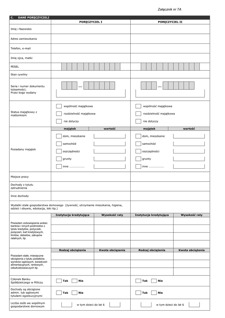 Załącznik nr 7A C. DANE PORĘCZYCIELI PORĘCZYCIEL I PORĘCZYCIEL II Imię i Nazwisko Adres zamieszkania Telefon, e-mail Imię ojca, matki PESEL Stan cywilny __ Seria i numer dokumentu tożsamości; Przez kogo wydany Status majątkowy z małżonkiem wspólność majątkowa wspólność majątkowa rozdzielność majątkowa rozdzielność majątkowa nie dotyczy nie dotyczy majątek Posiadany majątek __ wartość majątek wartość dom, mieszkanie dom, mieszkanie samochód samochód oszczędności oszczędności grunty grunty inne ………………… inne ………………… Miejsce pracy Dochody z tytułu zatrudnienia Inne dochody Wydatki stałe gospodarstwa domowego (żywność, utrzymanie mieszkania, higiena, odzież i obuwie, edukacja, leki itp.) Instytucja kredytująca Wysokość raty Instytucja kredytująca Wysokość raty Rodzaj obciążenia Kwota obciązenia Rodzaj obciążenia Kwota obciążenia Posiadam zobowiązania wobec banków i innych podmiotów z tytułu kredytów, pożyczek, poręczeń, kart kredytowych, limitów, debetów, zakupów ratalnych, itp. Posiadam stałe, miesięczne obciążenia z tytułu podatków, wyroków sądowych, świadczeń alimentacyjnych, rentowych, odszkodowawczych itp. Członek Banku Spółdzielczego w Miliczu Tak Nie Tak Nie Dochody są obciążone admin. lub sądowymi tytułami egzekucyjnymi Tak Nie Tak Nie Liczba osób we wspólnym gospodarstwie domowym w tym dzieci do lat 6 w tym dzieci do lat 6 OŚWIADCZENIA 1. 2. 3. Przyjmuję do wiadomości i akceptuję informację Banku Spółdzielczego w Miliczu, że: 1) Bank Spółdzielczy w Miliczu z siedzibą ul. Trzebnicka 7, 56-300 Milicz będzie administratorem moich danych osobowych w rozumieniu ustawy z dnia 29 sierpnia 1997 r. o ochronie danych osobowych (Dz. U. z 2002 r. Nr 101, poz. 926, z późn. zm); 2) dane te przetwarzane będą przez Bank Spółdzielczy w Miliczu z siedzibą ul. Trzebnicka 7, 56-300 Milicz w celu rozpatrzenia niniejszego wniosku oraz zawarcia i realizacji umowy kredytu, a także w celach określonych w art. 23 ust. 1 pkt 5 ustawy o ochronie danych osobowych; 3) Bank Spółdzielczy w Miliczu z siedzibą ul. Trzebnicka 7, 56-300 Milicz nie będzie udostępniać tych danych innym podmiotom, z wyjątkiem podmiotów i okoliczności ujawnienia danych przewidzianych w ustawie z dnia 29 sierpnia 1997r. Prawo bankowe (Dz. U. z 2012 r., poz. 1376, z późn. zm.) oraz innych przepisach powszechnie obowiązujących. W szczególności Bank będzie przekazywał dane do instytucji utworzonych na podstawie art. 105 ust. 4 ustawy Prawo bankowe, w tym do Biura Informacji Kredytowej S.A. z siedzibą w Warszawie – Biuro Obsługi Klienta przy ul. Postępu 17a oraz do Systemu BANKOWY REJESTR, którego administratorem danych jest Związek Banków Polskich z siedzibą w Warszawie, przy ul. Kruczkowskiego 8, przetwarzających dane w celu oceny zdolności kredytowej i analizy ryzyka kredytowego, zgodnie z zasadami określonymi w art. 105 ust. 4, ust. 4a i 4d oraz w art. 105a ustawy Prawo bankowe. 4) przysługuje mi prawo dostępu do danych oraz ich poprawiania zgodnie z art. 32-35 ustawy o ochronie danych osobowych. Na podstawie art. 24 ust. 1 ustawy z dnia 9 kwietnia 2010 r. o udostępnianiu informacji gospodarczych i wymianie danych gospodarczych (Dz.U. Nr 81, poz. 530 z późn. zm.) upoważniam Bank Spółdzielczy w Miliczu z siedzibą ul. Trzebnicka 7, 56-300 Milicz do wystąpienia bezpośrednio lub za pośrednictwem Biura Informacji Kredytowej S.A. z siedzibą w Warszawie – Biuro Obsługi Klienta przy ul. Postępu 17a do biur informacji gospodarczej o ujawnienie informacji gospodarczych dotyczących moich zobowiązań, zakresie określonym w art. 2 ww. ustawy. Na podstawie Ustawy o ochronie danych osobowych z dnia 29.08.1997 r. (Dz. U. 2002, nr 101, poz. 926 z późn. zm.), wyrażam zgodę na przetwarzanie moich danych osobowych przez Bank Spółdzielczy w Miliczu w celu reklamy produktów i usług Banku: Poręczyciel I 4. TAK NIE Poręczyciel II TAK NIE Zgoda ta może być odwołana w każdym czasie. Wyrażam zgodę na: 1) przetwarzanie moich danych osobowych przez Bank w celach promocji i marketingu, w tym świadczonych usług oraz oferowanych produktów zgodnie z ustawą o ochronie danych osobowych z dnia 29 sierpnia 1997 r. (Dz. U. z 2002 r., Nr 101, poz. 926 z późn. zm.): Poręczyciel I TAK NIE Poręczyciel II TAK NIE 2) przesyłanie informacji handlowej za pomocą środków komunikacji elektronicznej w rozumieniu ustawy o świadczeniu usług drogą elektroniczną z dnia 18 lipca 2002 r. (Dz. U. z 2002 r., Nr 144, poz. 1204 z późn. zm.): Poręczyciel I TAK NIE Poręczyciel II TAK NIE W tym celu wskazuję adres poczty elektronicznej: ………………. 3) przetwarzanie moich danych osobowych oraz zasięgania informacji gospodarczej w bazach: a) System Bankowy Rejestr (CBD–BR), którego administratorem danych jest Związek Banków Polskich z siedzibą w Warszawie, przy ul. Kruczkowskiego 8 – Biuro Obsługi Klienta przy ul. Postępu 17A, 02-676 Warszawa, b) Biura Informacji Kredytowej Spółka Akcyjna (BIK) z siedzibą w Warszawie przy ul. Modzelewskiego 77A – Biuro Obsługi Klienta przy ul. Postępu 17A, 02-676 Warszawa, c) Krajowy Rejestr Długów Biura Informacji Gospodarczej S.A. (BIG), adres siedziby Biura ul. Armii Ludowej 21, 51-214 Wrocław w celu oceny mojej sytuacji ekonomicznej i wiarygodności oraz zapotrzebowania na produkty i usługi bankowe w celu przygotowania oferty usług spersonalizowanych: Poręczyciel I 5. TAK NIE Poręczyciel II TAK NIE Wyrażam zgodę na przetwarzanie i przekazywanie do Biura Informacji Kredytowej S.A. z siedzibą w Warszawie – Biuro Obsługi Klienta przy ul. Postępu 17a, 02-676 Warszawa, moich danych osobowych, po wygaśnięciu zobowiązania wynikającego z umowy kredytu przez okres nie dłuższy, niż 5 lat, od dnia wygaśnięcia zobowiązania, zgodnie z art. 105a ust.2 ustawy Prawo bankowe: Poręczyciel I TAK NIE Poręczyciel II 