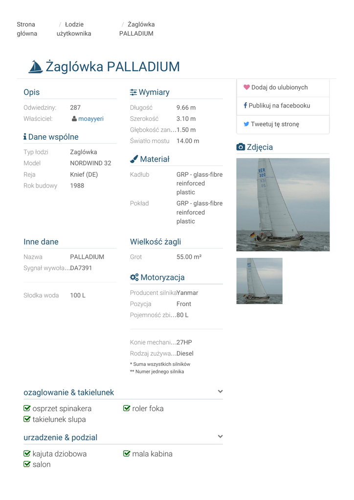 Strona główna / Łodzie użytkownika / Żaglówka PALLADIUM Żaglówka PALLADIUM Opis Dodaj do ulubionych Wymiary Odwiedziny: 287 Długość 9.66 m Właściciel: moayyeri Szerokość 3.10 m Dane wspólne Typ łodzi Zaglówka Model NORDWIND 32 Reja Knief (DE) Rok budowy 1988 Inne dane Nazwa Publikuj na facebooku Tweetuj tę stronę Głębokość zan…1.50 m Światło mostu 14.00 m Zdjęcia Materiał Kadłub GRP - glass-fibre reinforced plastic Pokład GRP - glass-fibre reinforced plastic Wielkość żagli PALLADIUM Grot 55.00 m² Sygnał wywoła…DA7391 Motoryzacja Słodka woda 100 L Producent silnikaYanmar Pozycja Front Pojemność zbi…80 L Konie mechani…27HP Rodzaj zużywa…Diesel * Suma wszystkich silników ** Numer jednego silnika ozaglowanie & takielunek osprzet spinakera takielunek slupa roler foka urzadzenie & podzial kajuta dziobowa salon mala kabina kuchnia kuchenka elektryczna lodówka gazowa kuchenka olejowa zmywarka instrumentarium nautyczne echosonda Instrumentarium nautyczne kompas ploter do map samoster telefon pokladowy komputer pokladowy radionadajnik UKF sumlog wiatromierz plandeki & pokrowce markiza plandeka portowa plandeka na kokpit sprayhood wyposazenie akumulator baterie sloneczne do ladowania akumulatora glówny wlacznik do akumulatora kotwica kotwica z lancuchem ladowarka do akumulatora Podkładka pompy most pompa odpompowujaca skrzynia kotwiczna szperacz winda kotwiczna (ręcznie) osprzet chlodziarka drabinka kapielowa dywan w kokpicie gasnica kosz na dziobie kosz na rufie kosz na rufie ze stali nierdzewnej lacznie z przyczepa bez hamulców obicia na poduszki z tkaniny odtwarzacz CD ogrzewanie cieplym powietrzem podwodna powloka malarska pompa zenzowa pompa zenzowa mechaniczna radio reling pokladowy stalowy kosz na rufie stól w kokpicie stól w kokpicie z poduszkami do siedzenia urzadzenie hydrauliczne Lokalizacja Leaflet cy Go rą cy rą Go Go rą cy Podobne łodzie ORTEGA Blaubär Rinel frank.sch… PHÖNIX phoenixse… AkvaSprint