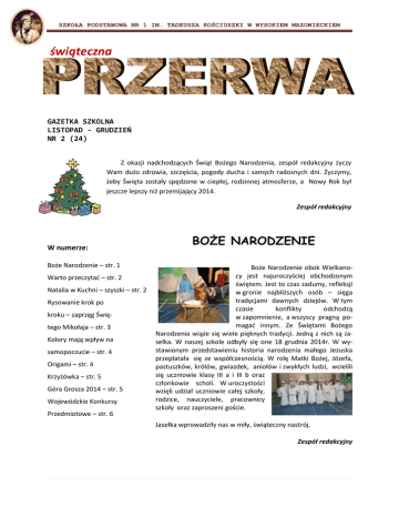 SZKOŁA PODSTAWOWA NR 1 IM. TADEUSZA KOŚCIUSZKI W WYSOKIEM MAZOWIECKIEM świąteczna GAZETKA SZKOLNA LISTOPAD - GRUDZIEŃ NR 2 (24) Z okazji nadchodzących Świąt Bożego Narodzenia, zespół redakcyjny życzy Wam dużo zdrowia, szczęścia, pogody ducha i samych radosnych dni. Życzymy, żeby Święta zostały spędzone w ciepłej, rodzinnej atmosferze, a Nowy Rok był jeszcze lepszy niż przemijający 2014. Zespół redakcyjny W numerze: Boże Narodzenie – str. 1 Warto przeczytać – str. 2 Natalia w Kuchni – szyszki – str. 2 Rysowanie krok po kroku – zaprzęg Świętego Mikołaja – str. 3 Kolory mają wpływ na samopoczucie – str. 4 Origami – str. 4 Krzyżówka – str. 5 Góra Grosza 2014 – str. 5 Wojewódzkie Konkursy Przedmiotowe – str. 6 BOŻE NARODZENIE Boże Narodzenie obok Wielkanocy jest najuroczyściej obchodzonym świętem. Jest to czas zadumy, refleksji w gronie najbliższych osób – sięga tradycjami dawnych dziejów. W tym czasie konflikty odchodzą w zapomnienie, a wszyscy pragną pomagać innym. Ze Świętami Bożego Narodzenia wiąże się wiele pięknych tradycji. Jedną z nich są Jasełka. W naszej szkole odbyły się one 18 grudnia 2014r. W wystawionym przedstawieniu historia narodzenia małego Jezuska przeplatała się ze współczesnością. W rolę Matki Bożej, Józefa, pastuszków, królów, gwiazdek, aniołów i zwykłych ludzi, wcielili się uczniowie klasy III a i III b oraz członkowie scholi. W uroczystości wzięli udział uczniowie całej szkoły, rodzice, nauczyciele, pracownicy szkoły oraz zaproszeni goście. Jasełka wprowadziły nas w miły, świąteczny nastrój. Zespół redakcyjny SZKOŁA PODSTAWOWA NR 1 IM. TADEUSZA KOŚCIUSZKI W WYSOKIEM MAZOWIECKIEM PRZERWA – GAZETKA SZKOLNA NR 2 (24) WARTO PRZECZYTAĆ LUB PODAROWAĆ JAKO PREZENT Książka pt. „Gwiazd Naszych Wina”, to świetna lektura dla młodzieży, jak i dorosłych. Opowiada o losach młodej Hazel, która niestety jest chora na nowotwór. Choroba jest bardzo zaawansowana. Hazel ma już przerzuty do płuc, w związku z tym, musi nosić ze sobą butlę z tlenem (którą ochrzciła imieniem Philip). Dziewczyna nie żyje jak normalne nastolatki w jej wieku. Nie chodzi do szkoły, nie ma przyjaciół. Jej matka myśli, że Hazel ma depresję, więc wysyła ją na spotkania grupy wsparcia, gdzie poznaje charyzmatycznego Augusta i wtedy życie dziewczyny zmienia się diametralnie… Książka skłania do głębokiej refleksji na temat życia i śmierci, choroby i zdrowia, a przede wszystkim jest napisana z wielkim humorem, zupełnie inaczej niż książki o tej samej tematyce. Hanna Zagroba kl. VI a NATALIA W KUCHNI Przepis na szyszki ryżowe, które zawsze się udają! Składniki: 2 łyżki masła 290 g cukierków krówek 60 g ryżu preparowanego Sposób przygotowania: Na ogniu roztopić masło z cukierkami, energicznie mieszając. Dodać ryż i dalej mieszać. Odstawić do lekkiego wystygnięcia, następnie wziąć w ręce i formować owalne szyszki. RADA: Żeby nic się nie kleiło, należy moczyć co jakiś czas ręce w zimnej wodzie. Szyszki wychodzą przepyszne, idealne na świąteczny stół. Smacznego! Natalia Sokołowska kl. VI a 2|Strona SZKOŁA PODSTAWOWA NR 1 IM. TADEUSZA KOŚCIUSZKI W WYSOKIEM MAZOWIECKIEM PRZERWA – GAZETKA SZKOLNA NR 2 (24) RYSOWANIE KROK PO KROKU Zaprzęg Świętego Mikołaja 1. Szkicujemy sanie oraz zarys renifera. 2. W burcie sań rysujemy półkole. Szkicujemy św. Mikołaja oraz głowę i nogi renifera 3. Reniferowi rysujemy piękne poroże. Mikołajowi dorysowujemy rękę i czapkę, a z tyłu na płozach sań- worek. 4. Kończymy łeb renifera i głowę Mikołaja. Rysujemy lejce i związany koniec worka. Natalia Sokołowska kl. VI a ANDRZEJKI W NASZEJ SZKOLE Dnia 27. listopada 2014 roku w naszej szkole odbyła się dyskoteka andrzejkowa zorganizowana przez samorząd uczniowski. Na zabawę, przybyło wielu uczniów, kilku nawet przebranych. Samorząd z pomocą nauczycieli przygotował konkursy z nagrodami i wróżby. Można było zakupić słodkości i napoje, w większości samodzielnie zrobione przez uczniów. Wszyscy świetnie się bawili. Mamy nadzieję, że w przyszłości odbędzie się jeszcze więcej takich zabaw. Zespół redakcyjny 3|Strona SZKOŁA PODSTAWOWA NR 1 IM. TADEUSZA KOŚCIUSZKI W WYSOKIEM MAZOWIECKIEM PRZERWA – GAZETKA SZKOLNA NR 2 (24) KOLORY MAJĄ WPŁYW NA SAMOPOCZUCIE Kolory potrafią odgrywać ważną rolę w życiu człowieka. Wpływają one na nasze samopoczucie. Mogą one działać na nas pozytywnie, jak również i negatywnie. Warto znać znaczenie poszczególnych kolorów. Czerwony – kolor, który wywołuje agresję, ale jednocześnie zwiększa pewność siebie. Żółty – sprzyja pracy umysłowej i pobudza naszą pamięć. Zielony – zwalcza stres i działa relaksująco. Niebieski - sprzyja w podejmowaniu trudnych decyzji i korzystnie wpływa na układ nerwowy. Fioletowy - wskazany dla pragnących zgody i miłości, ciszy i spokoju. Martyna Maliba kl. VI a ORIGAMI Święty Mikołaj Sprawdź, czy potrafisz! Zespół redakcyjny 4|Strona SZKOŁA PODSTAWOWA NR 1 IM. TADEUSZA KOŚCIUSZKI W WYSOKIEM MAZOWIECKIEM PRZERWA – GAZETKA SZKOLNA NR 2 (24) KRZYŻÓWKA 1. Przyprawa, która kojarzy się z Bożym Narodzeniem to… 2. Merry… 3. Co wieszamy na choince? 4. Kto zakłada czerwone ubranie? 5. Ciągną sanie Mikołaja. 6. Przez co do domu wchodzi mikołaj? 7. Co dostajemy pod choinkę? Martyna Maliba kl. VI a GÓRA GROSZA 2014 „Jeden grosz znaczy niewiele, ale góra grosza jest największa na świecie.” W dniach 24.11.2014r. – 05.12.2014r. jak co roku przyłączyliśmy się do akcji charytatywnej GÓRA GROSZA. To już XV edycja. Akcję w naszej szkole prowadził Samorząd Uczniowski. Celem akcji było zebranie funduszy na pomoc dzieciom wychowującym się poza własną rodziną, w tym na tworzenie i dofinansowanie domów dla dzieci, rodzinnych domów dziecka, pogotowi rodzinnych, zawodowyc