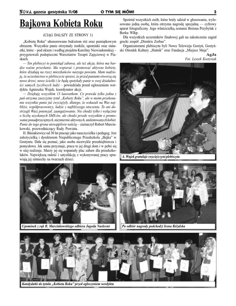 NOWA gazeta gostyñska 11/08 O TYM SIÊ MÓWI Bajkowa Kobieta Roku (CI¥G DALSZY ZE STRONY 1) Kobietê Roku uhonorowano bukietem ró¿ oraz pami¹tkowym obrazem. Wszystkie panie otrzyma³y ¿onkile, upominki oraz statuetki, które pod okiem i wed³ug projektu Karoliny Niewiadomskiej przygotowali podopieczni Warsztatów Terapii Zajêciowej w Piaskach. Ten plebiscyt to poniek¹d zabawa, ale te¿ akcja, która ma bardzo wa¿ne przes³anie. Ma wspieraæ i promowaæ aktywne kobiety, które dzia³aj¹ na rzecz mieszkañców naszego powiatu. Mam nadziejê, ¿e uczestnictwo w plebiscycie sprawi, ¿e przed paniami otworz¹ siê nowe drzwi, nowe cie¿ki i ¿e bêd¹ spotyka³y panie w swej dzia³alnoci samych ¿yczliwych ludzi powiedzia³a przed og³oszeniem werdyktu Agnieszka Wujek, koordynator akcji. Dziêkujê wszystkim 13 laureatkom. Co prawda tylko jedna z pañ otrzyma zaszczytny tytu³ Kobiety Roku, ale w moim przekonaniu wszystkie panie ju¿ zwyciê¿y³y, dlatego, ¿e wskazali na Was najbli¿si, wspó³pracownicy, ludzie z najbli¿szego otoczenia. To oni dostrzegli Wasz potencja³, zaanga¿owanie. Nie chodzi tylko i wy³¹cznie o liczbê uzyskanych SMS-ów, ale chodzi przede wszystkim o promowanie ponadprzeciêtnych, niezmiernie aktywnych, utalentowanych kobiet. Panie do tego grona niew¹tpliwie nale¿¹ zaznaczy³ Robert Marcinkowski, przewodnicz¹cy Rady Powiatu. H. Biniakiewicz od 30 lat pracuje jako nauczycielka i pedagog. Jest za³o¿ycielk¹ i dyrektorem Niepublicznego Przedszkola Bajka w Gostyniu. Da³a siê poznaæ, jako osoba niezwykle przedsiêbiorcza i pomys³owa. Jak sama przyznaje, praca to jej drugi dom i w pe³ni siê w niej realizuje. Marzy jej siê wspania³y plac zabaw dla przedszkolaków. Najwiêksz¹ radoæ i satysfakcjê z wykonywanej pracy sprawiaj¹ jej umiechy na twarzach dzieci. Upominek z r¹k R. Marcinkowskiego odbiera Jagoda Naskrent Kandydatki do tytu³u Kobieta Roku przed og³oszeniem werdyktu 3 Sporód wszystkich osób, które bra³y udzia³ w g³osowaniu, wylosowano jedn¹ osobê, która otrzyma nagrodê specjaln¹ cyfrowy aparat fotograficzny. Jego w³acicielk¹ zostanie Bo¿ena Przybylak z Borku Wlkp. Dla wszystkich uczestników fina³owej gali na zakoñczenie zagra³ grecki zespó³ Dimitris Zorbas. Organizatorami plebiscytu byli Nowa Telewizja Gostyñ, Gostyñski Orodek Kultury Hutnik oraz Fundacja Miejsce Moje. AgJa Fot. Leszek Kostysiak A. Wujek gratuluje zwyciê¿czyni plebiscytu Po odbiór nagrody podchodzi Irena Ró¿alska