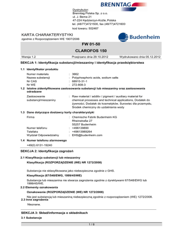 Dystrybutor: Brenntag Polska Sp. z o.o. ul. J. Bema 21 47-224 Kędzierzyn-Koźle, Polska tel. (48/77)4721500, fax (48/77)4721600 kod towaru: 502467 KARTA CHARAKTERYSTYKI zgodnie z Rozporządzeniem WE 1907/2006 FW 01-50 CLAROFOS 150 Wersja 1.2 Przejrzano dnia 29.10.2012 Wydrukowano dnia 05.12.2012 SEKCJA 1: Identyfikacja substancji/mieszaniny i identyfikacja przedsiębiorstwa 1.1 Identyfikator produktu Numer materiału : 3662 Nazwa substancji : Polyphosphoric acids, sodium salts Nr CAS : 68915-31-1 Nr WE : 272-808-3 1.2 Istotne zidentyfikowane zastosowania substancji lub mieszaniny oraz zastosowania odradzane Zastosowanie substancji/mieszaniny : Raw material / additiv / pigment / auxiliary material for chemical processes and technical applications, Dodatek do żywności, Dodatek do kosmetyków, Surowiec dla przemysłu, Środek chemiczny do uzdatniania wody 1.3 Dane dotyczące dostawcy karty charakterystyki Firma Numer telefonu Telefaks Wydział Odpowiedzialny : Chemische Fabrik Budenheim KG Rheinstraße 27 55257 Budenheim : +496139890 : +49613989264 : [email protected] 1.4 Numer telefonu alarmowego +49(0) 6131-19240 SEKCJA 2: Identyfikacja zagrożeń 2.1 Klasyfikacja substancji lub mieszaniny Klasyfikacja (ROZPORZĄDZENIE (WE) NR 1272/2008) Substancja nie sklasyfikowana jako niebezpieczna zgodnie z GHS. Klasyfikacja (67/548/EWG, 1999/45/WE) Substancja lub mieszanina nie stwarza zagrożenia zgodnie z dyrektywami 67/548/EWG lub 1999/45/WE. 2.2 Elementy oznakowania Oznakowanie (ROZPORZĄDZENIE (WE) NR 1272/2008) Nie jest substancją lub mieszaniną niebezpieczną zgodnie z rozporządzeniem (WE) 1272/2008. 2.3 Inne zagrożenia Nieznane. SEKCJA 3: Skład/informacja o składnikach 3.1 Substancje 1/8 KARTA CHARAKTERYSTYKI zgodnie z Rozporządzeniem WE 1907/2006 FW 01-50 CLAROFOS 150 Wersja 1.2 Uwagi Przejrzano dnia 29.10.2012 : Wydrukowano dnia 05.12.2012 Brak składników niebezpiecznych zgodnie z Rozporządzeniem (WE) Nr 1907/2006. SEKCJA 4: Środki pierwszej pomocy 4.1 Opis środków pierwszej pomocy Porady ogólne : Brak zagrożeń wymagających specjalistycznej pierwszej pomocy. W przypadku wdychania : Jeżeli osoba poszkodowana oddycha, przenieść na świeże powietrze. W przypadku kontaktu ze skórą : Natychmiast zdjąć skażone obuwie i ubranie. Zmyć mydłem i dużą ilością wody. W przypadku kontaktu z oczami W przypadku połknięcia : Niezwłocznie przemyć oczy dużą ilością wody. : Wypłukać usta wodą. 4.2 Najważniejsze ostre i opóźnione objawy oraz skutki narażenia Nieznane. 4.3 Wskazania dotyczące wszelkiej natychmiastowej pomocy lekarskiej i szczególnego postępowania z poszkodowanym Dla uzyskania specjalistycznej porady lekarze powinni skontaktować się z Centrum Informacji o Zatruciach. SEKCJA 5: Postępowanie w przypadku pożaru 5.1 Środki gaśnicze Odpowiednie środki gaśnicze : Użycie środków gaśniczych odpowiednich dla lokalnych warunków i dla środowiska. 5.2 Szczególne zagrożenia związane z substancją lub mieszaniną Specyficzne zagrożenia w czasie zwalczania pożaru : Nie dopuścić do przedostania się wody z gaszenia pożaru do sieci wodnej lub kanalizacji. 5.3 Informacje dla straży pożarnej Specjalny sprzęt ochronny dla strażaków : W razie pożaru, założyć aparat oddechowy z zamkniętym obiegiem powietrza. Dalsze informacje : Zebrać oddzielnie zanieczyszczoną wodę gaśniczą. Nie można jej usuwać do kanalizacji. Pozostałości po pożarze i zanieczyszczona woda gaśnicza muszą być usunięte zgodnie z lokalnymi przepisami. 2/8 KARTA CHARAKTERYSTYKI zgodnie z Rozporządzeniem WE 1907/2006 FW 01-50 CLAROFOS 150 Wersja 1.2 Przejrzano dnia 29.10.2012 Wydrukowano dnia 05.12.2012 SEKCJA 6: Postępowanie w przypadku niezamierzonego uwolnienia do środowiska 6.1 Indywidualne środki ostrożności, wyposażenie ochronne i procedury w sytuacjach awaryjnych Indywidualne środki : Unikać tworzenia się pyłu. ostrożności 6.2 Środki ostrożności w zakresie ochrony środowiska Środki ostrożności w : Nie wylewać do wód powierzchniowych i kanalizacji. zakresie ochrony środowiska 6.3 Metody i materiały zapobiegające rozprzestrzenianiu się skażenia i służące do usuwania skażenia Metody oczyszczania : Użyj sprzętu mechanicznego. Przechować w odpowiednich, zamkniętych pojemnikach do czasu usunięcia. 6.4 Odniesienia do innych sekcji Środki ochrony osobistej: patrz w sekcji 8. Postępować z odzyskanym materiałem w sposób opisany w sekcji "Postępowanie z odpadami". Sprawdź w sekcji 15 specyficzne uregulowania krajowe. SEKCJA 7: Postępowanie z substancjami i mieszaninami oraz ich magazynowanie 7.1 Środki ostrożności dotyczące bezpiecznego postępowania Wskazówki dotyczące bezpiecznego posługiwania się Wytyczne ochrony przeciwpożarowej : Brak specjalnych wskazówek przy stosowaniu. : Normalne środki ochrony przeciwpożarowej. 7.2 Warunki bezpiecznego magazynowania, łącznie z informacjami dotyczącymi wszelkich wzajemnych niezgodności Wymagania względem pomieszczeń i pojemników magazynowych Wytyczne składowania : Przechowywać pojemnik dokładnie zamknięty w suchym i dobrze wentylowanym miejscu. : Brak specjalnych ograniczeń dla przechowywania z innymi produktami. 7.3 Szczególne zastosowanie(-a) końcowe Dalsze informacje znajdują się w karcie danych technicznych produktu. SEKCJA 8: Kontrola narażenia/środki ochrony indywidualnej 8.1 Parametry dotyczące kontroli Nie zawiera substancji mających wartości stężeń dopuszczalnych w środowisku pracy. 3/8 KARTA CHARAKTERYSTYKI zgodnie z Rozporządzeniem WE 1907/2006 FW 01-50 CLAROFOS 150 Wersja 1.2 Przejrzano dnia 29.10.2012 Wydrukowano dnia 05.12.2012 8.2 Kontrola narażenia Sprzęt ochrony osobistej Ochronę dróg oddechowych : W warunkach normalnych nie jest wymagany osobisty sprzęt do oddychania. W przypadku niedostatecznej wentylacji stosować odpowiednie indywidualne środki ochrony dróg oddechowych. Ochronę rąk : Rękawice ochronne Ochro