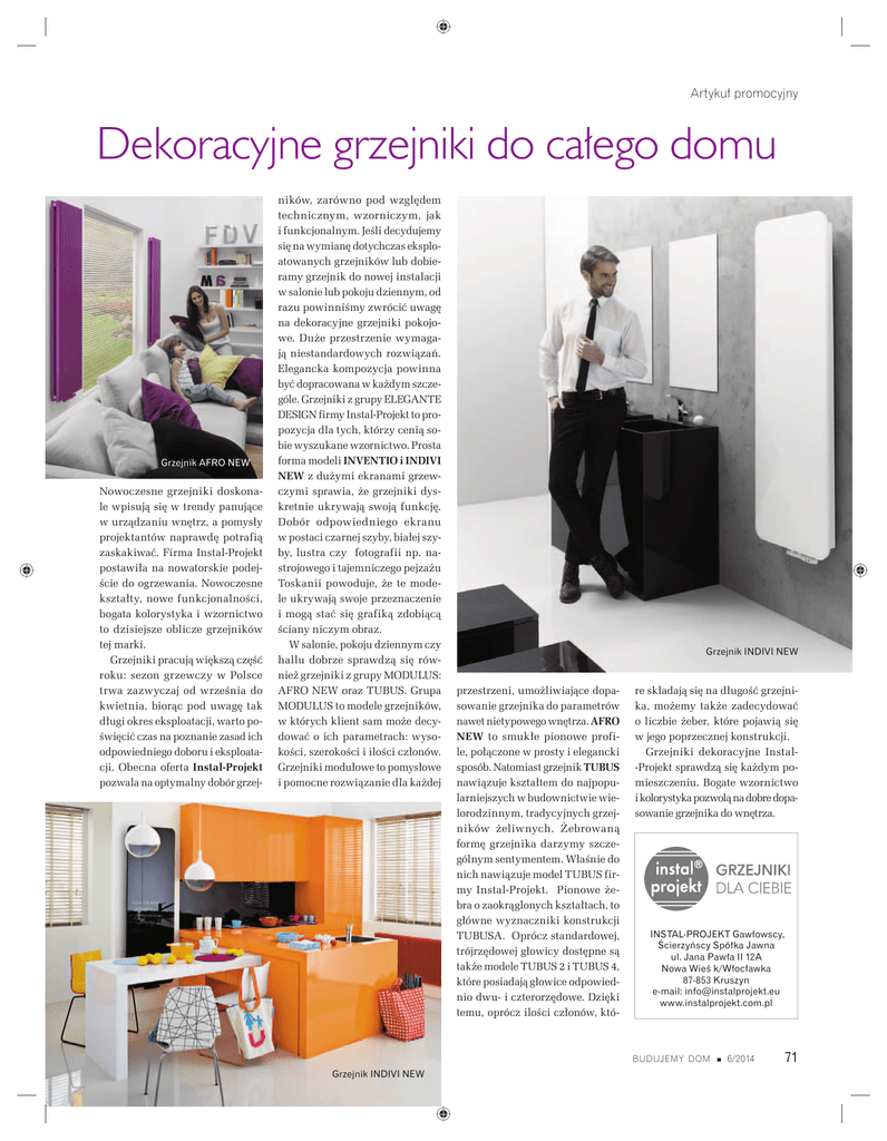 Artykuł promocyjny Dekoracyjne grzejniki do całego domu Grzejnik AFRO NEW Nowoczesne grzejniki doskonale wpisują się w trendy panujące w urządzaniu wnętrz, a pomysły projektantów naprawdę potrafią zaskakiwać. Firma Instal-Projekt postawiła na nowatorskie podejście do ogrzewania. Nowoczesne kształty, nowe funkcjonalności, bogata kolorystyka i wzornictwo to dzisiejsze oblicze grzejników tej marki. Grzejniki pracują większą część roku: sezon grzewczy w Polsce trwa zazwyczaj od września do kwietnia, biorąc pod uwagę tak długi okres eksploatacji, warto poświęcić czas na poznanie zasad ich odpowiedniego doboru i eksploatacji. Obecna oferta Instal-Projekt pozwala na optymalny dobór grzej- ników, zarówno pod względem technicznym, wzorniczym, jak i funkcjonalnym. Jeśli decydujemy się na wymianę dotychczas eksploatowanych grzejników lub dobieramy grzejnik do nowej instalacji w salonie lub pokoju dziennym, od razu powinniśmy zwrócić uwagę na dekoracyjne grzejniki pokojowe. Duże przestrzenie wymagają niestandardowych rozwiązań. Elegancka kompozycja powinna być dopracowana w każdym szczególe. Grzejniki z grupy ELEGANTE DESIGN firmy Instal-Projekt to propozycja dla tych, którzy cenią sobie wyszukane wzornictwo. Prosta forma modeli INVENTIO i INDIVI NEW z dużymi ekranami grzewczymi sprawia, że grzejniki dyskretnie ukrywają swoją funkcję. Dobór odpowiedniego ekranu w postaci czarnej szyby, białej szyby, lustra czy fotografii np. nastrojowego i tajemniczego pejzażu Toskanii powoduje, że te modele ukrywają swoje przeznaczenie i mogą stać się grafiką zdobiącą ściany niczym obraz. W salonie, pokoju dziennym czy hallu dobrze sprawdzą się również grzejniki z grupy MODULUS: AFRO NEW oraz TUBUS. Grupa MODULUS to modele grzejników, w których klient sam może decydować o ich parametrach: wysokości, szerokości i ilości członów. Grzejniki modułowe to pomysłowe i pomocne rozwiązanie dla każdej Grzejnik INDIVI NEW przestrzeni, umożliwiające dopasowanie grzejnika do parametrów nawet nietypowego wnętrza. AFRO NEW to smukłe pionowe profile, połączone w prosty i elegancki sposób. Natomiast grzejnik TUBUS nawiązuje kształtem do najpopularniejszych w budownictwie wielorodzinnym, tradycyjnych grzejników żeliwnych. Żebrowaną formę grzejnika darzymy szczególnym sentymentem. Właśnie do nich nawiązuje model TUBUS firmy Instal-Projekt. Pionowe żebra o zaokrąglonych kształtach, to główne wyznaczniki konstrukcji TUBUSA. Oprócz standardowej, trójrzędowej głowicy dostępne są także modele TUBUS 2 i TUBUS 4, które posiadają głowice odpowiednio dwu- i czterorzędowe. Dzięki temu, oprócz ilości członów, któ- re składają się na długość grzejnika, możemy także zadecydować o liczbie żeber, które pojawią się w jego poprzecznej konstrukcji. Grzejniki dekoracyjne Instal-Projekt sprawdzą się każdym pomieszczeniu. Bogate wzornictwo i kolorystyka pozwolą na dobre dopasowanie grzejnika do wnętrza. INSTAL-PROJEKT Gawłowscy, Ścierzyńscy Spółka Jawna ul. Jana Pawła II 12A Nowa Wieś k/Włocławka 87-853 Kruszyn e-mail: [email protected] www.instalprojekt.com.pl BUDUJEMY DOM Grzejnik INDIVI NEW 6/2014 71