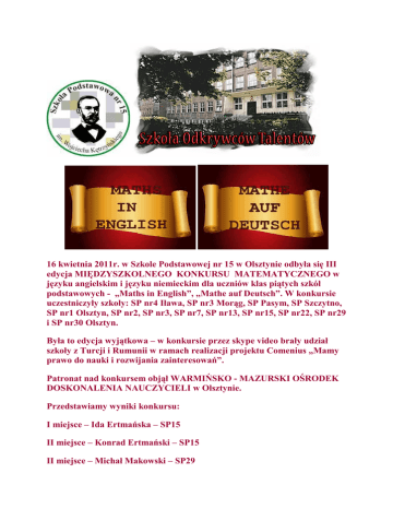 16 kwietnia 2011r. w Szkole Podstawowej nr 15 w Olsztynie odbyła się III edycja MIĘDZYSZKOLNEGO KONKURSU MATEMATYCZNEGO w języku angielskim i języku niemieckim dla uczniów klas piątych szkół podstawowych - „Maths in English”, „Mathe auf Deutsch”. W konkursie uczestniczyły szkoły: SP nr4 Iława, SP nr3 Morąg, SP Pasym, SP Szczytno, SP nr1 Olsztyn, SP nr2, SP nr3, SP nr7, SP nr13, SP nr15, SP nr22, SP nr29 i SP nr30 Olsztyn. Była to edycja wyjątkowa – w konkursie przez skype video brały udział szkoły z Turcji i Rumunii w ramach realizacji projektu Comenius „Mamy prawo do nauki i rozwijania zainteresowań”. Patronat nad konkursem objął WARMIŃSKO - MAZURSKI OŚRODEK DOSKONALENIA NAUCZYCIELI w Olsztynie. Przedstawiamy wyniki konkursu: I miejsce – Ida Ertmańska – SP15 II miejsce – Konrad Ertmański – SP15 II miejsce – Michał Makowski – SP29 III miejsce – Marcin Łaguna – SP29 Wyróżnienia: - Aleksandra Jonowska – SP4 Iława - Paulina Lizińska – SP29 - Dominika Rząp – SP15 Zwycięzcom oraz wszystkim uczestnikom serdecznie gratulujemy i zapraszamy za rok.
