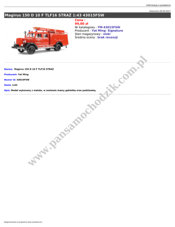 Informacje o produkcie Utworzono 09-03-2017 Magirus 150 D 10 F TLF16 STRAŻ 1:43 43015FSW Cena : 99,00 zł .p l Nr katalogowy : YM-43015FSW Producent : Yat Ming- Signature Stan magazynowy : niski Średnia ocena : brak recenzji om Nazwa: Magirus 150 D 10 F TLF16 STRAŻ Producent: Yat Ming .c Numer id: 43015FSW dz ik Skala: 1/43 w w w .p an sa m oc ho Opis: Model wykonany z metalu, w zestawie mamy gablotkę oraz podstawkę, Wygenerowano w programie www.oscGold.com