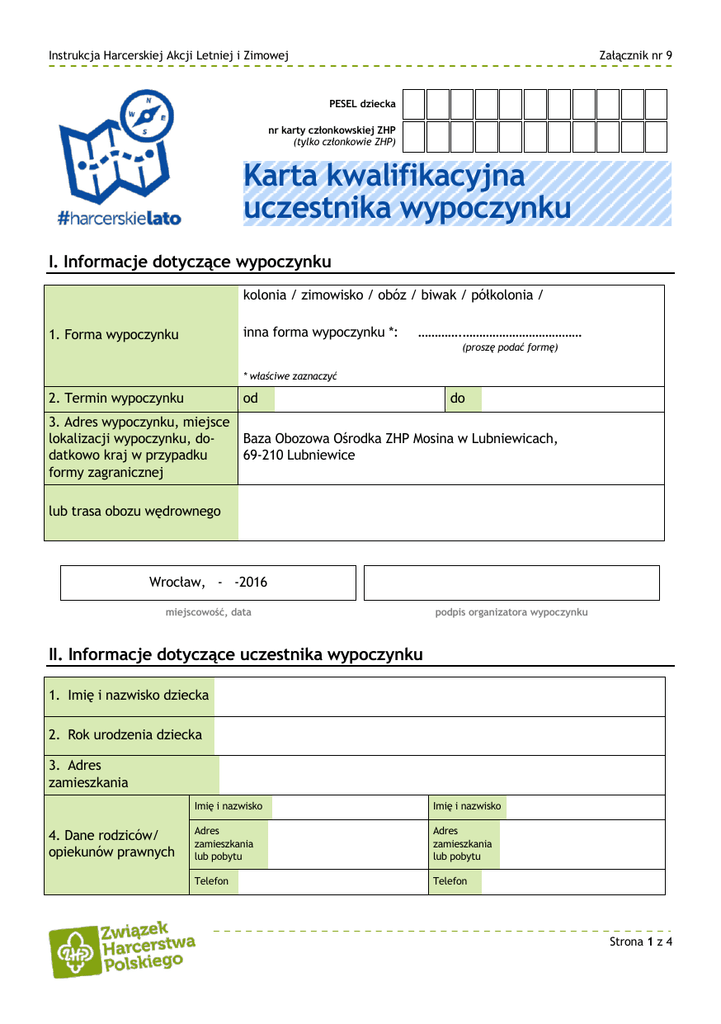 Instrukcja Harcerskiej Akcji Letniej i Zimowej Załącznik nr 9 PESEL dziecka nr karty członkowskiej ZHP (tylko członkowie ZHP) Karta kwalifikacyjna uczestnika wypoczynku I. Informacje dotyczące wypoczynku kolonia / zimowisko / obóz / biwak / półkolonia / inna forma wypoczynku *: 1. Forma wypoczynku ………….……………………………… (proszę podać formę) * właściwe zaznaczyć 2. Termin wypoczynku od do 3. Adres wypoczynku, miejsce lokalizacji wypoczynku, doBaza Obozowa Ośrodka ZHP Mosina w Lubniewicach, datkowo kraj w przypadku 69-210 Lubniewice formy zagranicznej lub trasa obozu wędrownego Wrocław, - -2016 miejscowość, data podpis organizatora wypoczynku II. Informacje dotyczące uczestnika wypoczynku 1. Imię i nazwisko dziecka 2. Rok urodzenia dziecka 3. Adres zamieszkania 4. Dane rodziców/ opiekunów prawnych Imię i nazwisko Imię i nazwisko Adres zamieszkania lub pobytu Adres zamieszkania lub pobytu Telefon Telefon Strona 1 z 4 Karta kwalifikacyjna uczestnika wypoczynku 5. Informacja o specjalnych potrzebach edukacyjnych uczestnika wypoczynku, w szczególności o potrzebach wynikających z niepełnosprawności, niedostosowania społecznego lub zagrożenia niedostosowaniem społecznym Istotne dane o stanie zdrowia uczestnika wypoczynku, rozwoju psychofizycznym i stosowanej diecie (np. na co uczestnik jest uczulony, jak znosi jazdę samochodem, czy przyjmuje stale leki i w jakich dawkach, czy nosi aparat ortodontyczny lub okulary) Czy dziecko ma uczulenia/alergie? nie tak, podaj jakie: Jak dziecko znosi jazdę samochodem? dobrze źle Czy dziecko nosi okulary/szkła kontaktowe? nie tak Czy dziecko przed wyjazdem było na przeglądzie u stomatologa? nie tak Czy dziecko przyjmuje stale leki? nie tak (podaj poniżej, jakie i w jakich dawkach) Czy istnieją przeciwwskazania do uczestniczenia przez dziecko w zajęciach sportowych/ ASG/na wodzie? nie tak (opisz poniżej) Podaj pozostałe informacje: (niepotrzebne skreślić) o szczepieniach ochronnych (wraz z podaniem roku lub przedstawienie książeczki zdrowia z aktualnym wpisem szczepień) Szczepienia ochronne (podać rok) tężec błonica dur inne (jakie?) Zobowiązuję się do uiszczenia kosztów pobytu dziecka w wysokości słownie: zł, . Stwierdzam, że podałam(-em) wszystkie znane mi informacje o dziecku, które mogą pomóc w zapewnieniu właściwej opieki w czasie pobytu dziecka na formie wypoczynku. Jeśli moje dziecko przyjmuje leki, informuję, że jako rodzic/opiekun wyposażam dziecko w odpowiednie leki w ilości niezbędnej do podania podczas trwania całego wypoczynku. W razie zagrożenia życia dziecka zgadzam się na jego leczenie szpitalne, zabiegi diagnostyczne, operacje. Wyrażam zgodę na przetwarzanie danych osobowych zawartych w karcie kwalifikacyjnej, dla potrzeb niezbędnych do zapewnienia bezpieczeństwa i ochrony zdrowia uczestnika wypoczynku (zgodnie z ustawą z dnia 29 sierpnia 1997 r. o ochronie danych osobowych (Dz. U. z 2015 r. poz. 2135, z późn. zm.). Strona 2 z 4 Karta kwalifikacyjna uczestnika wypoczynku Wyrażam zgodę na użycie wizerunku mojego dziecka do celów statutowych Związku Harcerstwa Polskiego i w konsekwencji powyższego wyrażam zgodę na: 1) fotografowanie mojego dziecka; 2) rejestrowanie audiowizualne wszystkich działań związanych z działalnością statutową Związku Harcerstwa Polskiego, także tych, w których uczestniczyć będzie moje dziecko; 3) użycie wizerunku mojego dziecka, w związku z działalnością statutową prowadzoną przez Związek Harcerstwa Polskiego, na wszystkich polach eksploatacji wymienionych w art. 50 Ustawy z dnia 4 lutego 1994 r. o prawie autorskim i prawach pokrewnych (tekst jednolity: Dz. U. 2006, nr 90, poz. 631 ze zmianami), bez ograniczeń co do czasu i ilości. Oświadczam, że znam i akceptuję warunki uczestnictwa mojego dziecka i są one dla mnie zrozumiałe. miejscowość, data podpisy rodziców / opiekunów prawnych / podpis pełnoletniego uczestnika wypoczynku III. Decyzja organizatora wypoczynku o zakwalifikowaniu uczestnika wypoczynku do udziału w wypoczynku Postanawia się: 1. Zakwalifikować i skierować dziecko na wypoczynek 2. Odmówić skierowania dziecka na wypoczynku ze względu: . Wrocław, - -2016 miejscowość, data podpis IV. Potwierdzenie przez kierownika wypoczynku pobytu uczestnika wypoczynku w miejscu wypoczynku Uczestnik przebywał na (forma i adres miejsca wypoczynku) od dnia do dnia miejscowość, data czytelny podpis kierownika wypoczynku Strona 3 z 4 Karta kwalifikacyjna uczestnika wypoczynku V. Informacja kierownika wypoczynku o stanie zdrowia uczestnika wypoczynku w czasie trwania wypoczynku oraz chorobach przebytych w jego trakcie dane o zachorowaniach, urazach, leczeniu itp. miejscowość, data podpis kierownika wypoczynku VI. Uwagi i spostrzeżenia wychowawcy-instruktora o dziecku podczas trwania wypoczynku miejscowość, data podpis wychowawcy-instruktora Strona 4 z 4