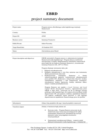 EBRD project summary document Project name: Program ramowy dla dłużnego rynku kapitałowego instytucji finansowych Country: Polska Project ID: 45949 Business sector: Instytucje Finansowe Public/Private: Sektor Prywatny Target Board date: 10 Grudzień 2013 Status: Zatwierdzone przez Board Project description and objectives: EBOiR zatwierdził „Program ramowy w odniesieniu do instytucji finansowych rynku kapitałowego”. Program dotyczy możliwości inwestowania w średnie i długoterminowe instrumenty emitowanych przez banki lub nie bankowe instytucje finansowe („ uczestniczące instytucje finansowe lub „UIF”) w Polsce: Program obejmuje instrumenty takie, jak: 1. 2. 3. Obligacje niezabezpieczone Obligacje zabezpieczone w tym listy zastawne oraz instrumenty dłużne gwarantowane aktywami Strukturyzowane instrumenty finansowe w formie sekurtytyzacyjnych papierów wartościowych zabezpieczonych przez portfele UIF, zbudowane z różnych klas aktywów: kredyty samochodowe, należności z kart kredytowych, leasingowe, mieszkaniowe kredyty hipoteczne, kredyty udzielone mikro, małym i średnim przedsiębiorstwom. Program Ramowy jest zgodny z Local Currency and Local Capital Market Development Initiative, zaprezentowanej przez EBOR w maju 2010, i przyczyni się do (i) dalszego rozwoju polskiego rynku kapitałowego, (ii) wsparcia dywersyfikacji źródeł finansowania UIF, (iii) poprawy struktury zapadalności bilansów UFI poprzez wydłużenie tenoru pasywów w celu lepszego dopasowania do zapadalności finansowanego przez nie portfela. Sub-projects: Zobacz listę projektów dla tego i innych projektów ramowych Transition impact: Zmiany w businessie będą zależne od: Rozwoju rynku – Program Ramowy przyczyni się do zbudowania masy krytycznej pozostających do spłaty instrumentów finansowych, potrzebnych do rozwoju płynności rynku i przyciągnięcia inwestorów instytucjonalnych Demonstracji restrukturyzacji bilansu – wsparcie emisji dłużnych instrumentów rynku kapitałowego, w lokalnej lub One Exchange Square, London EC2A 2JN, United Kingdom Tel: +44 20 7338 6000 Fax: +44 20 7338 6100 http://www.ebrd.com zagranicznej walucie, umożliwi emitentom (UFI) zdywersyfikowanie źródeł finansowania i zmniejszenie niedopasowania aktywów i pasywów Demonstracji nowej formy finansowania - wprowadzenie strukturyzowanych produktów finansowych zwiększy ich interakcje z uczestnikami rynku i przyczyni się do rozprzestrzenienia właściwej wiedzy i umiejętności w Polskim środowisku inwestycyjnym oraz przyczyni się do ustanowienia wymaganej infrastruktury potrzebnej do obsługi takich instrumentów. Demonstracji standardów – wejście na rynek obligacji i rynek instrumentów strukturyzowanych będzie wymagać od emitentów spełnienia wysokich standardów transparentności i raportowania oraz zademonstruje jak polscy emitenci mogą zaadoptować takie standardy. The client: Program Ramowy będzie dostępny dla banków komercyjnych i nie bankowych instytucji finansowych ( uczestniczące instytucje finansowe, UFI) w Polsce. EBRD finance: EUR 250 million Environmental and social categorisation, impact, and mitigation: UFI w ramach Programu Ramowego będą musiały spełnić wymóg 2 oraz 9 a także potwierdzić zgodność z wewnętrzna polityka EBOR ”Environmental and Social Exlusion and Referral List”, oraz, raz w roku przesyłać raport środowiskowy i społeczny do EBRD. Technical cooperation: Brak. Business opportunities: W kwestii możliwości biznesowych lub zamówień należy skontaktować się z firmą klienta. General enquiries: W kwestii pytań niezwiązanych z zamówieniami proszę kontaktować się z EBOR pod poniższymi numerami Tel: +44 20 7338 7168; Fax: +44 20 7338 7380 Email: [email protected] Public Information Policy (PIP) PIP określa sposób, w jaki EBOR publikuje informacje i konsultuje się z zainteresowanymi stronami promując większą świadomość i zrozumienie swojej strategii, polityki i działań. Tekst PIP można znaleźć pod adresem: http://www.ebrd.com/about/policies/pip/index.htm Project Complaint Mechanism (PCM) EBOR ustala zasady skarg projektu ( PCM), aby zapewnić możliwość niezależnego wglądu do skarg od jednej lub wielu osób fizycznych lub instytucji dotyczących projektów finansowanych przez Bank. Informacje dotyczące regulaminu ( PCM) można znaleźć na pod adresem http://www.ebrd.com/about/integrity/irm/about/pcm.pdf , the Rosyjska wersja dostępna jest pod adresem; http://www.ebrd.com/about/integrity/irm/about/PCMRulesRussian.pdf Wszelkie skargi dotyczące PCM należy złożyć nie poźniej niż 12 miesięcy po ostatnim podziale środków EBOR. Istnieje również możliwość kontaktu ze specjalistą [email protected] lub właściwą dla regionu siedzibą EBRD. One Exchange Square, London EC2A 2JN, United Kingdom Tel: +44 20 7338 6000 Fax: +44 20 7338 6100 http://www.ebrd.com One Exchange Square, London EC2A 2JN, United Kingdom Tel: +44 20 7338 6000 Fax: +44 20 7338 6100 http://www.ebrd.com Sub-project Project name: Bank Zachodni WBK S.A. Country: Poland Project ID: 45939 Business sector: Financial Institution. Public/Private: Private sector Target Board date: 10 December 2013 Status: Board approved Date PSD disclosed: Date PSD updated: This is filled in by the PSD editor in Communications Project description and objectives: The EBRD has subscribed PLN 100 million in the local currency senior unsecured bond issue of Bank Zachodni WBK SA. Transition impact: The transition impact potential derives from supporting the first subproject under the Financial Institution Debt Capital Market Framework in Poland, which is envisaged to contribute further to the development of the local capital market in the country. The client: BZWBK (70% owned by Banco Santander S.A.) is the 3rd largest bank in Poland. EBRD finance: PLN 100 million Total project cost: PLN 500 million Environmental and social categorisation, impact, and mitigation: Categ