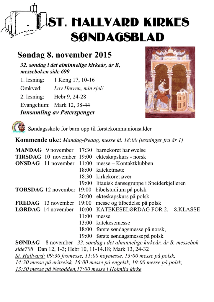 St. Hallvard kirkes søndagsblad Søndag 8. november 2015 32. søndag i det alminnelige kirkeår, år B, messeboken side 699 1. lesning: 1 Kong 17, 10-16 Omkved: Lov Herren, min sjel! 2. lesning: Hebr 9, 24-28 Evangelium: Mark 12, 38-44 Innsamling av Peterspenger Søndagsskole for barn opp til førstekommunionsalder Kommende uke: Mandag-fredag, messe kl. 18:00 (lesninger fra år 1) MANDAG 9 november 17:30 barnekoret har øvelse TIRSDAG 10 november 19:00 ekteskapskurs - norsk ONSDAG 11 november 11:00 messe – Kontaktklubben 18:00 kateketmøte 18:30 kirkekoret øver 19:00 litauisk dansegruppe i Speiderkjelleren TORSDAG 12 november 19:00 bibelstudium på polsk 20:00 ekteskapskurs på polsk FREDAG 13 november 19:00 messe og tilbedelse på polsk LØRDAG 14 november 10:00 KATEKESELØRDAG FOR 2. – 8.KLASSE 11:00 messe 13:00 katekesemesse 18:00 første søndagsmesse på norsk, 19:00 første søndagsmesse på polsk SØNDAG 8 november 33. søndag i det alminnelige kirkeår, år B, messebok side708 Dan 12, 1-3; Hebr 10, 11-14.18; Mark 13, 24-32 St. Hallvard: 09:30 fromesse, 11:00 høymesse, 13:00 messe på polsk, 14:30 messe på eritreisk, 16:00 messe på engelsk, 19:00 messe på polsk, 13:30 messe på Nesodden,17:00 messe i Holmlia kirke Retrett for St. Hallvard menighet lørdag 21. november 2015 Tradisjonen tro, avholder vi igjen en retrett som forberedelse til Adventstiden. Denne gang har vi vært så heldige at vi får dominikanersøster sr. Ragnhild Bjelland o.p. fra Sta. Katarinahjemmet til å holde retrett for oss. Som tema har hun valgt: ”Herre, lær meg å be” Dette burde være et tema som langt de fleste vil ha glede av å kunne fordype seg i og vi håper mange vil finne veien til oss den 21. november. Program for retretten ser slik ut: 11.00 Messe 11.30 Kaffe Velkommen – program og gjennomføring Presentasjon v/ sr. Ragnhild Bjelland o.p. 12.00 ”Hva er egentlig bønn,- kan alle be? ”– innledning Refleksjon og diskusjon Samtale 13.30 Pause,- kaffe/te + rundstykker 14.00 ”Er messens liturgi bønn?” ”Er noen flinkere enn andre til å be?” Innledning Refleksjon og diskusjon 15.30 Oppsummering i plenum 16.00 Avslutning med bønn Vil du ha søndagsbladet og annen informasjon hjem i stuen? Gå inn og lik St. Hallvard menighet på facebook! Bokskapet vil være åpent på søndager. Ta en titt! Benytt muligheten til bestille varer fra St. Olav Bokhandel, eller si fra om hva du ønsker å finne i bokskapets utvalg. God handel! Fellesskapet Sant’Egidio - kveldsbønn i St. Joseph kirke Sant’Egidio inviterer til kveldsbønn tirsdag 10. november kl. 18.45 i St. Josef kirke i Akersveien (etter kveldsmessen i St. Olav kirke). Kveldsbønnen varer om lag 45 minutter. Det blir ikke refleksjonsmøte etter kveldsbønnen denne tirsdagen. Alle er hjertelig velkomne! Fellesskapet Sant’Egidio Notiser: Kontaktklubben møtes til lunsj og hyggelig samvær onsdager etter messen kl 11:00 Familiekoret har øvelse hver mandag kl 17:30 Kirkekoret har øvelse onsdager kl 18:30 og søndager kl 10:15 før høymesse kl 11:00 8. november kl 12:30 Mariakirken, Stabekks menighetsal: «Om familien i vår tid» Maria Fongen rapporterer fra Familiesynoden. 9. november kl 19:30 St. Dominikus foredragssal: motsetninger: «Klassisisten Ingres og Romantikkens mangfold» f. Ellert Dahl 13. og 14. november er det julemarked hos St. Joseph-søstrene. Se annonse 16. november kl 19:30 i Dominikanernes foredragssal. P. Ellert Dahl: «franske impresjonister og deres inspirerte kunsthandler, Paul Durand-Ruel» 18. november (Ny dato) 19:30 i St. Dominkus. «Mangfoldig, dog ens i grunnen» professor Jan Schumacher om salmesangens plass i kristen kultus. 21.november kl 11:00 i St. Hallvard: Adventsretrett ved sr. Ragnhild Marie Bjelland fra Katarinahjemmet 23. november kl 19:30 v p. Ellert Dahl: Balthus.- Festlig avslutning 28. november: Åpen dag på Sta. Katarinahjemmet. Se annonse 8. desember kl 19:30 i Dominikanernes foredragssal v. sr. Else- Britt Nilsen o.p.: « Norske tidebønner- et dominikansk pionerarbeid i tekst og toner» Vi takker for kollekt fra 1. november kr kr kr kr kr kr kr 655 lørdag kveld på norsk kr 444 lørdag kveld på polsk kr 1 758 fromesse på norsk kr 4 206 høymesse på norsk kr 4 760 messe på polsk kr 1 594 engelsk messe kr 1 500 gave fra eritreisk kvinnegruppe 786 2 151 1 158 854 1 950 1 400 messe på eritreisk messe på polsk søndag kveld messe på Holmlia messe på Nesodden kirkekaffe alle sjelers messe Vi minner om muligheten til å gi kollekt via betalingsterminalen bak i kirken. JULEMARKED St. Josephsøstrenes Hjem Glads vei 23, 0489 Oslo inviterer til julemarked Fredag, 13. november 2015 Kl. 10.00 – 13.00 Lørdag, 14. november 2015 Kl. 10.00 – 13.00 NB! Betaling også med bankkort Hjertelig velkommen! Velkommen til Åpen dag på Sta. Katarinahjemmet lørdag 28. november fra 10:30 - 15:00 Vi har julesalg, utlodning, juleverksted og en hyggelig liten kafé, og gleder oss til å se familie, og nye og gamle venner og bekjente. Følg med på vår hjemmeside for oppdatert program; http://katarinahjemmet.katolsk.no Vi håper dere tar turen innom. Hilsen søstrene på Sta. Katarinahjemmet Sta. Katarinahjemmet, Gjørstadsgate 9, 0367 OsloTlf: 23 21 54 10 e-post: [email protected] SIDEN FOR BARN OG UNGE Husk! 14. november: 28.-29.11: 6. desember: 24. desember: katekese for 2.-8. klasse adventsovernatting i St. Hallvard for 4.-7. klasse! St. Nikolaus kommer på besøk etter 11-messen! Julespill i familiemessene St. Hallvard trenger flere søndagsskolelærere! Aldri før har vi hatt så få søndagsskolelærere som på gjeldende tidspunkt. St. Hallvard trenger deg. Har du lyst til å bidra? Søndagsskolen er et tilbud som hjelper barna å forstå evangeliet og gir dem større motivasjon til å komme til messen. I St. Hallvard har vi søndagsskole hver søndag i høymessen bortsett fra den søndagen det er familiemesse, og det er et ferdig opplegg til hver søndag som man kan ta utgang