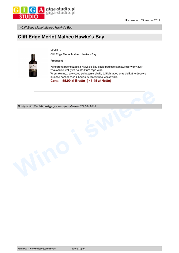 Utworzono : 09 marzec 2017 > Cliff Edge Merlot Malbec Hawke's Bay Cliff Edge Merlot Malbec Hawke's Bay Model : Cliff Edge Merlot Malbec Hawke's Bay Producent : Winogrona pochodzace z Hawke's Bay gdzie podloze stanowi czerwony zwir znakomicie wpluywa na strukture tego wina. W smaku mozna wyczuc polaczenie sliwki, dzikich jagod oraz delikatne debowe niuanse pochodzace z beczki, w ktorej wino lezakowalo. Cena : 55,90 zł Brutto ( 45,45 zł Netto) W i o in kontakt : - [email protected] Strona 1/{nb} e c e i w ś Dostępność: Produkt dostępny w naszym sklepie od 27 luty 2013