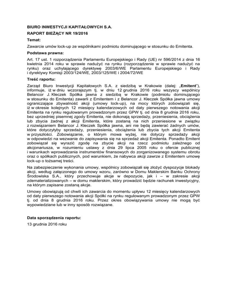 BIURO INWESTYCJI KAPITAŁOWYCH S.A. RAPORT BIEŻĄCY NR 19/2016 Temat: Zawarcie umów lock-up ze wspólnikami podmiotu dominującego w stosunku do Emitenta. Podstawa prawna: Art. 17 ust. 1 rozporządzenia Parlamentu Europejskiego i Rady (UE) nr 596/2014 z dnia 16 kwietnia 2014 roku w sprawie nadużyć na rynku (rozporządzenie w sprawie nadużyć na rynku) oraz uchylającego dyrektywę 2003/6/WE Parlamentu Europejskiego i Rady i dyrektywy Komisji 2003/124/WE, 2003/125/WE i 2004/72/WE Treść raportu: Zarząd Biuro Inwestycji Kapitałowych S.A. z siedzibą w Krakowie (dalej: „Emitent”), informuje, iż w dniu wczorajszym tj. w dniu 12 grudnia 2016 roku wszyscy wspólnicy Belancor J. Kłeczek Spółka jawna z siedzibą w Krakowie (podmiotu dominującego w stosunku do Emitenta) zawarli z Emitentem i z Belancor J. Kłeczek Spółka jawna umowy ograniczające zbywalność akcji (umowy lock-up), na mocy których zobowiązali się, iż w okresie kolejnych 12 miesięcy kalendarzowych od daty pierwszego notowania akcji Emitenta na rynku regulowanym prowadzonym przez GPW tj. od dnia 8 grudnia 2016 roku, bez uprzedniej pisemnej zgody Emitenta, nie dokonają sprzedaży, przeniesienia, obciążenia lub zbycia żadnej z akcji Emitenta, które zostaną na nich przeniesione w związku z rozwiązaniem Belancor J. Kłeczek Spółka jawna, ani nie będą zawierać żadnych umów, które dotyczyłyby sprzedaży, przeniesienia, obciążenia lub zbycia tych akcji Emitenta w przyszłości. Zobowiązanie, o którym mowa wyżej, nie dotyczy sprzedaży akcji w odpowiedzi na wezwanie do zapisywania się na sprzedaż akcji Emitenta. Ponadto Emitent zobowiązał się wyrazić zgodę na zbycie akcji na rzecz podmiotu zależnego od akcjonariusza, w rozumieniu ustawy z dnia 29 lipca 2005 roku o ofercie publicznej i warunkach wprowadzania instrumentów finansowych do zorganizowanego systemu obrotu oraz o spółkach publicznych, pod warunkiem, że nabywca akcji zawrze z Emitentem umowę lock-up o tożsamej treści. Na zabezpieczenie wykonania umowy, wspólnicy zobowiązali się złożyć dyspozycje blokady akcji, według załączonego do umowy wzoru, zarówno w Domu Maklerskim Banku Ochrony Środowiska S.A., który przechowuje akcje w depozycie, jak i – w zakresie akcji zdematerializowanych – w domu maklerskim, który prowadzić będzie rachunek inwestycyjny, na którym zapisane zostaną akcje. Umowy obowiązują od chwili ich zawarcia do momentu upływu 12 miesięcy kalendarzowych od daty pierwszego notowania akcji Spółki na rynku regulowanym prowadzonym przez GPW tj. od dnia 8 grudnia 2016 roku. Przez okres obowiązywania umowy nie mogą być wypowiedziane lub w inny sposób rozwiązane. Data sporządzenia raportu: 13 grudnia 2016 roku
