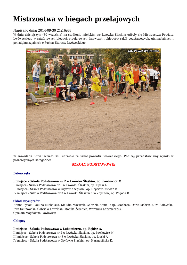 Mistrzostwa w biegach przełajowych Napisano dnia: 2014-09-30 21:16:44 W dniu dzisiejszym (30 września) na stadionie miejskim we Lwówku Śląskim odbyły się Mistrzostwa Powiatu Lwóweckiego w sztafetowych biegach przełajowych dziewcząt i chłopców szkół podstawowych, gimnazjalnych i ponadgimnazjalnych o Puchar Starosty Lwóweckiego. W zawodach udział wzięło 300 uczniów ze szkół powiatu lwóweckiego. Poniżej przedstawiamy wyniki w poszczególnych kategoriach. SZKOŁY PODSTAWOWE: Dziewczęta I miejsce - Szkoła Podstawowa nr 2 w Lwówku Śląskim, op. Pawłowicz M. II miejsce - Szkoła Podstawowa nr 3 w Lwówku Śląskim, op. Lipski A. III miejsce - Szkoła Podstawowa w Gryfowie Śląskim, op. Hryciew-Listwan B. IV miejsce - Szkoła Podstawowa nr 3 w Lwówku Śląskim filia Zbylutów, op. Pogoda D. Skład zwycięzców: Hanna Sysak, Paulina Michalska, Klaudia Mazurek, Gabriela Kania, Kaja Czachara, Daria Mścisz, Eliza Sołowska, Ewa Delinowska, Gabriela Kowalska, Monika Żerebiec, Weronika Kazimierczuk. Opiekun Magdalena Pawłowicz Chłopcy I miejsce - Szkoła Podstawowa w Lubomierzu, op. Rębisz A. II miejsce - Szkoła Podstawowa nr 2 w Lwówku Śląskim, op. Pawłowicz M. III miejsce - Szkoła Podstawowa nr 3 w Lwówku Śląskim, op. Lipski A. IV miejsce - Szkoła Podstawowa w Gryfowie Śląskim, op. Harmacińska K. Skład zwycięzców: Mariusz Czop, Łukasz Mytych, Seweryn Półtorak, Marceli Futryk, Szymon Lewicki, Emil Sidorski, Filip Swojnóg, Damian Szpilowski, Kuba Arendarczyk, Gracjan Szymonowicz, Kamil Kujawa, Wiktor, Kupnicki. Opiekun Adam Rębisz. SZKOŁY GIMNAZJALNE Dziewczęta I miejsce - Gimnazjum w Lwówku Śląskim 1, op. Bialic M. II miejsce - Gimnazjum we Wleniu, op. Świerczyńska-Janur M. III miejsce - Gimnazjum w Gryfowie Śląskim, op. Babiak K. IV miejsce - Gimnazjum w Lwówku Śląskim 2, op. Syska E. V miejsce - Gimnazjum w Lwówku Śląskim 3, op. Ruta G. VI miejsce - Gimnazjum w Mirsku, op. Radowicz I. VII miejsce - Gimnazjum w Lubomierzu, op. Kunysz G. Skład zwycięzców: Małgorzata Frydrych, Aleksandra Jezioro, Karolina Konigsman, Natalia Markowska, Magdalena Walas, Angelika Piekarz, Julia Mańkiewicz, Natalia Ziemniak, Kamila Tomaszczyk, Anna Gniado. Opiekun Marek Bialic, Elżbieta Syska, Grażyna Ruta, Palimąka Janusz, Ugrynowicz Stanisław. Chłopcy I miejsce - Gimnazjum w Lwówku Śląskim 1, op. Bialic M. II miejsce - Gimnazjum w Gryfowie Śląskim, op. Złocik K. III miejsce - Gimnazjum w Mirsku, op. Wichowski J. IV miejsce - Gimnazjum w Lwówku Śląskim 2, op. Syska E. V miejsce - Gimnazjum w Lubomierzu, op. Kunysz D. Skład zwycięzców: Tymoteusz Kobak, Mateusz Zawada, Tomasz Bialic, Paweł Konigsman, Krzysztof Piotrowski, Przemysław Markowski, Tomasz Marut, Jakub Półćwiartek, Daniel Rosochacki, Dawid Mulak. Opiekun Marek Bialic, Elżbieta Syska, Grażyna Ruta, Palimąka Janusz, Ugrynowicz Stanisław SZKOŁY PONADGIMNAZJALNE Dziewczęta I miejsce - ZSE-T w Rakowicach Wielkich, op. Łukasik Joanna II miejsc - ZSOiZ w Lwówku Śląskim, op. Hess-Paraniak D. III miejsce - ZSL-G w Mirsku, op. Radowicz I. Skład zwycięzców: Justyna Jastrzębska, Wiktoria Buryło, Monika Cetnarska, Ewa Ludziak, Aleksandra Wełpa, Dominika Gerlak, Anna Sarota, Dorota, Topolska, Natalia Foremna, Anna Kadłubowska, Kamila Puchalska, Katarzyna Mikuła, Sandra Niestier, Aleksandra Szymańska, Aleksandra Bancewicz. Opiekun Joanna Łukasik Chłopcy I miejsce - ZSE-T w Rakowicach Wielkich, op. Dymitroca A. II miejsc - ZSL-G w Mirsku, op. Wichowski J. III miejsce - ZSOiZ w Lwówku Śląskim, op. Zając P. IV miejsce - ZSOiZ w Gryfowie Śląskim, op. Cichoń A. V miejsce - ZS w Lubomierzu, op. Kunysz D. Skład zwycięzców: Marcin Nalepka, Paweł Masłoń, Bartłomiej Kruczkowski, Bartosz Hałka, Szymon Hałka, Michał Nazaruk, Krystian Sudół, Zbigniew Buryło, Dominik Muranicki, Gracjan Bałut, Łukasz Sieradzki, Hubert Kaczor, Adrian Wolski, Sebastian Grygion. Opiekun Adam Dymitroca Zwycięzcy wezmą udział w Finałach Dolnośląskich Sztafetowych Biegów Przełajowych, które odbędą się 9 października 2014r. w Olszynie. Powiatowy Szkolny Związek Sportowy w Lwówku Śląskim P R E Z E S, Powiatu Lwóweckiego, mgr Grzegorz Połaczewski