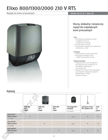 Elixo 800/1300/2000 230 V RTS Napędy do bram przesuwnych BR AMA DO 20 M I 2000 KG Mocny, dokładny i bezpieczny napęd dla największych bram przesuwnych · Moc > Możliwość przesuwania bram o długości do 20 m i ciężarze do 2000 kg > Do 100 cykli na dobę > Przekładnia napędu jest wykonana całkowicie ze stali · Precyzja > Wbudowany czujnik położenia > Precyzyjna obsługa ruchu i strefy hamowania bramy · Bezpieczeństwo > Programowana siła domykania dla ograniczenia uszkodzeń w przypadku napotkania na przeszkodę > Dostępne są wejścia dla sygnałów od urządzeń zabezpieczających: fotokomórek i listwy bezpieczeństwa Pakiety Elixo 800 RTS Pakiet standard Pilot Keygo RTS 4 kanałowy Zewnętrzna antena RTS z kablem 3 mb Sztuk na palecie 2x ! 45 ! 2x ! 45 ! 2x ! 45 ELIXO 1300 230 V napęd ELIXO 2000 230 V napęd ! – – ! – ! – – – ! ELIXO 800 230 V napęd art. 1841064 art. 1216329 Elixo 1300 RTS Pakiet standard art. 1216264 Elixo 2000 RTS Pakiet standard art. 1216330 50 Rozwiązania dla bram ogrodzeniowych I Bramy przesuwne 2 Typowa instalacja 3 Schemat pokazuje akcesoria zalecane do instalacji układu napędu. 230 V 1. Elixo 800/1300/2000 230 V RTS 2. Lampka ostrzegawcza 3. Antena 1 82 272 (Elixo 800) 325 (Elixo 1300/2000) Wymiary [mm]: 216 248 216 (Elixo 800) 246 (Elixo 1300/2000) Specyfikacja techniczna Elixo 800 Zasilanie silnika elektrycznego Elixo 1300 Elixo 2000 230 V - 50 Hz Moc silnika 260 W Prędkość bramy 10 m/min. Siła domykania Detekcja elektroniczna regulowana Zarządzanie przesuwem Enkoder określający pozycję Redukcja przekładni 1/28 Maksymalna ilość operacji dziennie 100 Elixo 800 Temperatura pracy Elixo 1300 -15 °C do +40 °C Stopień ochrony IP 44 Częstotliwość radiowa sterowania RTS 433,42 MHz Ilość urządzeń zdalnego sterowania możliwych do zapisania w pamięci 36 Akcesoria dodatkowe Klawiatura radiowa RTS w obudowie metalowej Lampka ostrzegawcza 230V 1 metrowa stalowa listwa zębata Pasywna listwa bezpieczeństwa art. 1841116 art. 9015882 art. 9011069 art. 9014597 art. 9014598 51 Elixo 2000 Dane techniczne napędów bram przesuwnych Elixo Optimo RTS Elixo 500 3S RTS / io Charakterystyka ogólna Maksymalna waga/długość skrzydła 300 kg - 6 m Ilość cykli otwarcia/zamknięcia dziennie Zasilanie sieciowe Motor voltage 500 kg - 8 m 20 30 230 V - 50 Hz 230 V - 50 Hz 24 VDC 24 VDC 600 W (z 500W oświetleniem) 70 W Siła pociągowa 380 N 750 N Max. prędkość 9 m/min. 12 m/min. 20 sek. 15 sek. Maks. zużycie mocy Czas otwarcia na szerokość 3 m Obsługa ręczna Otwarcie blokady pokrętłem Otwarcie blokady kluczykiem Interfejs programowania 4 przyciski, 4 diody LED 7 przycisków, ekran 3 znakowy LCD Temperatura pracy -20 °C / +60 °C - IP 44 -20 °C / +60 °C - IP 44 433,42 MHz Częstotliwość radiowa Somfy Ilość kanałów jakie mogą być zapamiętane Sterowanie jednokierunkowe (Keygo io, Situo io, etc.) 16 Sterowanie dwukierunkowe (Keytis io, Telis io, Composio io, ...) - 433,42 MHz 868-870 MHz Razem/ kontrola przejscia dla pieszych: 32 Kontrola oświetlenia: 4 Kontrola wyjścia pomocniczego: 4 RTS: -; io: bez ograniczeń Nie Kompatybilne z wyjściem bezpotencjałowym listwy bezpieczeństwa Połączenia Wejście zabezpieczenia bramy Bezpieczeństwo wejść Typ Kompatybilność Wejście sterowania kablowego Nie Styk bezpotencjałowy NC Nie Zestaw fotokomórek - fotokomorka z odblysnikiem listwa bezpieczeństwa Styk bezpotencjalowy: NO Styk bezpotencjalowy: NO Wyjście oddzielnego oświetlenia 230 V - 500 W 230 V - 500 W Wyjście pomarańczowego światła 24 V - 15 W z wbudowanym przerywaczem 24 V - 15 W z wbudowanym przerywaczem Wyjście zasilania sterowania 24 V Nie Wyjście testowe akcesoriów bezpieczeństwa Nie Tak: moze byc używane do autotestu zestawu fotokomórek Tak: może być używane do testowania fotokomórki z odbłysnikiem lub listwy bezpieczeństwa 24 VDC - 0,2 A max. 24 VDC - 1,2 A max. Kompatybilne z anteną RTS (art. 2400472) Tak: kompatybilne z anteną io (art. 9013953); kompatybilne z anteną RTS (art. 2400472) Tak: kompatybilne z akumulatorem 9,6 V - 1600 mAh (art. 9001001) Kompatybilne z akumulatorami 2 x 12 V - 1,2 Ah (art. 9014612) Wyjście zasilania akcesoriów Oddzielnie wejście anteny Wejście baterii awaryjnej Tak: kompatybilne z akumulatorem 9,6 V - 1600 mAh (art. 9001001) Operacje Tryb wymuszony Nie Poprzez naciśniecie i przytrzymanie przycisku sterowania napędem Sterowanie niezależnym oświetleniem Nie Tak Opóźnienie czasu świecenia (po ruchu) Nie Programowane: od 10 do 600 sek. Zamykanie w trybie automatycznym Tak Tak: programowane opóźnienie czasu zamykania od 0 do 250 minut Pomarańczowe światło ostrzegawcze Programowane: z wyprzedzeniem 2 sek. Programowane: z wyprzedzeniem 2 sek. lub bez Przy zamykaniu Programowane: stop - pelne otwarcie Programowane: stop - cześciowe otwarcie - pelne otwarcie Przed otwarciem Programowanie: brak reakcji lub wstrzymanie ruchu Programowanie: brak reakcji lub wstrzymanie ruchu Ustawiony czas otwierania: 7 sek. Programowane: dostępne 10 wartości Działanie zabezpieczenia Otwieranie bramy dla pieszego Progresywne uruchamianie Diagnozowanie Nie Tak 2 diody LED pokazujące status Zapamiętywanie danych i pokazywanie: licznik cykli, licznik cykli z napotkaniem przeszkody, liczba zapamietanych kanałów, historia ostatnich 10 blędów 52 500 kg - 8 m Elixo 800 230 V RTS Elixo 1300 230 V RTS 800 kg - 10 m 1300 kg - 12 m 100 100 230 V - 50 Hz 207-253 VAC - 50/60 Hz 230 VAC Elixo 2000 230 V RTS 2000 kg - 20 m 230 VAC 290 W 240 W 260 W 270 W 750 N 880 N 1100 N 1400 N 8,5 m/min. 10 m/min. 21 sek. 18 sek. Otwarcie blokady kluczykiem Odblokowanie kluczykiem 4 przyciski, 6 diod LED 4 przyciski - 8 diod LED -20 °C / +60 °C - IP 44 -20 °C / +60 °C - IP 44 433,42 MHz 433,42 MHz 36 36 - - Nie Kompatybilne z wyjściem bezpotencjałowym listwy bezpieczeństwa Nie Styk bezpotencjałowy NO Zestaw fotokomórek. Programowane: aktywne tylko przy zamykaniu / p