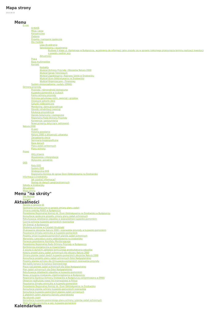 Mapa strony 2015-06-03 Menu O nas O RDOŚ Misja i wizja Kierownictwo Zadania Projekty i kampanie społeczne Dla mediów Loga do pobrania Sprostowania / wyjaśnienia Budowa II etapu ul. Ogińskiego w Bydgoszczy, wyjaśnienia do informacji jakie ukazały się w sprawie rzekomego przesunięcia terminu realizacji inwestycji z powodu siedlisk jeży Aktualności Praca Baza multimediów Kontakt Kontakty Wydział Ochrony Przyrody i Obszarów Natura 2000 Wydział Spraw Terenowych Wydział Zapobiegania i Naprawy Szkód w Środowisku Wydział Ocen Oddziaływania na Środowisko Wydział Organizacyjno - Finansowy System ekozarządzania i audytu (EMAS) Ochrona przyrody Przyroda i różnorodność biologiczna Kujawsko-pomorskie w liczbach Formy ochrony przyrody Ochrona gatunkowa roślin, zwierząt i grzybów Inwazyjne gatunki obce Gatunki niebezpieczne Monitoring i dane przyrodnicze Ośrodki rehabilitacji zwierząt Edukacja przyrodnicza Ogrody botaniczne i zoologiczne Regionalna Rada Ochrony Przyrody Konwencje i porozumienia Nowe przepisy dotyczące zadrzewień Natura 2000 O sieci Historia powstania Natura 2000 a aktywność człowieka Zarządzanie siecią Seminaria biogeograficzne Baza danych Plany zadań ochronnych Plany ochrony Prawo Akty prawne Wyjaśnienia i interpretacje Wytyczne i poradniki OOŚ Rola OOŚ System OOŚ Strategiczna OOŚ Regionalna Komisja do spraw Ocen Oddziaływania na Środowisko Informacja o środowisku Jak uzyskać informację? Dostęp do danych geoprzestrzennych Szkody w środowisku Aktualności Mapa strony Menu "na skróty" Dla Mediów Kontakt Aktualności Narada w sprawie S5 Spotkanie konsultacyjne w sprawie zmiany planu zadań Zmiana siedziby RDOŚ w Bydgoszczy Posiedzenie Regionalnej Komisji ds. Ocen Oddziaływania na Środowisko w Bydgoszczy Konsultacje społeczne projektu zmiany planu zadań ochronnych Rekultywacja składowisk odpadów w województwie kujawsko-pomorskim Czynna ochrona kujawsko-pomorskich rezerwatów Dni Energii w Bydgoszczy Działania ochronne w Cytadeli Grudziądz Znakowanie obszarów Natura 2000 i rezerwatów przyrody w kujawsko-pomorskim Pozyskanie ślimaka winniczka w kujawsko-pomorskim Projekty zmian kujawsko-pomorskich planów zadań ochronnych Warsztaty z procedury oceny oddziaływania na środowisko Pierwsze posiedzenie Komitetu Monitorującego Posiedzenie Regionalnej Rady Ochrony Przyrody w Bydgoszczy Konferencja energetyczna w Inowrocławiu Z wizytą w duńskim zakładzie termicznego przekształcania odpadów Kolejny projekt planu zadań ochronnych dla obszaru Natura 2000 Zmiana planów zadań dwóch kujawsko-pomorskich obszarów Natura 2000 Konsultacje projektu planu zadań ochronnych Ostoi Nadgoplańskiej Projekty planów ochrony dla 10 kujawsko-pomorskich rezerwatów przyrody Nie każdy barszcz to barszcz Sosnowskiego Prace nad planem zadań ochronnych dla Ostoi Nadgoplańskiej Plan zadań ochronnych dla Ostoi Nadgoplańskiej Rekultywacja składowisk odpadów w kujawsko-pomorskim Nowa, przyjazna środowisku elektrociepłownia w Bydgoszczy Regionalna Dyrekcja Ochrony Środowiska w Bydgoszczy zarejestrowana w EMAS Otwarcie najdłuższej nowej linii tramwajowej w Polsce Pozyskanie ślimaka winniczka w kujawsko-pomorskim Posiedzenie Regionalnej Komisji ds. Ocen Oddziaływania na Środowisko Konsultacje planów ochrony kujawsko-pomorskich rezerwatów Konsultacje kujawsko-pomorskich planów zadań ochronnych Z głębokim żalem żegnamy Danutę Lewandowską Na ratunek cisom Konsultacje kujawsko-pomorskiego planu ochrony i planów zadań ochronnych Zbiór ślimaka winniczka w woj. kujawsko-pomorskim Kalendarium Spotkanie konsultacyjne Dzień Ligi Ochrony Przyrody Światowy Dzień Leśnika Akcja "Przygarnij jerzyka"