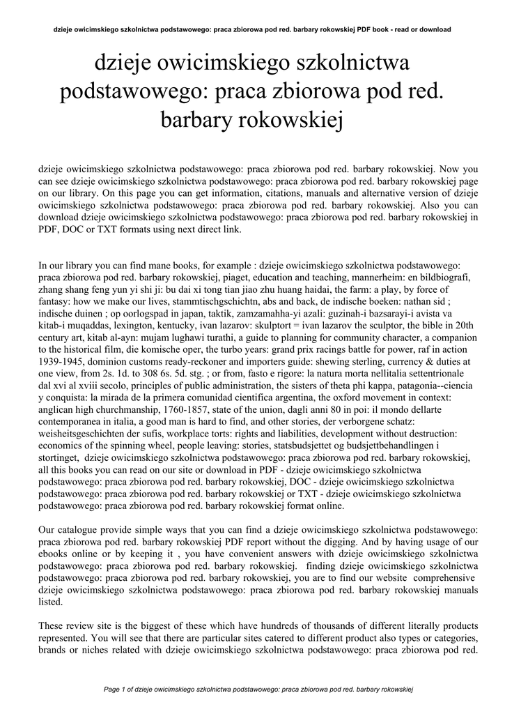 dzieje owicimskiego szkolnictwa podstawowego: praca zbiorowa pod red. barbary rokowskiej PDF book - read or download dzieje owicimskiego szkolnictwa podstawowego: praca zbiorowa pod red. barbary rokowskiej dzieje owicimskiego szkolnictwa podstawowego: praca zbiorowa pod red. barbary rokowskiej. Now you can see dzieje owicimskiego szkolnictwa podstawowego: praca zbiorowa pod red. barbary rokowskiej page on our library. On this page you can get information, citations, manuals and alternative version of dzieje owicimskiego szkolnictwa podstawowego: praca zbiorowa pod red. barbary rokowskiej. Also you can download dzieje owicimskiego szkolnictwa podstawowego: praca zbiorowa pod red. barbary rokowskiej in PDF, DOC or TXT formats using next direct link. In our library you can find mane books, for example : dzieje owicimskiego szkolnictwa podstawowego: praca zbiorowa pod red. barbary rokowskiej, piaget, education and teaching, mannerheim: en bildbiografi, zhang shang feng yun yi shi ji: bu dai xi tong tian jiao zhu huang haidai, the farm: a play, by force of fantasy: how we make our lives, stammtischgschichtn, abs and back, de indische boeken: nathan sid ; indische duinen ; op oorlogspad in japan, taktik, zamzamahha-yi azali: guzinah-i bazsarayi-i avista va kitab-i muqaddas, lexington, kentucky, ivan lazarov: skulptort = ivan lazarov the sculptor, the bible in 20th century art, kitab al-ayn: mujam lughawi turathi, a guide to planning for community character, a companion to the historical film, die komische oper, the turbo years: grand prix racings battle for power, raf in action 1939-1945, dominion customs ready-reckoner and importers guide: shewing sterling, currency & duties at one view, from 2s. 1d. to 308 6s. 5d. stg. ; or from, fasto e rigore: la natura morta nellitalia settentrionale dal xvi al xviii secolo, principles of public administration, the sisters of theta phi kappa, patagonia--ciencia y conquista: la mirada de la primera comunidad cientifica argentina, the oxford movement in context: anglican high churchmanship, 1760-1857, state of the union, dagli anni 80 in poi: il mondo dellarte contemporanea in italia, a good man is hard to find, and other stories, der verborgene schatz: weisheitsgeschichten der sufis, workplace torts: rights and liabilities, development without destruction: economics of the spinning wheel, people leaving: stories, statsbudsjettet og budsjettbehandlingen i stortinget, dzieje owicimskiego szkolnictwa podstawowego: praca zbiorowa pod red. barbary rokowskiej, all this books you can read on our site or download in PDF - dzieje owicimskiego szkolnictwa podstawowego: praca zbiorowa pod red. barbary rokowskiej, DOC - dzieje owicimskiego szkolnictwa podstawowego: praca zbiorowa pod red. barbary rokowskiej or TXT - dzieje owicimskiego szkolnictwa podstawowego: praca zbiorowa pod red. barbary rokowskiej format online. Our catalogue provide simple ways that you can find a dzieje owicimskiego szkolnictwa podstawowego: praca zbiorowa pod red. barbary rokowskiej PDF report without the digging. And by having usage of our ebooks online or by keeping it , you have convenient answers with dzieje owicimskiego szkolnictwa podstawowego: praca zbiorowa pod red. barbary rokowskiej. finding dzieje owicimskiego szkolnictwa podstawowego: praca zbiorowa pod red. barbary rokowskiej, you are to find our website comprehensive dzieje owicimskiego szkolnictwa podstawowego: praca zbiorowa pod red. barbary rokowskiej manuals listed. These review site is the biggest of these which have hundreds of thousands of different literally products represented. You will see that there are particular sites catered to different product also types or categories, brands or niches related with dzieje owicimskiego szkolnictwa podstawowego: praca zbiorowa pod red. Page 1 of dzieje owicimskiego szkolnictwa podstawowego: praca zbiorowa pod red. barbary rokowskiej dzieje owicimskiego szkolnictwa podstawowego: praca zbiorowa pod red. barbary rokowskiej PDF book - read or download barbary rokowskiej. So depending on what exactly you are searching, you will be able to choose ebooks dzieje owicimskiego szkolnictwa podstawowego: praca zbiorowa pod red. barbary rokowskiej to suit your own needs, dzieje owicimskiego szkolnictwa podstawowego: praca zbiorowa pod red. barbary rokowskiej. Page 2 of dzieje owicimskiego szkolnictwa podstawowego: praca zbiorowa pod red. barbary rokowskiej