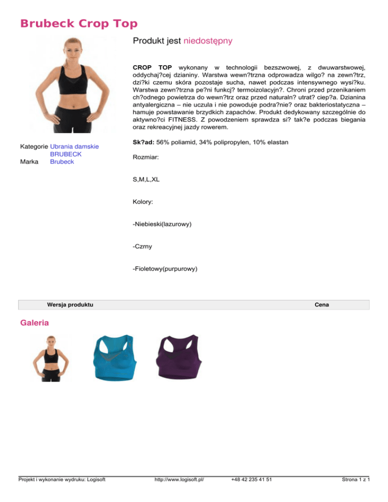 Brubeck Crop Top Produkt jest niedostępny CROP TOP wykonany w technologii bezszwowej, z dwuwarstwowej, oddychaj?cej dzianiny. Warstwa wewn?trzna odprowadza wilgo? na zewn?trz, dzi?ki czemu skóra pozostaje sucha, nawet podczas intensywnego wysi?ku. Warstwa zewn?trzna pe?ni funkcj? termoizolacyjn?. Chroni przed przenikaniem ch?odnego powietrza do wewn?trz oraz przed naturaln? utrat? ciep?a. Dzianina antyalergiczna – nie uczula i nie powoduje podra?nie? oraz bakteriostatyczna – hamuje powstawanie brzydkich zapachów. Produkt dedykowany szczególnie do aktywno?ci FITNESS. Z powodzeniem sprawdza si? tak?e podczas biegania oraz rekreacyjnej jazdy rowerem. Kategorie Ubrania damskie BRUBECK Marka Brubeck Sk?ad: 56% poliamid, 34% polipropylen, 10% elastan Rozmiar: S,M,L,XL Kolory: -Niebieski(lazurowy) -Czrny -Fioletowy(purpurowy) Wersja produktu Cena Galeria Projekt i wykonanie wydruku: Logisoft Powered by TCPDF (www.tcpdf.org) http://www.logisoft.pl/ +48 42 235 41 51 Strona 1 z 1