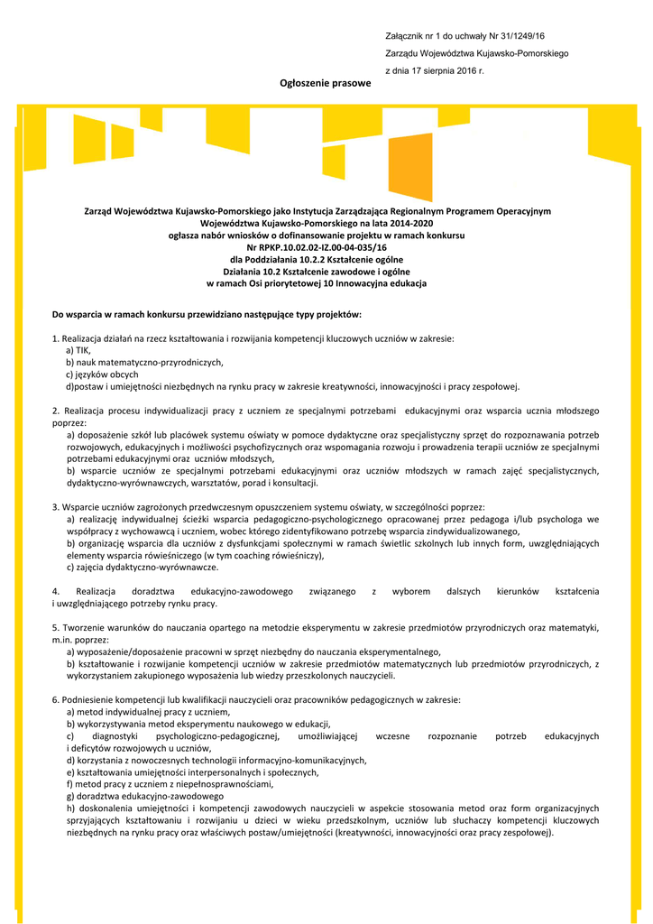 Załącznik nr 1 do uchwały Nr 31/1249/16 Zarządu Województwa Kujawsko-Pomorskiego z dnia 17 sierpnia 2016 r. Ogłoszenie prasowe Zarząd Województwa Kujawsko-Pomorskiego jako Instytucja Zarządzająca Regionalnym Programem Operacyjnym Województwa Kujawsko-Pomorskiego na lata 2014-2020 ogłasza nabór wniosków o dofinansowanie projektu w ramach konkursu Nr RPKP.10.02.02-IZ.00-04-035/16 dla Poddziałania 10.2.2 Kształcenie ogólne Działania 10.2 Kształcenie zawodowe i ogólne w ramach Osi priorytetowej 10 Innowacyjna edukacja Do wsparcia w ramach konkursu przewidziano następujące typy projektów: 1. Realizacja działań na rzecz kształtowania i rozwijania kompetencji kluczowych uczniów w zakresie: a) TIK, b) nauk matematyczno-przyrodniczych, c) języków obcych d)postaw i umiejętności niezbędnych na rynku pracy w zakresie kreatywności, innowacyjności i pracy zespołowej. 2. Realizacja procesu indywidualizacji pracy z uczniem ze specjalnymi potrzebami edukacyjnymi oraz wsparcia ucznia młodszego poprzez: a) doposażenie szkół lub placówek systemu oświaty w pomoce dydaktyczne oraz specjalistyczny sprzęt do rozpoznawania potrzeb rozwojowych, edukacyjnych i możliwości psychofizycznych oraz wspomagania rozwoju i prowadzenia terapii uczniów ze specjalnymi potrzebami edukacyjnymi oraz uczniów młodszych, b) wsparcie uczniów ze specjalnymi potrzebami edukacyjnymi oraz uczniów młodszych w ramach zajęć specjalistycznych, dydaktyczno-wyrównawczych, warsztatów, porad i konsultacji. 3. Wsparcie uczniów zagrożonych przedwczesnym opuszczeniem systemu oświaty, w szczególności poprzez: a) realizację indywidualnej ścieżki wsparcia pedagogiczno-psychologicznego opracowanej przez pedagoga i/lub psychologa we współpracy z wychowawcą i uczniem, wobec którego zidentyfikowano potrzebę wsparcia zindywidualizowanego, b) organizację wsparcia dla uczniów z dysfunkcjami społecznymi w ramach świetlic szkolnych lub innych form, uwzględniających elementy wsparcia rówieśniczego (w tym coaching rówieśniczy), c) zajęcia dydaktyczno-wyrównawcze. 4. Realizacja doradztwa edukacyjno-zawodowego i uwzględniającego potrzeby rynku pracy. związanego z wyborem dalszych kierunków kształcenia 5. Tworzenie warunków do nauczania opartego na metodzie eksperymentu w zakresie przedmiotów przyrodniczych oraz matematyki, m.in. poprzez: a) wyposażenie/doposażenie pracowni w sprzęt niezbędny do nauczania eksperymentalnego, b) kształtowanie i rozwijanie kompetencji uczniów w zakresie przedmiotów matematycznych lub przedmiotów przyrodniczych, z wykorzystaniem zakupionego wyposażenia lub wiedzy przeszkolonych nauczycieli. 6. Podniesienie kompetencji lub kwalifikacji nauczycieli oraz pracowników pedagogicznych w zakresie: a) metod indywidualnej pracy z uczniem, b) wykorzystywania metod eksperymentu naukowego w edukacji, c) diagnostyki psychologiczno-pedagogicznej, umożliwiającej wczesne rozpoznanie potrzeb edukacyjnych i deficytów rozwojowych u uczniów, d) korzystania z nowoczesnych technologii informacyjno-komunikacyjnych, e) kształtowania umiejętności interpersonalnych i społecznych, f) metod pracy z uczniem z niepełnosprawnościami, g) doradztwa edukacyjno-zawodowego h) doskonalenia umiejętności i kompetencji zawodowych nauczycieli w aspekcie stosowania metod oraz form organizacyjnych sprzyjających kształtowaniu i rozwijaniu u dzieci w wieku przedszkolnym, uczniów lub słuchaczy kompetencji kluczowych niezbędnych na rynku pracy oraz właściwych postaw/umiejętności (kreatywności, innowacyjności oraz pracy zespołowej). Konkurs w ramach polityki terytorialnej dedykowany na Obszary Strategicznej Interwencji (OSI) miast regionalnych i subregionalnych oraz Obszary Rozwoju Społeczno-Gospodarczego (ORSG). O wsparcie w ramach konkursu mogą ubiegać się: 1. organy prowadzące szkoły i placówki systemu oświaty realizujące podstawę programową kształcenia ogólnego (w tym szkoły specjalne) z wyłączeniem szkół dla dorosłych i policealnych. 2. wszystkie podmioty z wyłączeniem osób fizycznych (nie dotyczy osób prowadzących działalność gospodarczą lub oświatową na podstawie przepisów odrębnych), wyłącznie w partnerstwie z organem prowadzącym szkołę lub placówkę systemu oświaty realizującą podstawę programową kształcenia ogólnego (w tym szkołę specjalną) z wyłączeniem szkół dla dorosłych i policealnych. Szczegółowe informacje, wzory dokumentów oraz wytyczne dotyczące naboru i oceny projektów zawiera Regulamin konkursu, dostępny na stronie internetowej Urzędu Marszałkowskiego Województwa Kujawsko-Pomorskiego w Toruniu www.rpo.kujawsko-pomorskie.pl oraz na portalu www.funduszeeuropejskie.gov.pl. Informacji dotyczących konkursu udzielają pracownicy punktów informacyjnych. Główny Punkt Informacyjny Funduszy Europejskich w Toruniu Urząd Marszałkowski Województwa Kujawsko-Pomorskiego, Pl. Teatralny 2 tel. (56) 621 85 98; (56) 621 82 68; (56) 621 84 86; [email protected] Główny Punkt Informacyjny Funduszy Europejskich w Bydgoszczy Przedstawicielstwo Urzędu Marszałkowskiego Województwa Kujawsko-Pomorskiego, ul. Jagiellońska 9; tel. (52) 327 68 84; (52) 321 33 42; 797 304 123; [email protected] Lokalne Punkty Informacyjne w Przedstawicielstwach Urzędu Marszałkowskiego Województwa Kujawsko-Pomorskiego w: Grudziądzu, ul. Sienkiewicza 22, tel. (56) 462 45 15; 797 304 124, [email protected] Włocławku, ul. Bechiego 2, tel. (54) 235 67 21; (54) 235 67 12; 797 304 126, [email protected] Inowrocławiu, ul. Roosevelta 36/38, tel. (52) 355 91 95; 797 304 125, [email protected] Więcej informacji na www.rpo.kujawsko-pomorskie.pl 2