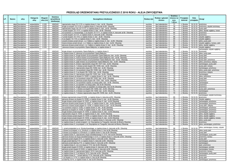 PRZEGLĄD DRZEWOSTANU PRZYULICZNEGO Z 2016 ROKU - ALEJA ZWYCIĘSTWA 1 2 3 4 5 6 7 8 9 10 11 12 aleja aleja aleja aleja aleja aleja aleja aleja aleja aleja aleja aleja Zwycięstwa Zwycięstwa Zwycięstwa Zwycięstwa Zwycięstwa Zwycięstwa Zwycięstwa Zwycięstwa Zwycięstwa Zwycięstwa Zwycięstwa Zwycięstwa wojewódzkie wojewódzkie wojewódzkie wojewódzkie wojewódzkie wojewódzkie wojewódzkie wojewódzkie wojewódzkie wojewódzkie wojewódzkie wojewódzkie 2 235 2 235 2 235 2 235 2 235 2 235 2 235 2 235 2 235 2 235 2 235 2 235 ANIOŁKI ANIOŁKI ANIOŁKI ANIOŁKI ANIOŁKI ANIOŁKI ANIOŁKI ANIOŁKI ANIOŁKI ANIOŁKI ANIOŁKI ANIOŁKI naprzeciwko słupa 10-11/19, w rzędzie drzew A, kier.: do Br. Oliwskiej drugie za słupem 10-11/19, w rzędzie drzew A, kierunek do Br. Oliwskiej naprzeciwko słupa 1/6 (10-11/17), w rzędzie drzew A, kier.: do Br. Oliwskiej 1 przed słupem 10─11/11, w rzędzie drzew A, kier.: do Br. Oliwskiej na wysokości ul. Konarskiego, 2 za słupem 10-11/11, w rzędzie drzew A, kierunek od Br. Oliwskiej 1 przed słupem 10-11/7, w rzędzie drzew A, kierunek od Br. Oliwskiej 1 przed słupem 10─11/5, w rzędzie drzew A, kier.: do Br. Oliwskiej 3 za słupem 10─11/5, w rzędzie drzew A, kier.: do Br. Oliwskiej czwarte drzewo przed skrzyż. z ul. Hallera w rzędzie drzew A, kier.: do Br. Oliwskiej trzecie drzewo przed skrzyż. z ul. Hallera w rzędzie drzew A, kier.: do Br. Oliwskiej pierwsze drzewo przed skrzyż. z ul. Hallera w rzędzie drzew A, kier.: do Br. Oliwskiej pierwsze drzewo na przystanku Opera Bałtycka, w rzędzie drzew A wycinka wycinka wycinka wycinka wycinka wycinka wycinka wycinka wycinka wycinka wycinka wycinka lipa holenderska lipa holenderska lipa holenderska lipa holenderska lipa holenderska lipa holenderska lipa holenderska lipa holenderska lipa holenderska lipa holenderska lipa holenderska lipa holenderska Średnica drzewa na wys. 1,30 m 77 78 68 77 60 71 68 69 64 62 68 61 13 14 15 16 17 18 19 20 21 22 23 24 25 26 27 28 29 30 31 32 33 aleja aleja aleja aleja aleja aleja aleja aleja aleja aleja aleja aleja aleja aleja aleja aleja aleja aleja aleja aleja aleja Zwycięstwa Zwycięstwa Zwycięstwa Zwycięstwa Zwycięstwa Zwycięstwa Zwycięstwa Zwycięstwa Zwycięstwa Zwycięstwa Zwycięstwa Zwycięstwa Zwycięstwa Zwycięstwa Zwycięstwa Zwycięstwa Zwycięstwa Zwycięstwa Zwycięstwa Zwycięstwa Zwycięstwa wojewódzkie wojewódzkie wojewódzkie wojewódzkie wojewódzkie wojewódzkie wojewódzkie wojewódzkie wojewódzkie wojewódzkie wojewódzkie wojewódzkie wojewódzkie wojewódzkie wojewódzkie wojewódzkie wojewódzkie wojewódzkie wojewódzkie wojewódzkie wojewódzkie 2 235 2 235 2 235 2 235 2 235 2 235 2 235 2 235 2 235 2 235 2 235 2 235 2 235 2 235 2 235 2 235 2 235 2 235 2 235 2 235 2 235 ANIOŁKI ANIOŁKI ANIOŁKI ANIOŁKI ANIOŁKI ANIOŁKI ANIOŁKI ANIOŁKI ANIOŁKI ANIOŁKI ANIOŁKI ANIOŁKI ANIOŁKI ANIOŁKI ANIOŁKI ANIOŁKI ANIOŁKI ANIOŁKI ANIOŁKI ANIOŁKI ANIOŁKI drugie drzewo na przystanku Opera Bałtycka, w rzędzie drzew A w rzędzie drzew A, pierwsze za przystankiem Opera Bałtycka w rzędzie drzew A, drugie drzewo za przystankiem Opera Bałtycka, kier.: do Br. Oliwskiej w rzędzie drzew A, trzecie drzewo za przystankiem Opera Bałtycka, kier.: do Br. Oliwskiej w rzędzie drzew A, czwarte drzewo za przystankiem Opera Bałtycka, kier.: do Br. Oliwskiej w rzędzie drzew A, piąte drzewo za przystankiem Opera Bałtycka, kier.: do Br. Oliwskiej w rzędzie drzew A, drzewo naprzeciwko słupa 09─10/71 kier.: do Br. Oliwskiej w rzędzie drzew A, 1 drzewo przed słupem 09─10/69, kier.: do Br. Oliwskiej w rzędzie drzew A, naprzeciwko słupa 09─10/69, kier.: do Br. Oliwskiej w rzędzie drzew A, na wysokości słupa 09─10/65, kier.: do Br. Oliwskiej w rzędzie drzew A, 3 za słupem 09─10/65, kier.: do Br. Oliwskiej w rzędzie drzew A, naprzeciwko słupa 09─10/63, kier.: do Br. Oliwskiej pierwsze drzewo za słupem 9─10/63, w rzędzie drzew A, kier.: do Br. Oliwskiej w rzędzie drzew A, na wysokości słupa 09─10/62, kier.: do Br. Oliwskiej w rzędzie drzew A, pierwsze przed słupem 09─10/61, kier.: do Br. Oliwskiej w rzędzie drzew A, na wysokości wjazdu na stację paliw, kier.: do Br. Oliwskiej w rzędzie drzew A, za wjazdem na stację paliw, kier.do Br.Oliwskiej w rzędzie drzew A, drugie drzewo za wjazdem na stację paliw, kier.do Br.Oliwskiej w rzędzie drzew A, 1 drzewo za słupem 09─10/60, kier.: do Br. Oliwskiej w rzędzie drzew A, 2 drzewo za słupem 09─10/60, kier.: do Br. Oliwskiej w rzędzie drzew A, 1 drzewo naprzeciwko słupa 09─10/59, kier.: do Br. Oliwskiej wycinka wycinka wycinka wycinka wycinka wycinka wycinka wycinka wycinka wycinka wycinka wycinka wycinka wycinka wycinka wycinka wycinka wycinka wycinka wycinka wycinka lipa holenderska lipa holenderska lipa holenderska lipa holenderska lipa holenderska lipa holenderska lipa holenderska lipa holenderska lipa holenderska lipa holenderska lipa holenderska lipa holenderska lipa holenderska lipa holenderska lipa holenderska lipa holenderska lipa holenderska lipa holenderska lipa holenderska lipa holenderska lipa holenderska 34 35 36 37 38 39 40 41 42 43 44 45 46 47 aleja aleja aleja aleja aleja aleja aleja aleja aleja aleja aleja aleja aleja aleja Zwycięstwa Zwycięstwa Zwycięstwa Zwycięstwa Zwycięstwa Zwycięstwa Zwycięstwa Zwycięstwa Zwycięstwa Zwycięstwa Zwycięstwa Zwycięstwa Zwycięstwa Zwycięstwa wojewódzkie wojewódzkie wojewódzkie wojewódzkie wojewódzkie wojewódzkie wojewódzkie wojewódzkie wojewódzkie wojewódzkie wojewódzkie wojewódzkie wojewódzkie wojewódzkie 2 235 2 235 2 235 2 235 2 235 2 235 2 235 2 235 2 235 2 235 2 235 2 235 2 235 2 235 ANIOŁKI ANIOŁKI ANIOŁKI ANIOŁKI ANIOŁKI ANIOŁKI ANIOŁKI ANIOŁKI ANIOŁKI ANIOŁKI ANIOŁKI ANIOŁKI ANIOŁKI ANIOŁKI drzewo naprzeciwko słupa 9/10/58, w rzędzie drzew A, kierunke od Br. Oliwskiej pierwsze drzewo za słupem 9─10/58, w rzędzie drzew A, kier.: do