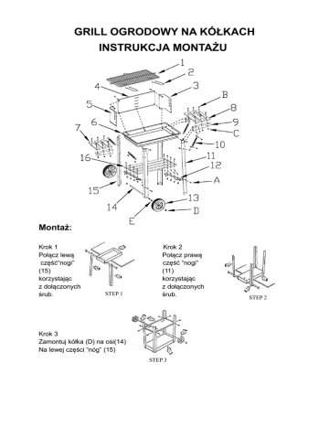 GRILL OGRODOWY NA KÓŁKACH INSTRUKCJA MONTAŻU Montaż: Krok 1 Połącz lewą część“nogi” (15) korzystając z dołączonych śrub. STEP 1 Krok 2 Połącz prawą część “nogi” (11) korzystając z dołączonych śrub. Krok 3 Zamontuj kółka (D) na osi(14) Na lewej części “nóg” (15) STEP 3 STEP 2 Krok 4 Zamontuj podpórki (9) do ramy grilla ( 6 ) Zamontuj drewniane uchwyty (7 & 8) do podpórki (9) STEP 4 Krok 5 Zamontuj osłonę(3 & 4 & 5) do ramy grilla(6) Krok 6 Zamontuj drewnianą podstawkę (16) do prowadnic (12) STEP 6 STEP 5 1) 2) 3) 4) Ostrzeżenie! Grill po rozpaleniu będzie bardzo gorący, nie ruszaj go w trakcie pracy! Nie używaj środków chemicznych typu beznzyna lub alkohol. Grill nie powinien być stosowany w pomieszczeniach. Dzieci oraz zwierzęta należy trzymać z dala od grilla.