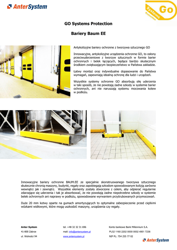 GO Systems Protection Bariery Baum EE Antykolizyjne bariery ochronne z tworzywa sztucznego GO Innowacyjne, antykolizyjne urządzenia ochronne GO, to osłony przeciwuderzeniowe z tworzyw sztucznych w formie barier ochronnych i belek łączących, będące bardzo skutecznym środkiem zwiększającym bezpieczeństwo w Państwa zakładzie. Łatwy montaż oraz indywidualne dopasowanie do Państwa wymagań, zapewniają idealną ochronę dla ludzi i urządzeń. Wszystkie systemy ochronne GO absorbują siłę uderzenia w taki sposób, że nie powstają żadne szkody w systemie barier ochronnych, ani nie naruszają systemu mocowania kotew w podłożu. Innowacyjne bariery ochronne BAUM.EE ze specjalnie skonstruowanego tworzywa sztucznego skutecznie chronią maszyny, budynki, regały oraz zapobiegają szkodom spowodowanym kolizją zarówno wewnątrz jak i zewnątrz. Wszystkie elementy zostały stworzone z celem, aby odpierać regularnie zdarzające się uderzenia i tak je absorbować, że nie powstają żadne niepotrzebne szkody w systemie belek ochronnych ani naprawy w podłożu, spowodowane wyrwaniem przyśrubowanych przymocowań. Duże 20 mm kotwy oparte na gumach amortyzujących to optymalne zabezpieczenie przed ciężkimi wózkami widłowymi, które mogą uszkodzić maszyny, urządzenia czy regały. Anter System tel. +48 32 32 31 696 Konto bankowe Bank Millennium S.A. 41-800 Zabrze mail: [email protected] PL52 1160 2202 0000 0002 4951 7236 ul. Wolności 94 www.antersystem.pl NIP PL: 754 255 77 02 Wyjmowane bariery BISF ANT Wyjmowane bariery ochronne BiSF ze specjalnie skonstruowanego tworzywa sztucznego dzięki swojej konstrukcji stanowią idealną i optymalną ochronę dla szafek na sprzęt elektroniczny, systemów komputerowych oraz obszarów dodatkowego wyposażenia maszynowego, umożliwiając jednocześnie szybki dostęp. Dzięki wyjmowanym barierom z serii produkcyjnej BiSF macie Państwo możliwość zmieniania ochrony na dwóch wysokościach, w zależności od indywidualnych potrzeb. Anter System tel. +48 32 32 31 696 Konto bankowe Bank Millennium S.A. 41-800 Zabrze mail: [email protected] PL52 1160 2202 0000 0002 4951 7236 ul. Wolności 94 www.antersystem.pl NIP PL: 754 255 77 02 Bariery podłogowe Nadzwyczaj wytrzymałe i solidne bariery podłogowe DE ze specjalnie skonstruowanego tworzywa sztucznego służą zarówno do odgradzania jak i oznakowania ciągów komunikacyjnych i stref niebezpieczeństwa, a także w celu zabezpieczenia przed szkodami na ścianach oraz pojazdach. Bariery podłogowe DE są mocowane w niewidoczny sposób, izolowane według IP55 i wykonane z odpornego na wietrzenie, statycznego i wytrzymałego tworzywa sztucznego. Bariery nie wymagają konserwacji oraz całkowicie podlegają utylizacji, nie są toksyczne według standardów HACCP i palne według przepisów UL94-V0. MATERIAŁ Specjalne tworzywo sztuczne "i-PLAST" jest nowoczesnym połączeniem tworzywa sztucznego na bazie tworzywa polimerowego, co pozwala na produkcję różnorodnych kształtów i geometrii. Profile "i-PLAST" charakteryzują się dużą zdolności deformacji nawet przy ekstremalnych uderzeniach, po czym wracając do swojej pierwotnej formy. 'i-PLAST" jest produktem niepalnym, zgodnie z wymogami rozporządzenia UL94-V0 oraz produktem nietoksycznym, zgodnym ze standardami HACCP. Dzięki temu, produkty wykonane z tego materiału są odpowiednie dla przedsiębiorstw, które wysoko cenią bezpieczeństwo i higienę pracy. Anter System tel. +48 32 32 31 696 Konto bankowe Bank Millennium S.A. 41-800 Zabrze mail: [email protected] PL52 1160 2202 0000 0002 4951 7236 ul. Wolności 94 www.antersystem.pl NIP PL: 754 255 77 02 Cennik systemów zabezpieczeń antykolizyjnych GO Nazwa Cena netto / 1 sztuka Bariera BAUM EE 1000 626,00 PLN Bariera BAUM EE 1500 826,00 PLN Bariera BAUM EE 2000 926,00 PLN Bariera BAUM EE 2500 994,00PLN Bariera BAUM EE 3000 1140,00 PLN Bariera BISF ANT 2000 1982,00 PLN Bariera podłogowa 40-1500 470,00 PLN Bariera podłogowa 60-1500 596,00 PLN Bariera podłogowa 80-1500 728,00 PLN Inne wymiary dostępne na zapytanie Koszt dostawy: do uzgodnienia Termin dostawy: do uzgodnienia Ważność: oferta ważna do 31.12.2014, bez zobowiązań Warunki płatności: 14 dni netto Podane ceny są cenami netto za sztukę. Transport do siedziby Państwa firmy gratis. Termin dostawy do uzgodnienia. Oferta bez zobowiązań, z zastrzeżeniem wcześniejszej sprzedaży. W przypadku pytań odnośnie innych naszych produktów, prosimy o kontakt. Jednocześnie zapraszamy do odwiedzenia naszego sklepu internetowego: www.antersystem.pl Anter System tel. +48 32 32 31 696 Konto bankowe Bank Millennium S.A. 41-800 Zabrze mail: [email protected] PL52 1160 2202 0000 0002 4951 7236 ul. Wolności 94 www.antersystem.pl NIP PL: 754 255 77 02
