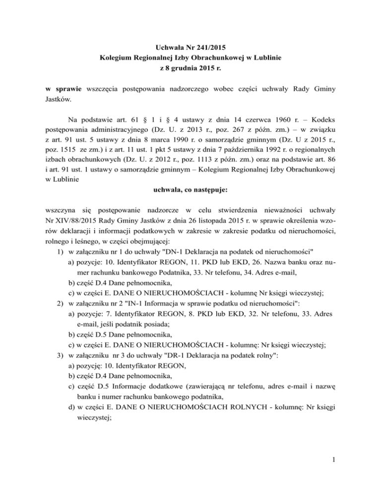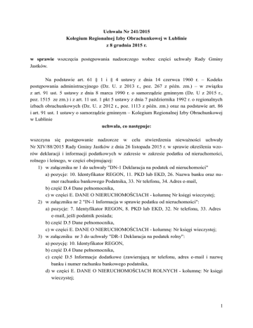 Uchwała Nr 241/2015 Kolegium Regionalnej Izby Obrachunkowej w Lublinie z 8 grudnia 2015 r. w sprawie wszczęcia postępowania nadzorczego wobec części uchwały Rady Gminy Jastków. Na podstawie art. 61 § 1 i § 4 ustawy z dnia 14 czerwca 1960 r. – Kodeks postępowania administracyjnego (Dz. U. z 2013 r., poz. 267 z późn. zm.) – w związku z art. 91 ust. 5 ustawy z dnia 8 marca 1990 r. o samorządzie gminnym (Dz. U z 2015 r., poz. 1515 ze zm.) i z art. 11 ust. 1 pkt 5 ustawy z dnia 7 października 1992 r. o regionalnych izbach obrachunkowych (Dz. U. z 2012 r., poz. 1113 z późn. zm.) oraz na podstawie art. 86 i art. 91 ust. 1 ustawy o samorządzie gminnym – Kolegium Regionalnej Izby Obrachunkowej w Lublinie uchwala, co następuje: wszczyna się postępowanie nadzorcze w celu stwierdzenia nieważności uchwały Nr XIV/88/2015 Rady Gminy Jastków z dnia 26 listopada 2015 r. w sprawie określenia wzorów deklaracji i informacji podatkowych w zakresie w zakresie podatku od nieruchomości, rolnego i leśnego, w części obejmującej: 1) w załączniku nr 1 do uchwały "DN-1 Deklaracja na podatek od nieruchomości" a) pozycje: 10. Identyfikator REGON, 11. PKD lub EKD, 26. Nazwa banku oraz numer rachunku bankowego Podatnika, 33. Nr telefonu, 34. Adres e-mail, b) część D.4 Dane pełnomocnika, c) w części E. DANE O NIERUCHOMOŚCIACH - kolumnę Nr księgi wieczystej; 2) w załączniku nr 2 "IN-1 Informacja w sprawie podatku od nieruchomości": a) pozycje: 7. Identyfikator REGON, 8. PKD lub EKD, 32. Nr telefonu, 33. Adres e-mail, jeśli podatnik posiada; b) część D.5 Dane pełnomocnika, c) w części E. DANE O NIERUCHOMOŚCIACH - kolumnę: Nr księgi wieczystej; 3) w załączniku nr 3 do uchwały "DR-1 Deklaracja na podatek rolny": a) pozycję: 10. Identyfikator REGON, b) część D.4 Dane pełnomocnika, c) część D.5 Informacje dodatkowe (zawierającą nr telefonu, adres e-mail i nazwę banku i numer rachunku bankowego podatnika, d) w części E. DANE O NIERUCHOMOŚCIACH ROLNYCH - kolumnę: Nr księgi wieczystej; 1 4) w załączniku nr 4 "IR-1 Informacja w sprawie podatku rolnego": a) pozycje: 10. Identyfikator REGON, 11. PKD lub EKD, 32. Nr telefonu, 33. Adres e-mail, jeśli podatnik posiada, b) część D.5 Dane pełnomocnika, c) w części E. DANE O NIERUCHOMOŚCIACH ROLNYCH - kolumnę: Nr księgi wieczystej; 5) w załączniku nr 5 do uchwały "DL-1 Deklaracja na podatek leśny": a) pozycję: 10. Identyfikator REGON, b) część D.4 Dane pełnomocnika, c) część D.5 Informacje dodatkowe (zawierającą nr telefonu, adres e-mail i nazwę banku i numer rachunku bankowego podatnika), d) w części E. DANE O NIERUCHOMOŚCIACH LEŚNYCH - kolumnę: Nr księgi wieczystej; 6) w załącznik nr 6 do uchwały "IL-1 Informacja w sprawie podatku leśnego": a) pozycję: 10. Identyfikator REGON, 39. Numer telefonu, 40. Adres e-mail, jeśli podatnik posiada, b) część D.4 Dane pełnomocnika, c) w części E. DANE O NIERUCHOMOŚCIACH LEŚNYCH - kolumnę: Nr księgi wieczystej; z powodu istotnego naruszenia art. 6 ust. 13 ustawy z dnia 12 stycznia 1991 r. o podatkach i opłatach lokalnych (Dz. U. z 2014 r., poz. 849 z późn. zm.), art. 6a ust. 11 ustawy z dnia 15 listopada 1984 r. o podatku rolnym (Dz. U. z 2013 r. poz. 1381 z późn. zm.), art. 6 ust. 9 ustawy z dnia 30 października 2002 r. o podatku leśnym (Dz. U. z 2013 r. poz. 465 z późn. zm.). U ZASADN I E NI E Kolegium Regionalnej Izby Obrachunkowej w Lublinie, po zbadaniu doręczonej 2 grudnia 2015 r. uchwały Rady Gminy Jastków, o której mowa w sentencji, stwierdziło, że została ona podjęta w części z istotnym naruszeniem prawa. Ocenianą uchwałą Rada Gminy określiła wzory deklaracji oraz informacji na podatek od nieruchomości, rolny i leśny (stanowiące załączniki nr 1 – 6 do uchwały). We wszystkich tych załącznikach w częściach wskazanych w osnowie wszczęcia postępowania Rada wykroczyła poza zakres delegacji z art. 6 ust. 13 ustawy o podatkach i opłatach lokalnych, art. 6a ust. 11 ustawy o podatku rolnym oraz art. 6 ust. 9 ustawy o podatku leśnym. Zgodnie z ich treścią organ stanowiący określa wzory formularzy, w których zawarte będą dane dotyczące podmiotu i przedmiotu opodatkowania niezbędne do wymiaru i poboru podatku od nieruchomości. Zdaniem Kolegium obowiązek podawania przez podatników danych, o których mowa w sentencji, wykracza poza wskazany zakres delegacji; nie są one bowiem niezbędne do wymiaru i poboru podatków. 2 Podawanie takich danych przez podatników – zdaniem Kolegium – mogłoby odbywać się jedynie na zasadzie dobrowolności. Ponadto Kolegium stwierdza, że zamieszczane w załącznikach nr 1 - 6 w częściach B tych formularzy objaśnienie, że „Podatnik ma obowiązek złożenia wraz z korektą deklaracji/informacji pisemnego uzasadnienia przyczyny korekty - art. 81 ustawy Ordynacja podatkowa” nie uwzględniają zmiany wprowadzonej ustawą z dnia 10 września 2015 r. o zmianie ustawy – Ordynacja podatkowa oraz niektórych innych ustaw (Dz. U. z 2015 r. poz. 1649), która będzie obowiązywać od 1 stycznia 2016 r. Mocą tej ustawy został znowelizowany przepis art. 81 § 2 ustawy z dnia 29 sierpnia 1997 r. Ordynacja podatkowa (Dz. U. z 2015 r., poz. 613 z późn. zm.), z treści którego wykreślono obowiązek dołączania do korekty deklaracji lub informacji pisemnego uzasadnienia przyczyn korekty. Tym samym żądanie uzasadnienia korekty deklaracji/informacji, w sytuacji, gdy takiego uzasadnienia nie przewidują przepisy powszechnie obowiązującego prawa jest wadliwe. Jednakże Kolegium nie postrzega powyższego zapisu jako istotnego naruszenia prawa i postępowanie nadzorcze z tego tytułu nie jest wszczynane. Rada Gminy Jastków powinna wskazaną nieprawidłowość usunąć we własnym zakresie na najbliższej sesji rady gminy, poprzez stosowna zmianę uchwały. Kolegium Regionalnej Izby Obrachunkowej w Lublinie informuje, że w toku postępowan