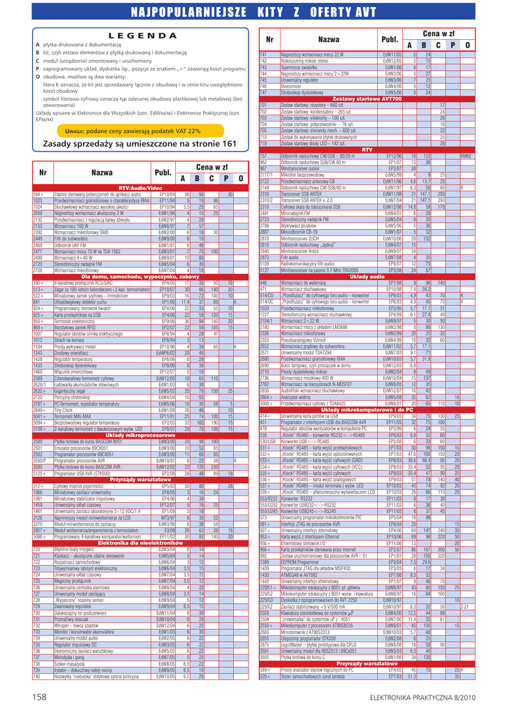 NA J P O P U L A R NI EJSZE KIT Y Z OFERT Y AVT L E G E N D A Nr A płytka drukowana z dokumentacją B kit, czyli zestaw elementów z płytką drukowaną i dokumentacją C moduł (urządzenie) zmontowany i uruchomiony P zaprogramowany układ, dyskietka itp., pozycje ze znakiem „+” zawierają koszt programu O obudowa, możliwe są dwa warianty: litera K oznacza, że kit jest sprzedawany łącznie z obudową i w cenie kitu uwzględniono koszt obudowy symbol literowo-cyfrowy oznacza typ zalecanej obudowy plastikowej lub metalowej (bez otworowania) Układy opisane w Elektronice dla Wszystkich (ozn. EdWxx/xx) i Elektronice Praktycznej (ozn. EPxx/xx) Uwaga: podane ceny zawierają podatek VAT 22% Zasady sprzedaży są umieszczone na stronie 161 Nr 594+ 1023 1024 2050 2132 2153 2392 2449 2469 2477 2499 2723 2728 390+ 513+ 522+ 841 924+ 925+ 950+ 969+ 1007 1012 1104 1343 1428 1435 1460 2389 2628/1 2632+ 2720 2787+ 2849+ 5041+ 5094+ 5108+ 2500 2501 2502 2550/P 3500 5125+ 512+ 1066 1081 1459 1461 2126 2270 2857+ 5086+ 720 721 722 723 724 725 726 727 728 729 730 731 732 733 734 735 736 737 738 739 740 158 Nazwa Publ. Cena w zł A B RTV/Audio/Video Zdalnie sterowany potencjometr do aplikacji audio EP10/04 38 90 Przedwzmacniacz gramofonowy o charakterystyce RIAA EP11/94 5 19 Słuchawkowy wzmacniacz wysokiej jakości EP10/94 5,5 25 Najprostszy wzmacniacz akustyczny 3 W EdW1/96 4 15 Przedwzmacniacz z regulacją barwy dźwięku EdW2/97 4 20 Wzmacniacz 100 W EdW8/97 7 57 Wzmacniacz mikrofonowy SMD EdW2/00 6 18 Filtr do subwoofera EdW9/00 6 18 Odbiornik UKF FM EdW1/01 6 48 Wzmacniacz mocy 70 W na TDA 1562 EdW3/01 7 70 Wzmacniacz 4×40 W EdW9/01 10 80 Stereofoniczny nadajnik FM EdW5/04 6 30 Wzmacniacz mikrofonowy EdW7/04 4 18 Dla domu, samochodu, wypoczynku, zabawy 8-kanałowy przełącznik RC5/SIRC EP4/05 17 35 Zegar ze 100-letnim kalendarzem i 2-kan. termometrem EP10/07 30 86 Miniaturowy zamek szyfrowy – Immobilizer EP9/03 16 72 Ultradźwiękowy detektor ruchu EP1/00 11,4 37 Programowany sterownik świateł EP4/06 22 33 Karta przekaźników na USB EP4/06 22 58 Termostat elektroniczny EP9/06 36 94 Bezstykowy zamek RFID EP2/07 22 59 Regulator obrotów silnika elektrycznego EP8/94 4 29 Strach na komary EP8/94 3 13 Prosty wykrywacz metali EP10/96 4 34 Diodowy oświetlacz EdWP6/02 20 40 Regulator temperatury EP6/06 6 29 Stroboskop dyskotekowy EP8/06 6 38 Włącznik zmierzchowy EP12/07 5 18 Czterokanałowy termometr cyfrowy EdW12/00 10 65 Ładowarka akumulatorów ołowiowych EdW1/03 6 30 Gigantyczny zegar EdW5/02 35 70 Policyjny stroboskop EdW4/04 10 55 PC-Termometr, rejestrator temperatury EdW5/06 10 30 Tiny Clock EdW1/08 26 46 Termometr MIN-MAX EP11/01 25 74 Bezprzewodowy regulator temperatury EP2/03 32 160 2-kanałowy termometr z dwukolorowym wyśw. LED EP8/07 29 78 Układy mikroprocesorowe Płytka testowa do kursu BASCOM 8051 EdW3/00 20 98 Emulator procesorów 89CX051 EdW3/00 10 52 Programator procesorów 89CX051 EdW3/00 11 60 Programator procesorów AVR EdW10/01 6 23 Płytka testowa do kursu BASCOM AVR EdW12/02 22 120 Programator USB AVR (STK500) EP2/08 28 48 Przyrządy warsztatowe Cyfrowy miernik pojemności EP5/03 30 80 Miniaturowy zasilacz uniwersalny EP8/95 3 16 Miniaturowy stabilizator impulsowy EP4/96 4 34 Uniwersalny układ czasowy EP12/07 5 16 Uniwersalny zasilacz laboratoryjny 5 i 12 VDC/1 A EP1/08 5 18 Najmniejszy moduł miniwoltomierza na LCD MT3/97 6 30 Moduł miliwoltomierza do zasilaczy EdW3/98 6 36 Moduł woltomierza/amperomierza z termostatem E3/08 26 62 Programowany 4-kanałowy komparator/woltomierz EP11/02 30 82 Elektronika dla nieelektroników Błękitno-biały mrygacz EdW5/04 6 14 Klaskacz – akustyczne zdalne sterowanie EdW5/04 5 14 Rozjaśniacz samochodowy EdW6/04 3 12 Trójwymiarowy labirynt elektroniczny EdW6/04 3,5 15 Uniwersalny układ czasowy EdW7/04 3,5 11 Magiczny przełącznik EdW7/04 3,5 12 Uniwersalna centralka alarmowa EdW8/04 4 20 Uniwersalny moduł zasilający EdW8/04 3,5 14 „Wypasiony” scalony sensor EdW9/04 5 12 Zwariowany kręciołek EdW9/04 6,5 15 Dalekosiężny tor podczerwieni EdW11/04 8 30 Przeraźliwy straszak EdW10/04 6 28 Whisper – łowca szeptów EdW12/04 6 25 Monitor i konserwator akumulatora EdW1/05 6 30 Uniwersalny moduł audio EdW2/05 6 22 Regulator impulsowy DC EdW3/05 6 22 Ekonomiczny zasilacz warsztatowy EdW5/05 6 22 Melodyjka i gong EdW7/05 5 20 Szoker-masażysta EdW8/05 6,5 22 Irytator – dokuczliwy natręt nocny EdW9/05 6,5 18 Niezwykła “niebieska” dotykowa syrena policyjna EdW10/05 6,5 25 C 46 65 25 P O 30 30 100 50 140 100 69 55 120 140 105 47 10 20 10 10 15 20 15 65 K K 110 150 25 58 5 10 15 15 15 100 190 106 180 65 85 38 230 89 24 K 18 28 25 52 58 26 140 18 20 741 742 743 744 745 746 747 701 702 703 704 705 710 719 157 962 967 2117/1 2122 2148 2310 2310/2 2318 2481 2723 2788 2807 2810 2818 2840 2873 5109 5127 446 471 514/CO 514/OC 1033 1227 2104/1 2180 2326 2353 2652 2671 2680 2690 2710 2736 2762 2850 2864+ 3008+ 414+ 451 478 530 530/USB 531+ 532+ 533+ 534+ 535+ 536+ 537+ 538+ 553/R232 553/U232 553/U245 573 581+ 927+ 953+ 956+ 966+ 992 1389 1409 1430 1443 2250\1+ 2250\2 2250\D 2250\Z 2503 2504 2550+ 2683 2855 2875 3501 3505 389+ 520+ Nazwa Publ. Najprostszy wzmacniacz mocy 22 W EdW11/05 Niskoszumny mikser stereo EdW12/05 Tajemnicze światełko EdW1/06 Najprostszy wzmacniacz mocy 2×22W EdW2/06 Uniwersalny regulator EdW3/06 Ekonomizer EdW4/06 Stroboskop dyskotekowy EdW5/06 Zestawy startowe AVT700 Zestaw startowy: rezystory – 660 szt. Zestaw startowy: kondensatory – 265 szt. Zestaw startowy: elektrolity – 100 szt. Zestaw startowy: półprzewodniki – 76 szt. Zestaw startowy: elementy mech. – 600 szt. Zestaw do wykonywania płytek drukowanych Zestaw startowy diody LED – 142 szt. RTV Odbiornik nasłuchowy CW/SSB – 80/20 m EP12/96 Odbiornik nasłuchowy SSB/CW 80 m EP1/07 Minitransceiver Junior EP2/07 Mikrofon bezprzewodowy EdW5/99 Przedwzmacniacz antenowy CB EdW11/96 Odbiornik nasłuchowy CW-SSB/80 m EdW7/97 Transceiver 