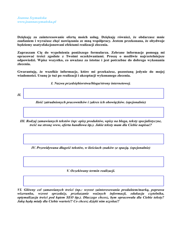 Joanna Szymańska www.joannaszymańska.pl Dziękuję za zainteresowanie ofertą moich usług. Dziękuję również, że obdarzasz mnie zaufaniem i wyrażasz chęć nawiązania ze mną współpracy. Jestem przekonana, że obydwoje będziemy usatysfakcjonowani efektami realizacji zlecenia. Zapraszam Cię do wypełnienia poniższego formularza. Zebrane informacje pomogą mi opracować treści zgodnie z Twoimi oczekiwaniami. Proszę o możliwie najrzetelniejsze odpowiedzi. Wpisz wszystko, co uważasz za istotne i jest potrzebne do dobrego wykonania zlecenia. Gwarantuję, że wszelkie informacje, które mi przekażesz, pozostaną jedynie do mojej wiadomości. Usunę je tuż po realizacji i akceptacji wykonanego zlecenia. I. Nazwa przedsiębiorstwa/bloga/strony internetowej. II. Ilość zatrudnionych pracowników i zakres ich obowiązków. (opcjonalnie) III. Rodzaj zamawianych tekstów (np: opisy produktów, wpisy na bloga, teksty specjalistyczne, treść na stronę www, oferta handlowa itp.). Jakie teksty mam dla Ciebie napisać? IV. Przewidywana długość tekstów, w ilościach znaków ze spacją. (opcjonalnie) V. Oczekiwany termin realizacji. VI. Główny cel zamawianych treści (np.: wzrost zainteresowania produktem/marką, poprawa wizerunku, wzrost sprzedaży, przekazanie ważnych informacji, edukacja czytelnika, optymalizacja treści pod kątem SEO itp.). Dlaczego chcesz, bym opracowała dla Ciebie teksty? Jaką będą miały dla Ciebie wartość? Co chcesz dzięki nim uzyskać? VII. Charakterystyka docelowej grupy odbiorców treści. (wiek, wykształcenie, miasto, zainteresowania, zawód, potrzeby, oczekiwania itp.) Dla kogo pisane są teksty? Kogo mogą zainteresować? Dla kogo będą ważne i przydatne? Określ możliwe najdokładniej „typ idealnego odbiorcy treści”. VIII. Przewidywane formy dystrybucji zamawianych treści (np.: strona internetowa, blog, e-mail ulotka drukowana itp.) Gdzie zostaną opublikowane teksty? IX. Planowane rodzaje promocji strony/bloga/usługi/produktu itp. (np. marketing w wyszukiwarkach, social media, artykuł w gazecie drukowanej itp. X. Najważniejsze atuty opisywanego produktu oferty/usługi/firmy. (ważne, jeżeli zamawiasz teksty typowo marketingowe, np. ofertę handlową). XI. Słabe strony opisywanego produktu/oferty/firmy itp.. Niedoskonałości, które mogą stanowić przeszkodę w osiągnięciu celu, które mogą sprawić, że odbiorcy nie będą zainteresowani Twoją produktem, firmą. (ważne, jeżeli zamawiasz teksty typowo marketingowe, np. ofertę handlową). XII. Twoja konkurencja. Firmy, osoby, które realizują podobne projekty, sprzedają podobne towary/ usługi itp. (ważne, jeżeli zamawiasz teksty typowo marketingowe, np. ofertę handlową). XIII. Słabe strony Twojej konkurencji. Czy, w jakim stopniu i zakresie przewyższasz konkurencję? (Np. lepszy produkty, niższa cena, większa baza klientów, skuteczniejsza promocja itp.) XIV. Jakich treści wolisz unikać? Co na pewno nie spełni Twoich oczekiwań? XV. Inne istotne informacje, które chcesz mi przekazać, a których nie uwzględniłam powyżej: XVI. Preferujesz umowę o dzieło z przekazaniem praw majątkowych, fakturę VAT czy może proponujesz inną formę zabezpieczenia naszej współpracy? Dziękuję!