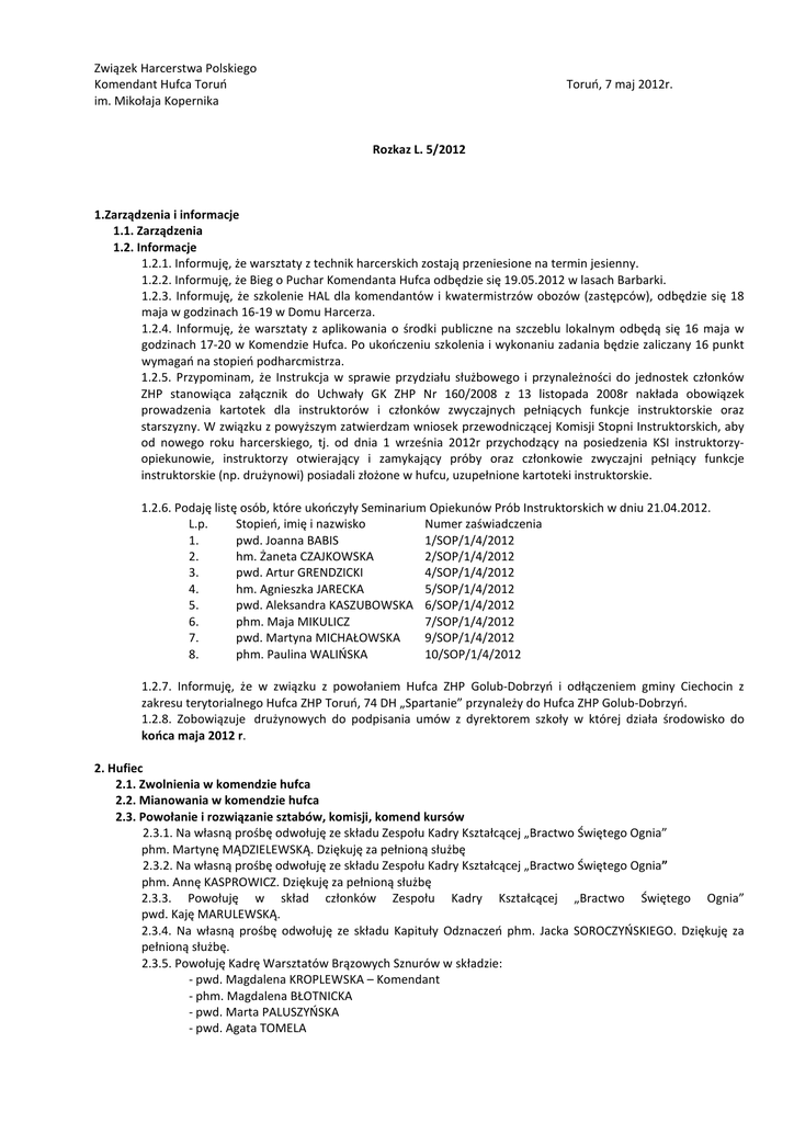 Związek Harcerstwa Polskiego Komendant Hufca Toruń im. Mikołaja Kopernika Toruń, 7 maj 2012r. Rozkaz L. 5/2012 1.Zarządzenia i informacje 1.1. Zarządzenia 1.2. Informacje 1.2.1. Informuję, że warsztaty z technik harcerskich zostają przeniesione na termin jesienny. 1.2.2. Informuję, że Bieg o Puchar Komendanta Hufca odbędzie się 19.05.2012 w lasach Barbarki. 1.2.3. Informuję, że szkolenie HAL dla komendantów i kwatermistrzów obozów (zastępców), odbędzie się 18 maja w godzinach 16-19 w Domu Harcerza. 1.2.4. Informuję, że warsztaty z aplikowania o środki publiczne na szczeblu lokalnym odbędą się 16 maja w godzinach 17-20 w Komendzie Hufca. Po ukończeniu szkolenia i wykonaniu zadania będzie zaliczany 16 punkt wymagań na stopień podharcmistrza. 1.2.5. Przypominam, że Instrukcja w sprawie przydziału służbowego i przynależności do jednostek członków ZHP stanowiąca załącznik do Uchwały GK ZHP Nr 160/2008 z 13 listopada 2008r nakłada obowiązek prowadzenia kartotek dla instruktorów i członków zwyczajnych pełniących funkcje instruktorskie oraz starszyzny. W związku z powyższym zatwierdzam wniosek przewodniczącej Komisji Stopni Instruktorskich, aby od nowego roku harcerskiego, tj. od dnia 1 września 2012r przychodzący na posiedzenia KSI instruktorzyopiekunowie, instruktorzy otwierający i zamykający próby oraz członkowie zwyczajni pełniący funkcje instruktorskie (np. drużynowi) posiadali złożone w hufcu, uzupełnione kartoteki instruktorskie. 1.2.6. Podaję listę osób, które ukończyły Seminarium Opiekunów Prób Instruktorskich w dniu 21.04.2012. L.p. Stopień, imię i nazwisko Numer zaświadczenia 1. pwd. Joanna BABIS 1/SOP/1/4/2012 2. hm. Żaneta CZAJKOWSKA 2/SOP/1/4/2012 3. pwd. Artur GRENDZICKI 4/SOP/1/4/2012 4. hm. Agnieszka JARECKA 5/SOP/1/4/2012 5. pwd. Aleksandra KASZUBOWSKA 6/SOP/1/4/2012 6. phm. Maja MIKULICZ 7/SOP/1/4/2012 7. pwd. Martyna MICHAŁOWSKA 9/SOP/1/4/2012 8. phm. Paulina WALIŃSKA 10/SOP/1/4/2012 1.2.7. Informuję, że w związku z powołaniem Hufca ZHP Golub-Dobrzyń i odłączeniem gminy Ciechocin z zakresu terytorialnego Hufca ZHP Toruń, 74 DH „Spartanie” przynależy do Hufca ZHP Golub-Dobrzyń. 1.2.8. Zobowiązuje drużynowych do podpisania umów z dyrektorem szkoły w której działa środowisko do końca maja 2012 r. 2. Hufiec 2.1. Zwolnienia w komendzie hufca 2.2. Mianowania w komendzie hufca 2.3. Powołanie i rozwiązanie sztabów, komisji, komend kursów 2.3.1. Na własną prośbę odwołuję ze składu Zespołu Kadry Kształcącej „Bractwo Świętego Ognia” phm. Martynę MĄDZIELEWSKĄ. Dziękuję za pełnioną służbę 2.3.2. Na własną prośbę odwołuję ze składu Zespołu Kadry Kształcącej „Bractwo Świętego Ognia” phm. Annę KASPROWICZ. Dziękuję za pełnioną służbę 2.3.3. Powołuję w skład członków Zespołu Kadry Kształcącej „Bractwo Świętego Ognia” pwd. Kaję MARULEWSKĄ. 2.3.4. Na własną prośbę odwołuję ze składu Kapituły Odznaczeń phm. Jacka SOROCZYŃSKIEGO. Dziękuję za pełnioną służbę. 2.3.5. Powołuję Kadrę Warsztatów Brązowych Sznurów w składzie: - pwd. Magdalena KROPLEWSKA – Komendant - phm. Magdalena BŁOTNICKA - pwd. Marta PALUSZYŃSKA - pwd. Agata TOMELA - dh Kamil DYBOWSKI 2.3.6. Powołuję Kadrę Kursu Kadr Drużyn w składzie: - pwd. Monika KUBACKA-Komendant - pwd. Martyna MICHAŁOWSKA -phm. Joanna PROSZEK - pwd. Anita PATALAS - pwd. Marta PALUSZYŃSKA 2.3.7. Powołuję na funkcję Zastępcy Przewodniczącej Komisji Stopni Instruktorskich – hm. Żanetę CZAJKOWSKĄ. 2.3.8. Powołuję w skład członków Komisji Stopni Instruktorskich Hufca – phm. Martę DOMAGALSKĄ. 3. Drużyny 3.1. Nadanie imion, nazw, sztandarów 3.1.1. Nadaje numer 74 WGZ „Młode Wilki” 3.2. Zmiany organizacyjne 3.2.1. Zamykam z wynikiem pozytywnym okres próbny 74 WGZ „Młode Wilki” 3.2.2. Zamykam z wynikiem negatywnym okres próbny p. 45 TDH "Lwy Judy" 3.3. Zwolnienia i mianowania drużynowych 3.3.1. Zwalniam z funkcji drużynowej Chabrowej 18 TDH-ek „LAS im. E. Plater pwd. Martę BALIŃSKĄ 3.3.2. Zwalniam z funkcji drużynowego p. 45 TDH „Lwy Judy” pwd. Karola BUGUSZEWSKIEGO 3.3.3. Mianuję na funkcję drużynowej Chabrowej 18 TDH-ek „LAS im. E. Plater phm. Annę KASPROWICZ 4. Kręgi 4.1. Rozwiązania i powołania kręgów 4.2. Zwolnienia i mianowania w kręgach 4.3. Nadanie imion, nazw 5. Szczepy, związki drużyn 5.1. Nadanie imion, nazw, sztandarów 5.2. Powołania i rozwiązania szczepów, związków drużyn 5.3. Zwolnienia i mianowania w szczepach, związkach drużyn 6. Harcerska Akcja Letnia i Zimowa 6.1. Zwolnienia i mianowania komendantów 7. Mianowania instruktorów 7.1. Zamknięcia próby na stopień przewodniczki/przewodnika 7.1.1. Na wniosek Hufcowej Komisji Stopni Instruktorskich zamykam pozytywnie próbę na stopień przewodnika i dopuszczam do złożenia Zobowiązania Instruktorskiego Druhnę Ewę MARKIEWICZ. Dziękuje phm. Zdzisławowi GRABOWSKIEMU za pełnienie roli opiekuna próby. 7.1.2. Na wniosek Hufcowej Komisji Stopni Instruktorskich zamykam negatywnie próbę na stopień przewodnika HO. Darii BAS. Opiekun – phm. Łukasz RACŁAWSKI. 7.1.3. Na wniosek Hufcowej Komisji Stopni Instruktorskich zamykam negatywnie próbę na stopień przewodnika sam. Katarzynie KWIATKOWSKIEJ. Opiekun – phm. Artur MAJEROWSKI. 7.2. Otwarcie próby na stopień przewodniczki/przewodnika 7.2.1. Na wniosek Hufcowej Komisji Stopni Instruktorskich otwieram z dniem 05.03.2012r. próbę na stopień przewodnika sam. Izabeli MALINOWSKIEJ. Opiekun próby – phm. Alicja STAŃCO. 7.3. Zamknięcie próby na stopień podharcmistrzyni/podharcmistrza 7.3.1. Na wniosek Hufcowej Komisji Stopni Instruktorskich zamykam próbę pozytywnie i przyznaję stopień podharcmistrza – pwd. Joannie PROSZEK. Dziękuję hm. Adamowi ZIÓŁKOWSKIEMU za pełnienie roli opiekuna próby. 7.4. Otwarcie próby na stopień podharcmistrzyni/podharcmistrza 7.4.1. Na 