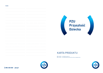 Notatki PZU Przyszłość Dziecka KARTA PRODUKTU KOD: J4IP41 – ze składką regularną KOD: J4IR41 – ze składką opłaconą do końca okresu ubezpieczenia 801 102 102 pzu.pl UBEZPIECZENIE PZU PRZYSZŁOŚĆ DZIECKA TO PRZEDE WSZYSTKIM •• Finansowe wsparcie potrzeb dziecka – pełnoletnie dziecko otrzyma pieniądze, które będzie mogło przeznaczyć na dowolny cel, np. opłacenie studiów. •• Bezpieczeństwo finansowe dziecka – w przypadku śmierci rodzica lub opiekuna składki nie będą opłacane, a mimo to z końcem umowy dziecko otrzyma pieniądze z ubezpieczenia. NAJWAŻNIEJSZE ATUTY •• Możliwość zawarcia ubezpieczenia przez dowolną osobę Nie tylko rodzice mogą zabezpieczyć swoje dziecko – również osoby niespokrewnione mogą w ten sposób sprawić prezent np. swojemu chrześniakowi. •• Wypłata dla pełnoletniego dziecka W trakcie ubezpieczenia to rodzic bądź inna osoba, która funduje polisę, ma cały czas kontrolę nad wpłacanymi pieniędzmi. Dopiero z końcem ubezpieczenia właścicielem pieniędzy staje się pełnoletnie dziecko. •• Zwolnienie z podatku W przypadku śmierci ubezpieczonego, kwota wypłacona dziecku po zakończeniu ubezpieczenia będzie wolna od: -- podatku od spadków i darowizn -- podatku od dochodów kapitałowych. •• Dodatkowe pieniądze – w obawie np. przed rakiem lub zawałem Dzięki dodatkowym opcjom można ubezpieczyć się na wypadek ciężkiej choroby i otrzymać pieniądze, np. w razie zachorowania na nowotwór złośliwy lub zawał serca. Leczenie najczęściej bywa kosztowne, dlatego warto mieć dodatkowe finansowe wsparcie. •• Dodatkowe zabezpieczenie – renta dla dziecka Jedna z dodatkowych opcji to ubezpieczenie rentowe, w którym PZU zobowiązuje się co miesiąc wypłacać dziecku rentę – do końca ubezpieczenia (w przypadku śmierci rodzica albo opiekuna) lub do końca życia dziecka, jeśli ulegnie ono nieszczęśliwemu wypadkowi i będzie niepełnosprawne. CZĘSTE PYTANIA 1.Czy po rozwodzie nowy opiekun mojego dziecka będzie miał jakieś prawo do pieniędzy? Nie. Z końcem ubezpieczenia pieniądze zostają wypłacone wyłącznie pełnoletniemu dziecku. W trakcie trwania ubezpieczenia to fundator polisy (tzw. ubezpieczający) ma 801 102 102 pzu.pl pełną kontrolę nad pieniędzmi z polisy. Nawet w przypadku przedwczesnej śmierci ubezpieczonego pieniądze z ubezpieczenia zostaną wypłacone dopiero z końcem ubezpieczenia – i wyłącznie dziecku. 2.W jaki sposób PZU dopisuje do mojej polisy dodatkowe zyski? PZU inwestuje część otrzymanych składek odkładanych na przyszłą wypłatę. Jeśli inwestycja okaże się korzystna i przekroczy zakładany wskaźnik – powstałą nadwyżką zysków PZU dzieli się z klientami. Jest to tzw. udział w zyskach. Udział w zyskach przyznawany jest proporcjonalnie do pieniędzy odłożonych na polisie na poczet przyszłej wypłaty (tzw. rezerwa). Przyznany udział w zyskach dopisywany jest jako dodatkowa suma ubezpieczenia, która powiększa przyszłą wypłatę dla klienta. Udział z zyskach jest przyznawany co roku, o ile PZU osiągnie odpowiednie zyski. 3.Czy mogę zrezygnować z ubezpieczenia? Czy dostanę wtedy jakieś pieniądze? Niezależnie od powodów można odstąpić od umowy w ciągu 30 dni od zawarcia ubezpieczenia, a w przypadku przedsiębiorców – w ciągu 7 dni. W takim przypadku PZU zwróci wpłaconą składkę, pomniejszoną za okres, w którym udzielana była ochrona. Po tym czasie w każdym momencie można zrezygnować z ubezpieczenia, przy czym jeśli stanie się to: -- przed upływem 2 lat od początku ubezpieczenia, a składka była opłacania okresowo – PZU nie zwróci żadnych pieniędzy; jeśli zaś składka była opłacana jednorazowo – zrealizowany zostanie wykup ubezpieczenia; -- po upływie 2 lat od początku ubezpieczenia – niezależnie od tego, w jaki sposób była opłacona składka, zostanie zrealizowany wykup ubezpieczenia. W każdą rocznicę ubezpieczenia PZU informuje o wartości wykupu na dany moment ubezpieczenia. 4.Co się stanie, jeśli zapomnę opłacić składkę? Jeśli stanie się to przed upływem 2 lat od początku ubezpieczenia, PZU wskaże dodatkowy termin na wpłatę zaległości. Brak dopłaty w tym dodatkowym terminie spowoduje zakończenie ubezpieczenia. Po upływie 2 lat od początku ubezpieczenia można zawiesić opłacanie składek, na maksymalnie 6 miesięcy – wystarczy pisemnie poinformować o tym PZU. Ponadto po upływie 2 lat od początku ubezpieczenia można zamienić ubezpieczenie na bezskładkowe. Oznacza to, że nie trzeba dalej opłacać składek, ale zmiana taka spowoduje obniżenie sumy ubezpieczenia i będzie nieodwracalna. WAŻNE SZCZEGÓŁY Co zapewnia to ubezpieczenie? PRZYKŁAD PZU ubezpiecza życie ubezpieczonego (rodzica lub innej osoby, która funduje polisę). W przypadku śmierci ubezpieczonego oraz w razie osiągnięcia przez uposażone dziecko końca okresu ubezpieczenia – pieniądze zostaną wypłacone uposażonemu dziecku Wiek ubezpieczonego w momencie startu ubezpieczenia 18–55 lat (składki okresowe), 18–70 lat (składka opłacona jednorazowo do końca). (Patrz: „wiek polisowy” w OWU) Wiek uposażonego dziecka w momencie startu ubezpieczenia Nieukończone 18 lat Miminalny i maksymalny okres ubezpieczenia W przypadku składki okresowej oraz płatnej jednorazowo do końca okresu ubezpieczenia: • mnimum 5 lat, maksimum 25 lat, ale nie dłużej niż do rocznicy umowy, kiedy ubezpieczony ukończy 75. r.ż.; • uposażone dziecko w momencie osiągnięcia końca okresu ubezpieczenia musi mieć ukończone 18 lat, i nieprzekroczone 25 lat Dostępne umowy dodatkowe Leczenie szpitalne (LSIP40); dostępne w 4 wariantach: 1) pobyt w szpitalu spowodowany NW, pobyt na OIT w NW; 2) pobyt w szpitalu spowodowany NW, pobyt na OIT w NW; świadczenie rekonwalescencyjne 5% SU jednorazowo; 3) pobyt w szpitalu spowodowany NW lub chorobą, pobyt na OIT w NW; 4) po