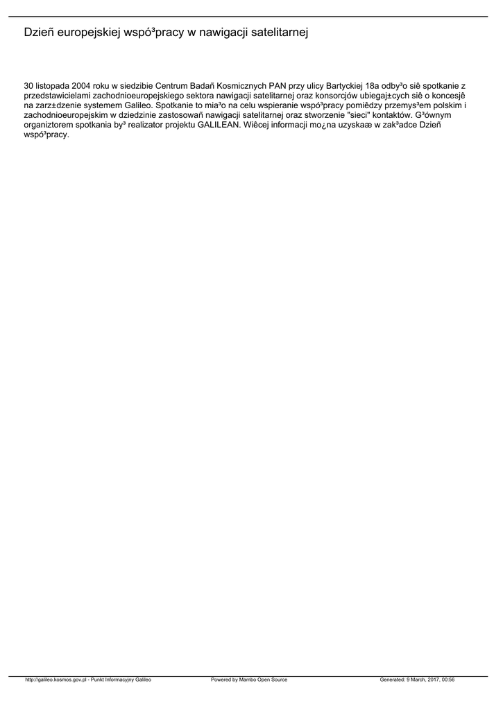 Dzieñ europejskiej wspó³pracy w nawigacji satelitarnej 30 listopada 2004 roku w siedzibie Centrum Badañ Kosmicznych PAN przy ulicy Bartyckiej 18a odby³o siê spotkanie z przedstawicielami zachodnioeuropejskiego sektora nawigacji satelitarnej oraz konsorcjów ubiegaj±cych siê o koncesjê na zarz±dzenie systemem Galileo. Spotkanie to mia³o na celu wspieranie wspó³pracy pomiêdzy przemys³em polskim i zachodnioeuropejskim w dziedzinie zastosowañ nawigacji satelitarnej oraz stworzenie "sieci" kontaktów. G³ównym organiztorem spotkania by³ realizator projektu GALILEAN. Wiêcej informacji mo¿na uzyskaæ w zak³adce Dzieñ wspó³pracy. http://galileo.kosmos.gov.pl - Punkt Informacyjny Galileo Powered by Mambo Open Source Generated: 9 March, 2017, 00:56