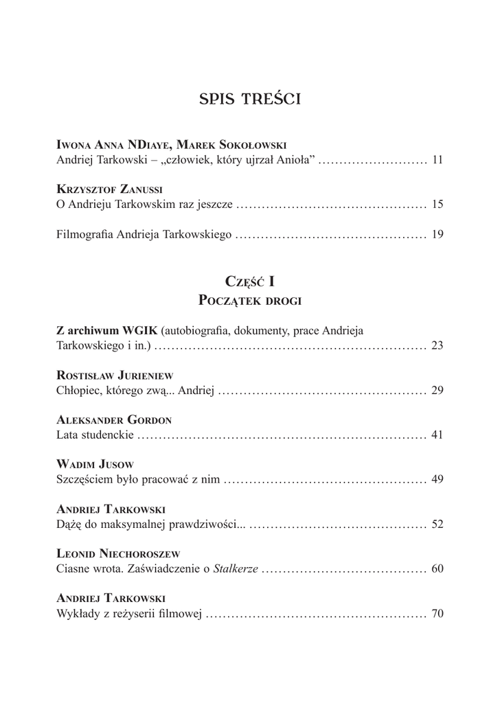 Spis treści Iwona Anna NDiaye, Marek Sokołowski Andriej Tarkowski – „człowiek, który ujrzał Anioła” . . . . . . . . . . . . . . . . . . . . . . . . . . 11 Krzysztof Zanussi O Andrieju Tarkowskim raz jeszcze . . . . . . . . . . . . . . . . . . . . . . . . . . . . . . . . . . . . . . . . . . . . . 15 Filmografia Andrieja Tarkowskiego . . . . . . . . . . . . . . . . . . . . . . . . . . . . . . . . . . . . . . . . . . . . . 19 Część I Początek drogi Z archiwum WGIK (autobiografia, dokumenty, prace Andrieja Tarkowskiego i in.) . . . . . . . . . . . . . . . . . . . . . . . . . . . . . . . . . . . . . . . . . . . . . . . . . . . . . . . . . . . . . . . . 23 Rostisław Jurieniew Chłopiec, którego zwą... Andriej . . . . . . . . . . . . . . . . . . . . . . . . . . . . . . . . . . . . . . . . . . . . . . . . . 29 Aleksander Gordon Lata studenckie . . . . . . . . . . . . . . . . . . . . . . . . . . . . . . . . . . . . . . . . . . . . . . . . . . . . . . . . . . . . . . . . . . . . 41 Wadim Jusow Szczęściem było pracować z nim . . . . . . . . . . . . . . . . . . . . . . . . . . . . . . . . . . . . . . . . . . . . . . . . 49 Andriej Tarkowski Dążę do maksymalnej prawdziwości... . . . . . . . . . . . . . . . . . . . . . . . . . . . . . . . . . . . . . . . . . . 52 Leonid Niechoroszew Ciasne wrota. Zaświadczenie o Stalkerze . . . . . . . . . . . . . . . . . . . . . . . . . . . . . . . . . . . . . . . 60 Andriej Tarkowski Wykłady z reżyserii filmowej . . . . . . . . . . . . . . . . . . . . . . . . . . . . . . . . . . . . . . . . . . . . . . . . . . . . 70 Spis treści Аndriej Tarkowski o sztuce filmowej. Ostatni wywiad . . . . . . . . . . . . . 128 Z Dziennika Andrieja Tarkowskiego ............ . . . . . . . . . . . . . . . . . . . . . . . . . . . . . . . . 131 Ebbo Demant W poszukiwaniu straconego czasu. Wygnanie i śmierć Andrieja Tarkowskiego (scenariusz filmu dokumentalnego) . . . . . . . . . . . . . . . . . . . . . . . . . . . . 133 Część II Analizy i interpretacje Dmitrij Sałynski Kanon Tarkowskiego . . . . . . . . . . . . . . . . . . . . . . . . . . . . . . . . . . . . . . . . . . . . . . . . . . . . . . . . . . . . 177 Nikołaj Chrieniow Twórczość Andrieja Tarkowskiego w kontekście idei rosyjskiego odrodzenia religijnego i kulturalnego początku XX wieku . . . . . . . . . . . . . . . . . . 227 Katarzyna Citko Wyobraźnia oniryczna. Obrazy w twórczości Andrieja Tarkowskiego . . . . . . . . . . . . . . . . . . . . . . . . . . . . . . . . . . . . . . . . . . . . . . . . . . . . . . . . . . . . . . . . . . . . . 258 Katarzyna Jarosińska-Buriak Twórczość i transcendencja. O kilku wątkach koncepcji estetycznej Andrieja Tarkowskiego . . . . . . . . . . . . . . . . . . . . . . . . . . . . . . . . . . . . . . . . . . . . . 271 Iwona Grodź „Trzepot natchnienia... dotyk twarzy”. Andriej Rublow Andrieja Tarkowskiego (1966) . . . . . . . . . . . . . . . . . . . . . . . . . . . . . . . . . . . . . . . . . . . . . . . . . . . . . . . . . . . . . 293 Krystian Fred Dom na ruinach. O dopisanym wątku w Solaris . . . . . . . . . . . . . . . . . . . . . . . . . . . . . . 319 Miłosz Stelmach „Piękno uratuje świat”. Twórczość Fiodora Dostojewskiego w obiektywie Andrieja Tarkowskiego . . . . . . . . . . . . . . . . . . . . . . . . . . . . . . . . . . . . . . . . . . 327 Spis treści Elena Jagt-Yazykova Życie ojca losem syna. Życie syna losem ojca. Arsienij i Andriej Tarkowscy . . . . . . . . . . . . . . . . . . . . . . . . . . . . . . . . . . . . . . . . . . . . . . . . . . . . . . . . . . . . . . . . . . . . . . . . 347 Rafał Syska Nostalgia za Tarkowskim. Kino Carlosa Reygadasa i Aleksandra Sokurowa . . . . . . . . . . . . . . . . . . . . . . . . . . . . . . . . . . . . . . . . . . . . . . . . . . . . . . . . . . . . . . . . . . . . . . . . . 357 Noty o autorach . . . . . . . . . . . . . . . . . . . . . . . . . . . . . . . . . . . . . . . . . . . . . . . . . . . . . . . . . . . . . . . . . . 379