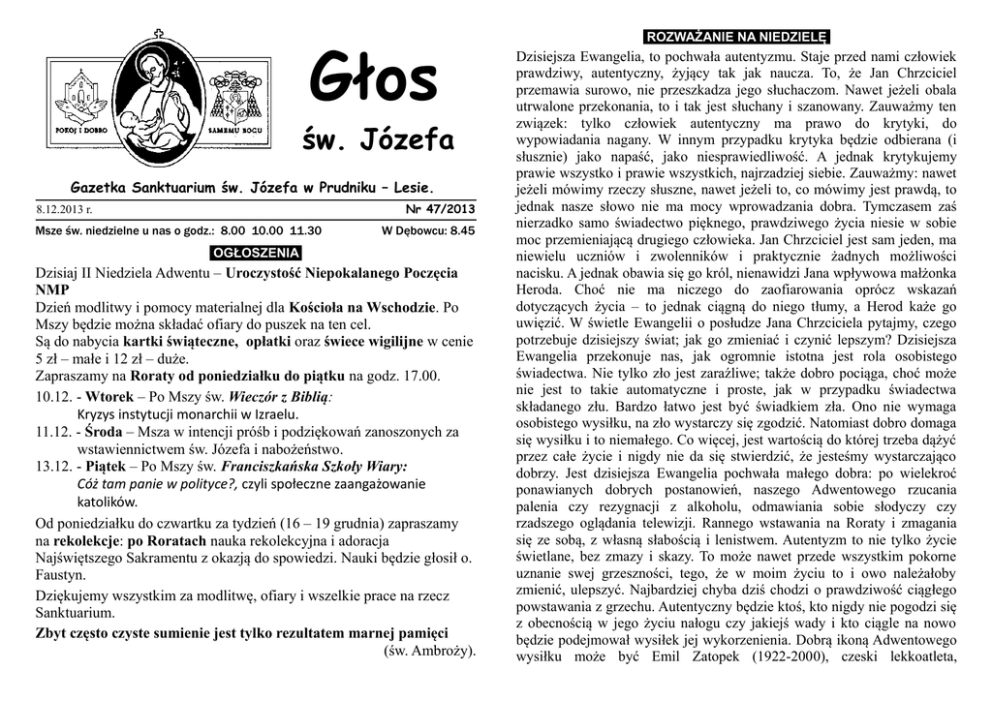 Głos św. Józefa Gazetka Sanktuarium św. Józefa w Prudniku – Lesie. Nr 47/2013 8.12.2013 r. Msze św. niedzielne u nas o godz.: 8.00 10.00 11.30 W Dębowcu: 8.45 OGŁOSZENIA Dzisiaj II Niedziela Adwentu – Uroczystość Niepokalanego Poczęcia NMP Dzień modlitwy i pomocy materialnej dla Kościoła na Wschodzie. Po Mszy będzie można składać ofiary do puszek na ten cel. Są do nabycia kartki świąteczne, opłatki oraz świece wigilijne w cenie 5 zł – małe i 12 zł – duże. Zapraszamy na Roraty od poniedziałku do piątku na godz. 17.00. 10.12. - Wtorek – Po Mszy św. Wieczór z Biblią: Kryzys instytucji monarchii w Izraelu. 11.12. - Środa – Msza w intencji próśb i podziękowań zanoszonych za wstawiennictwem św. Józefa i nabożeństwo. 13.12. - Piątek – Po Mszy św. Franciszkańska Szkoły Wiary: Cóż tam panie w polityce?, czyli społeczne zaangażowanie katolików. Od poniedziałku do czwartku za tydzień (16 – 19 grudnia) zapraszamy na rekolekcje: po Roratach nauka rekolekcyjna i adoracja Najświętszego Sakramentu z okazją do spowiedzi. Nauki będzie głosił o. Faustyn. Dziękujemy wszystkim za modlitwę, ofiary i wszelkie prace na rzecz Sanktuarium. Zbyt często czyste sumienie jest tylko rezultatem marnej pamięci (św. Ambroży). ROZWAŻANIE NA NIEDZIELĘ Dzisiejsza Ewangelia, to pochwała autentyzmu. Staje przed nami człowiek prawdziwy, autentyczny, żyjący tak jak naucza. To, że Jan Chrzciciel przemawia surowo, nie przeszkadza jego słuchaczom. Nawet jeżeli obala utrwalone przekonania, to i tak jest słuchany i szanowany. Zauważmy ten związek: tylko człowiek autentyczny ma prawo do krytyki, do wypowiadania nagany. W innym przypadku krytyka będzie odbierana (i słusznie) jako napaść, jako niesprawiedliwość. A jednak krytykujemy prawie wszystko i prawie wszystkich, najrzadziej siebie. Zauważmy: nawet jeżeli mówimy rzeczy słuszne, nawet jeżeli to, co mówimy jest prawdą, to jednak nasze słowo nie ma mocy wprowadzania dobra. Tymczasem zaś nierzadko samo świadectwo pięknego, prawdziwego życia niesie w sobie moc przemieniającą drugiego człowieka. Jan Chrzciciel jest sam jeden, ma niewielu uczniów i zwolenników i praktycznie żadnych możliwości nacisku. A jednak obawia się go król, nienawidzi Jana wpływowa małżonka Heroda. Choć nie ma niczego do zaofiarowania oprócz wskazań dotyczących życia – to jednak ciągną do niego tłumy, a Herod każe go uwięzić. W świetle Ewangelii o posłudze Jana Chrzciciela pytajmy, czego potrzebuje dzisiejszy świat; jak go zmieniać i czynić lepszym? Dzisiejsza Ewangelia przekonuje nas, jak ogromnie istotna jest rola osobistego świadectwa. Nie tylko zło jest zaraźliwe; także dobro pociąga, choć może nie jest to takie automatyczne i proste, jak w przypadku świadectwa składanego złu. Bardzo łatwo jest być świadkiem zła. Ono nie wymaga osobistego wysiłku, na zło wystarczy się zgodzić. Natomiast dobro domaga się wysiłku i to niemałego. Co więcej, jest wartością do której trzeba dążyć przez całe życie i nigdy nie da się stwierdzić, że jesteśmy wystarczająco dobrzy. Jest dzisiejsza Ewangelia pochwała małego dobra: po wielekroć ponawianych dobrych postanowień, naszego Adwentowego rzucania palenia czy rezygnacji z alkoholu, odmawiania sobie słodyczy czy rzadszego oglądania telewizji. Rannego wstawania na Roraty i zmagania się ze sobą, z własną słabością i lenistwem. Autentyzm to nie tylko życie świetlane, bez zmazy i skazy. To może nawet przede wszystkim pokorne uznanie swej grzeszności, tego, że w moim życiu to i owo należałoby zmienić, ulepszyć. Najbardziej chyba dziś chodzi o prawdziwość ciągłego powstawania z grzechu. Autentyczny będzie ktoś, kto nigdy nie pogodzi się z obecnością w jego życiu nałogu czy jakiejś wady i kto ciągle na nowo będzie podejmował wysiłek jej wykorzenienia. Dobrą ikoną Adwentowego wysiłku może być Emil Zatopek (1922-2000), czeski lekkoatleta, czterokrotny złoty medalista olimpijski, który na olimpiadzie w Helsinkach (1952 r.) zdobył trzy złote medale. Ci, którzy mogli go dopingować pamiętają, że biegł swoiście brzydko: jego twarz zdradzała krańcowy wysiłek, usta deformował grymas – jednym słowem widok raczej mało estetyczny. Niemniej zwyciężał a wygląd jego twarzy nie miał tu nic do rzeczy. Trzeźwiejący alkoholik, więzień, który po opuszczeniu zakładu karnego próbuje odbudować swoje życie, dziewczyna zmagająca się z anoreksją - oni wszyscy są tak nieprawdopodobnie piękni i prawdziwi w tym, co robią, w tym ich prostowaniu nierzadko bardzo powikłanych życiowych ścieżek. Może znamy takich ludzi: zmagających się ze skutkami wieloletnich zniewoleń, idących na przekór światu, który ich nie rozumie i odtrąca jako przegranych, jako tych, co są sami sobie winni; takich ludzi, którzy każdego dnia troskliwie zbierają na nowo wiele razy potrzaskane skorupy życia; ludzi którzy z trudnością odnajdują i pieczołowicie gromadzą okruchy dobra. To są ludzie w - że tak powiem – bardzo dobrym gatunku. Kto wie czy to nie oni są prawdziwą solą ziemi. Zwłaszcza że nasza cywilizacja zdaje się milcząco akceptować tezę o niemożności pokonywania wad i zniewoleń, stąd jedyne co robi to próbuje ograniczać fatalne skutki trwania w złu. W każdym prawie kiosku, nie wspominając o aptekach można kupić tabletki mające złagodzić skutek tęgiej popijawy, antykoncepcja wydaje się jedynym rozwiązaniem na potrzeby seksualne, nie podane kontroli rozumu i woli, od odpowiedzialności na drodze ma zwolnić, przynajmniej częściowo, poduszka powietrza i system kontroli hamowania…. Może na tym polega wielka choroba cywilizacji Zachodu? Że tenże Zachód uwierzył w słabość człowieka, który już z niczym nie potrafi sobie poradzić? Nasze przeżywanie Adwentu może polegać np. na podtrzymywaniu w ich dobrych zamiarach ludz