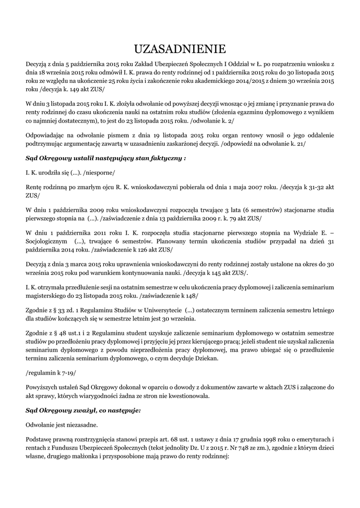 UZASADNIENIE Decyzją z dnia 5 października 2015 roku Zakład Ubezpieczeń Społecznych I Oddział w Ł. po rozpatrzeniu wniosku z dnia 18 września 2015 roku odmówił I. K. prawa do renty rodzinnej od 1 października 2015 roku do 30 listopada 2015 roku ze względu na ukończenie 25 roku życia i zakończenie roku akademickiego 2014/2015 z dniem 30 września 2015 roku /decyzja k. 149 akt ZUS/ W dniu 3 listopada 2015 roku I. K. złożyła odwołanie od powyższej decyzji wnosząc o jej zmianę i przyznanie prawa do renty rodzinnej do czasu ukończenia nauki na ostatnim roku studiów (złożenia egazminu dyplomowego z wynikiem co najmniej dostatecznym), to jest do 23 listopada 2015 roku. /odwołanie k. 2/ Odpowiadając na odwołanie pismem z dnia 19 listopada 2015 roku organ rentowy wnosił o jego oddalenie podtrzymując argumentację zawartą w uzasadnieniu zaskarżonej decyzji. /odpowiedź na odwołanie k. 21/ Sąd Okręgowy ustalił następujący stan faktyczny : I. K. urodziła się (...). /niesporne/ Rentę rodzinną po zmarłym ojcu R. K. wnioskodawczyni pobierała od dnia 1 maja 2007 roku. /decyzja k 31-32 akt ZUS/ W dniu 1 października 2009 roku wnioskodawczyni rozpoczęła trwające 3 lata (6 semestrów) stacjonarne studia pierwszego stopnia na (...). /zaświadczenie z dnia 13 października 2009 r. k. 79 akt ZUS/ W dniu 1 października 2011 roku I. K. rozpoczęła studia stacjonarne pierwszego stopnia na Wydziale E. – Socjologicznym (...), trwające 6 semestrów. Planowany termin ukończenia studiów przypadał na dzień 31 października 2014 roku. /zaświadczenie k 126 akt ZUS/ Decyzją z dnia 3 marca 2015 roku uprawnienia wnioskodawczyni do renty rodzinnej zostały ustalone na okres do 30 września 2015 roku pod warunkiem kontynuowania nauki. /decyzja k 145 akt ZUS/. I. K. otrzymała przedłużenie sesji na ostatnim semestrze w celu ukończenia pracy dyplomowej i zaliczenia seminarium magisterskiego do 23 listopada 2015 roku. /zaświadczenie k 148/ Zgodnie z § 33 zd. 1 Regulaminu Studiów w Uniwersytecie (...) ostatecznym terminem zaliczenia semestru letniego dla studiów kończących się w semestrze letnim jest 30 września. Zgodnie z § 48 ust.1 i 2 Regulaminu student uzyskuje zaliczenie seminarium dyplomowego w ostatnim semestrze studiów po przedłożeniu pracy dyplomowej i przyjęciu jej przez kierującego pracą; jeżeli student nie uzyskał zaliczenia seminarium dyplomowego z powodu nieprzedłożenia pracy dyplomowej, ma prawo ubiegać się o przedłużenie terminu zaliczenia seminarium dyplomowego, o czym decyduje Dziekan. /regulamin k 7-19/ Powyższych ustaleń Sąd Okręgowy dokonał w oparciu o dowody z dokumentów zawarte w aktach ZUS i załączone do akt sprawy, których wiarygodności żadna ze stron nie kwestionowała. Sąd Okręgowy zważył, co następuje: Odwołanie jest niezasadne. Podstawę prawną rozstrzygnięcia stanowi przepis art. 68 ust. 1 ustawy z dnia 17 grudnia 1998 roku o emeryturach i rentach z Funduszu Ubezpieczeń Społecznych (tekst jednolity Dz. U z 2015 r. Nr 748 ze zm.), zgodnie z którym dzieci własne, drugiego małżonka i przysposobione mają prawo do renty rodzinnej: 1) do ukończenia 16 lat; 2) do ukończenia nauki w szkole, jeżeli przekroczyły 16 lat życia, nie dłużej jednak niż do osiągnięcia 25 lat życia, albo 3) bez względu na wiek, jeżeli stały się całkowicie niezdolne do pracy oraz do samodzielnej egzystencji lub całkowicie niezdolne do pracy w okresie, o którym mowa w pkt 1 lub 2. W myśl art.68 ust.2 jeżeli dziecko osiągnęło 25 lat życia, będąc na ostatnim roku studiów w szkole wyższej, prawo do renty rodzinnej przedłuża się do zakończenia tego roku studiów. Treść omawianego przepisu wskazuje, że ustawodawca przyjął zasadę, iż wraz z ukończeniem 25 lat prawo do renty rodzinnej ustaje bez względu na okres, jaki pozostał do zakończenia nauki w szkole, jeżeli jest ona odbywana w szkole nie będącej szkołą wyższą. Wyjątek - w odniesieniu do odbywania studiów w szkole wyższej – został ustanowiony w sytuacji gdy dziecko ukończy 25 rok życia, będąc na ostatnim roku studiów w szkole wyższej, w takim wypadku prawo do renty rodzinnej przedłuża się do zakończenia tego roku studiów. Ustawodawca nie zdefiniował pojęcia „ostatniego roku studiów” co w oczywisty sposób może rodzić wątpliwości interpretacyjne przy stosowaniu omawianego przepisu. W orzecznictwie Sądu Najwyższego panuje jednak zgoda co do tego, że regulacja zawarta w art.68 ust.2 ustawy o emeryturach i rentach z Funduszu Ubezpieczeń Społecznych stanowi szczególną regulację normatywną nie poddającą się wykładni rozszerzającej i oznacza prawo do przedłużonej ochrony ubezpieczeniowej, której termin końcowy wyznacza data zakończenia tego konkretnego (ostatniego) roku akademickiego studiów w szkole wyższej, na którym uprawniony ukończył 25 lat życia. W orzecznictwie Sądu Najwyższego w kwestii wykładni i stosowania przepisu art.68 ust.2 utrwalił się pogląd, że określenie ostatniego roku studiów wyższych następuje na podstawie postanowień regulaminu studiów obowiązującego w konkretnej szkole wyższej. Przy czym ustalenie daty, w której dziecko pobierające rentę rodzinną było na ostatnim roku studiów, następuje na podstawie wpisu na ostatni rok studiów dokonanego na podstawie regulaminu obowiązującego daną uczelnię /por. wyrok Sądu Najwyższego z dnia 28 stycznia 2003 r., sygn. II UK 138/03, opubl: OSNAPiUS rok 2004, Nr 15, poz. 271; wyrok Sądu Najwyższego z dnia 28 października 2003 r. sygn. II UK 138/03, opubl: Orzecznictwo Sądu Najwyższego Izba Administracyjna, Pracy i Ubezpieczeń Społecznych rok 2004, Nr 15, poz. 271; wyrok Sądu Najwyższego z dnia 20 kwietnia 2006 r. sygn. I UK 265/05, opubl: Prawo Pracy rok 2006, Nr 7-8, str. 53/. Celem regulacji (wyjątku) z art.68 ust.2 ustawy jest zapewnienie renty rodzinnej tylko na czas ostatniego roku 