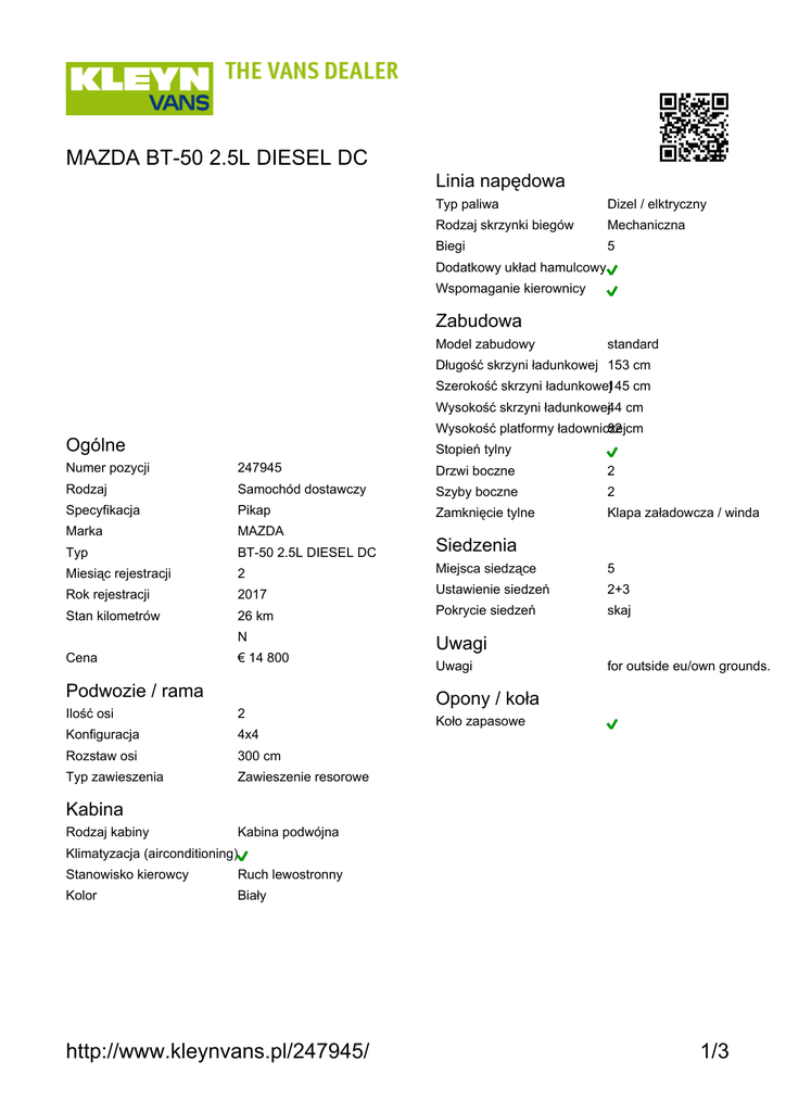 MAZDA BT-50 2.5L DIESEL DC Linia napędowa Typ paliwa Dizel / elktryczny Rodzaj skrzynki biegów Mechaniczna Biegi 5 Dodatkowy układ hamulcowy Wspomaganie kierownicy Zabudowa Model zabudowy standard Długość skrzyni ładunkowej 153 cm Szerokość skrzyni ładunkowej145 cm Wysokość skrzyni ładunkowej44 cm Wysokość platformy ładowniczej 82 cm Ogólne Stopień tylny Numer pozycji 247945 Drzwi boczne 2 Rodzaj Samochód dostawczy Szyby boczne 2 Specyfikacja Pikap Zamknięcie tylne Klapa załadowcza / winda Marka MAZDA Typ BT-50 2.5L DIESEL DC Siedzenia Miesiąc rejestracji 2 Miejsca siedzące 5 Rok rejestracji 2017 Ustawienie siedzeń 2+3 Stan kilometrów 26 km Pokrycie siedzeń skaj N Uwagi Cena € 14 800 Podwozie / rama Ilość osi 2 Konfiguracja 4x4 Rozstaw osi 300 cm Typ zawieszenia Zawieszenie resorowe Uwagi for outside eu/own grounds. Opony / koła Koło zapasowe Kabina Rodzaj kabiny Kabina podwójna Klimatyzacja (airconditioning) Stanowisko kierowcy Ruch lewostronny Kolor Biały http://www.kleynvans.pl/247945/ 1/3 MAZDA BT-50 2.5L DIESEL DC Ilość osi 10 mm 10 mm Hamulce tarczowe Rodzaj osi skrętnej Mechaniczne Typ zawieszenia Wymiar opony 235/75R15,0 Oś skrętna Raport inspekcji Kody wyświetlacza Elektryczny Kolumna kierownicу Resory 10 mm 10 mm Typ zawieszenia Zawieszenie resorowe Wymiar opony 235/75R15,0 Rama Idealny/nowy Zawieszenie Bardzo dobry Hamulce Rozsądny Stan Silnik - całość Akceptowalny Układ chłodzenia Nie spełnia wymagań Układ paliwowy Układ wydechowy Układ smarowania Skrzynka biegów Sprzęgło Napęd Opony http://www.kleynvans.pl/247945/ 2/3 MAZDA BT-50 2.5L DIESEL DC http://www.kleynvans.pl/247945/ 3/3