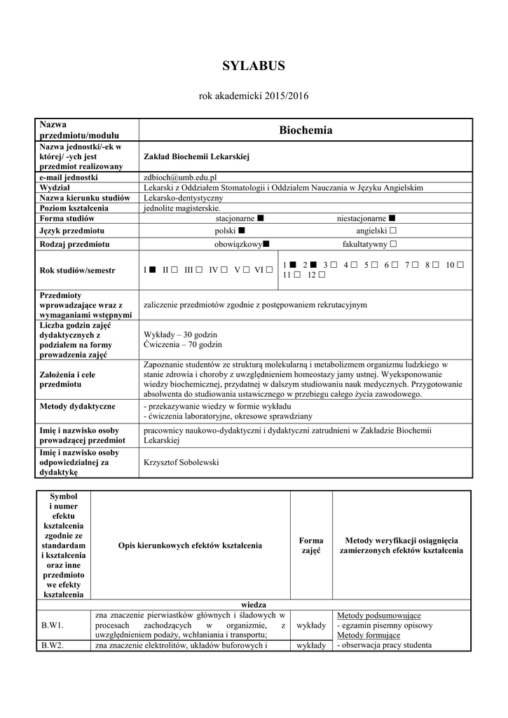 SYLABUS rok akademicki 2015/2016 Nazwa przedmiotu/modułu Nazwa jednostki/-ek w której/ -ych jest przedmiot realizowany e-mail jednostki Wydział Nazwa kierunku studiów Poziom kształcenia Forma studiów Język przedmiotu Rok studiów/semestr fakultatywny 1 2 3 4 5 6 7 8 10 11 12 zaliczenie przedmiotów zgodnie z postępowaniem rekrutacyjnym Wykłady – 30 godzin Ćwiczenia – 70 godzin Zapoznanie studentów ze strukturą molekularną i metabolizmem organizmu ludzkiego w stanie zdrowia i choroby z uwzględnieniem homeostazy jamy ustnej. Wyeksponowanie wiedzy biochemicznej, przydatnej w dalszym studiowaniu nauk medycznych. Przygotowanie absolwenta do studiowania ustawicznego w przebiegu całego życia zawodowego. - przekazywanie wiedzy w formie wykładu - ćwiczenia laboratoryjne, okresowe sprawdziany Założenia i cele przedmiotu Metody dydaktyczne Imię i nazwisko osoby prowadzącej przedmiot Imię i nazwisko osoby odpowiedzialnej za dydaktykę B.W2. [email protected] Lekarski z Oddziałem Stomatologii i Oddziałem Nauczania w Języku Angielskim Lekarsko-dentystyczny jednolite magisterskie. stacjonarne niestacjonarne polski angielski I II III IV V VI Przedmioty wprowadzające wraz z wymaganiami wstępnymi Liczba godzin zajęć dydaktycznych z podziałem na formy prowadzenia zajęć B.W1. Zakład Biochemii Lekarskiej obowiązkowy Rodzaj przedmiotu Symbol i numer efektu kształcenia zgodnie ze standardam i kształcenia oraz inne przedmioto we efekty kształcenia Biochemia pracownicy naukowo-dydaktyczni i dydaktyczni zatrudnieni w Zakładzie Biochemii Lekarskiej Krzysztof Sobolewski Opis kierunkowych efektów kształcenia Forma zajęć wiedza zna znaczenie pierwiastków głównych i śladowych w procesach zachodzących w organizmie, z uwzględnieniem podaży, wchłaniania i transportu; zna znaczenie elektrolitów, układów buforowych i wykłady wykłady Metody weryfikacji osiągnięcia zamierzonych efektów kształcenia Metody podsumowujące - egzamin pisemny opisowy Metody formujące - obserwacja pracy studenta reakcji chemicznych w układach biologicznych; B.W3. zna biochemiczne podstawy integralności organizmu ludzkiego; wykłady B.W4. zna budowę i funkcje ważnych związków chemicznych występujących w organizmie ludzkim, w szczególności właściwości, funkcje, metabolizm i energetykę reakcji: białek, kwasów nukleinowych, węglowodanów, lipidów, enzymów i hormonów; wykłady B.W5. zna zasady gospodarki wapniowej i fosforanowej; wykłady B.W6. zna rolę i znaczenie uwzględnieniem śliny; płynów ustrojowych, z - ocena przygotowania do zajęć - zaliczenia cząstkowe wykłady umiejętności B.U1. odnosi zjawiska chemiczne do procesów zachodzących w jamie ustnej; ćwiczenia Metody podsumowujące - realizacja określonego zadania Metody formujące - obserwacja pracy studenta - ocena aktywności w czasie zajęć - zaliczenie poszczególnych czynności - ocena przygotowania do zajęć - dyskusja w czasie zajęć kompetencje społeczne - rozpoznaje ograniczenia diagnostyczne i lecznicze oraz potrzeby edukacyjne, a także potrafi zaplanować własną aktywność edukacyjną - posiada umiejętność pracy w zespole profesjonalistów, w środowisku wielokulturowym i wielonarodowościowym Punkty ECTS Metody podsumowujące - ocenianie ciągłe przez nauczyciela Metody formujące - obserwacja pracy studenta - dyskusja w czasie zajęć 7 Obciążenie pracą studenta Forma aktywności Liczba godzin na zrealizowanie aktywności Zajęcia wymagające udziału prowadzącego: 1. Realizacja przedmiotu: wykłady (wg planu studiów) 2. Realizacja przedmiotu: ćwiczenia (wg planu studiów) 3. Realizacja przedmiotu: seminaria (wg planu studiów) 4. Realizacja przedmiotu: fakultety 5. Udział w konsultacjach godziny razem: Samodzielna praca studenta: 1 punkt ECTS oznacza 25-30 godzin pracy studenta w różnych formach, takich jak np.: 1. Samodzielne przygotowanie się do zajęć teoretycznych i praktycznych (wykonanie projektu, dokumentacji, opisu przypadku itp.) 2. Samodzielne przygotowanie się do zaliczeń/kolokwiów 3. Samodzielne przygotowanie się do egzaminu/zaliczenia końcowego godziny razem: Treści programowe przedmiotu: Efekty kształcenia (symbol i numer) tematyka B.W1. B.W2. B.W3. B.W4. Mikro i makroelementy, Transport, Witaminy Biochemia krwi Integracja i regulacja metabolizmu, Specyfika metabolizmu energetycznego Aminokwasy, peptydy i białka, Enzymologia Bioenergetyka, aktywne formy tlenu, Glikoliza, Oksydacyjna dekarboksylacja pirogronianu, Cykl Krebsa B.W5. B.W6. B.U1 Glukoneogeneza i szlak pentozofosforanowy, Wielocukry – metabolizm glikogenu, Lipidy, lipoproteiny osocza, Metabolizm białek i aminokwasów, Kwasy nukleinowe – podstawy biologii molekularnej Hormony, metabolizm wapnia Płyny biologiczne – biochemia śliny Aminokwasy, peptydy i białka, Właściwości białek w roztworach, Białka krwi, Kwasy nukleinowe, Fosfolipidy, steroidy i karotenoidy, Enzymy, Enzymy przewodu pokarmowego Literatura podstawowa: Bańkowski Edward: Biochemia. Podręcznik dla studentów uczelni medycznych. Elsevier Urban & Partner, Wrocław 2009 Lachowicz Lilia, Turska Ewa: Biochemia jamy ustnej. PZWL, 2008 Literatura uzupełniająca: Ćwiczenia z biochemii dla studentów Wydziału Lekarskiego UMB 2009 Kryteria oceny osiągniętych efektów kształcenia oraz forma i warunki uzyskania zaliczenia przedmiotu: 1. Zajęcia dydaktyczne prowadzone są w formie wykładów i ćwiczeń laboratoryjnych oraz czterech okresowych, pisemnych sprawdzianów (pytania otwarte, na ocenę: dostateczny - 60% punktów, dobry – 80% punktów, bardzo dobry – 95% punktów możliwych do uzyskania). Studenci, którzy nie zaliczą okresowego sprawdzianu w pierwszym terminie, mają możliwość „poprawki” w ustalonym czasie. 2. Wszystkie zajęcia są obowiązkowe. 3. Ze względu na specyfikę zajęć (cykl tygodniowy, zajęcia laboratoryjne) nie ma możliwości odrabiania nieobecności. Dopuszcza się jedn