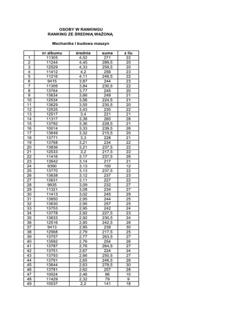 OSOBY W RANKINGU RANKING ZE ŚREDNIĄ WAśONĄ Mechanika i budowa maszyn 1 2 3 4 5 6 7 8 9 10 11 12 13 14 15 16 17 18 19 20 21 22 23 24 25 26 27 28 29 30 31 32 33 34 35 36 37 38 39 40 41 42 43 44 45 46 47 48 49 nr albumu 11305 11244 12529 11412 11216 9415 11306 13764 13634 12534 13629 12535 12517 11317 13792 10014 13649 13771 13768 13836 12533 11416 13642 9390 13770 13638 13631 9935 11321 11413 13650 13630 13753 13778 13633 12516 9413 12568 13757 13592 13787 13751 13793 13791 13644 13781 10024 11429 10037 średnia 4,52 4,45 4,33 4,2 4,11 3,87 3,84 3,77 3,66 3,56 3,55 3,43 3,4 3,38 3,36 3,33 3,32 3,3 3,21 3,21 3,2 3,17 3,14 3,13 3,13 3,12 3,11 3,09 3,08 3,02 2,95 2,95 2,95 2,92 2,92 2,85 2,85 2,79 2,77 2,76 2,76 2,67 2,66 2,65 2,63 2,62 2,46 2,32 2,2 suma 271 289,5 259,5 256 246,5 244 230,5 245 249 224,5 230,5 230 221 260 228,5 239,5 215,5 228 234 237,5 217,5 237,5 217 100 237,5 237 227 232 234 245 244 257 242 227,5 230,5 242,5 239 217,5 263,5 254 264,5 224 250,5 246,5 278,5 257 86 79 141 z ilu 22 20 20 23 22 23 22 20 21 21 20 22 21 28 21 26 20 21 22 22 22 26 21 12 22 23 22 27 27 29 25 25 24 23 24 26 30 25 27 26 27 24 27 26 30 28 10 9 18