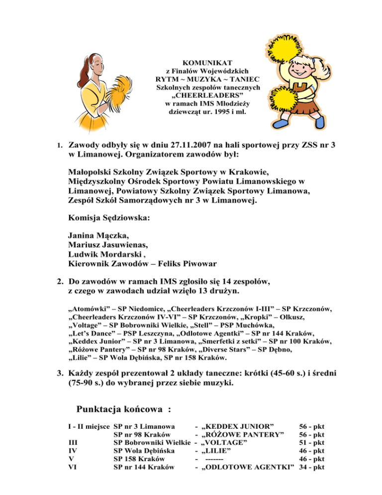 KOMUNIKAT z Finałów Wojewódzkich RYTM ~ MUZYKA ~ TANIEC Szkolnych zespołów tanecznych „CHEERLEADERS” w ramach IMS MłodzieŜy dziewcząt ur. 1995 i mł. 1. Zawody odbyły się w dniu 27.11.2007 na hali sportowej przy ZSS nr 3 w Limanowej. Organizatorem zawodów był: Małopolski Szkolny Związek Sportowy w Krakowie, Międzyszkolny Ośrodek Sportowy Powiatu Limanowskiego w Limanowej, Powiatowy Szkolny Związek Sportowy Limanowa, Zespół Szkół Samorządowych nr 3 w Limanowej. Komisja Sędziowska: Janina Mączka, Mariusz Jasuwienas, Ludwik Mordarski , Kierownik Zawodów – Feliks Piwowar 2. Do zawodów w ramach IMS zgłosiło się 14 zespołów, z czego w zawodach udział wzięło 13 druŜyn. „Atomówki” – SP Niedomice, „Cheerleaders Krzczonów I-III” – SP Krzczonów, „Cheerleaders Krzczonów IV-VI” – SP Krzczonów, „Kropki” – Olkusz, „Voltage” – SP Bobrowniki Wielkie, „Stell” – PSP Muchówka, „Let’s Dance” – PSP Leszczyna, „Odlotowe Agentki” – SP nr 144 Kraków, „Keddex Junior” – SP nr 3 Limanowa, „Smerfetki z setki” – SP nr 100 Kraków, „RóŜowe Pantery” – SP nr 98 Kraków, „Diverse Stars” – SP Dębno, „Lilie” – SP Wola Dębińska, SP nr 158 Kraków. 3. KaŜdy zespół prezentował 2 układy taneczne: krótki (45-60 s.) i średni (75-90 s.) do wybranej przez siebie muzyki. Punktacja końcowa : I - II miejsce SP nr 3 Limanowa SP nr 98 Kraków III SP Bobrowniki Wielkie IV SP Wola Dębińska V SP 158 Kraków VI SP nr 144 Kraków - „KEDDEX JUNIOR” „RÓśOWE PANTERY” „VOLTAGE” „LILIE” ------„ODLOTOWE AGENTKI” 56 - pkt 56 - pkt 51 - pkt 46 - pkt 46 - pkt 34 - pkt VII VIII IX-X SP nr 100 Kraków SP Dębno SP Krzczonów XI XII XIII SP Niedomice SP Muchówka SP Leszczyna SP Krzczonów - „SMERFETKI Z SETKI” - „DIVERSE STARS” - „CHEERLEADERS KRZCZONÓW I-III” - „ATOMÓWKI” - „STELL” - „ LET’S DANCE” - „CHEERLEADERS KRZCZONÓW IV-VI” 32 - pkt 30 - pkt 22 22 21 11 - pkt pkt pkt pkt 10 - pkt O rozstrzygnięciu w przypadku miejsc I – II oraz IV - V decydowała bezpośrednia dogrywka pomiędzy zainteresowanymi zespołami. Pierwsze miejsce ex aequo zajęły druŜyny „KEDDEX JUNIOR” z SP nr 3 w Limanowej i „RÓśOWE PANTERY” z SP nr 98 w Krakowie, a IV miejsce zdobyła zespół z SP Wola Dębińska. 4 .Zwycięskie zespoły wystąpiły w następujących składach: „KEDEX JUNIOR” : Kopka Aleksandra, Majka Katarzyna, Abrab Małgorzata, Tomasik Natalia, Zasuwara Paulina, Lupa Eliza, Sebastiańska Olga, Kurek Justyna, Filipek Andrea, Włodarczyk Ewelina, PapieŜ Justyna, Kulewicz Martyna, Michalik Karolina, Ociepka Paulina, Mikołajczyk Kinga. Opiekun Pani Anna Mordarska – Sukiennik. „RÓśOWE PANTERY” : Janina Chwastowska, Marlena Nowak, Katarzyna Gumienna, Magdalena Kordas, Ilona Durak, Angelika Marzecka, Adrianna Fitał, Ewelina Kękuś, Ewa Podolecka, Wiktoria Ogiegło, Joanna Hładyłowicz, Anna Raźna. Opiekun Pani Małgorzata Gaca. 5. Fundatorem nagród był Małopolski Szkolny Związek Sportowy w Krakowie – środki pochodzą z dofinansowania współzawodnictwa sportowego z Urzędu Marszałkowskiego Województwa Małopolskiego i Ministerstwa Sportu. Zawody odbyły się pod patronatem Starosty Powiatu Limanowskiego Jana Puchały oraz Burmistrza Miasta Limanowa Marka Czeczótki – którzy ufundowali dodatkowo nagrody i upominki dla uczestników zawodów. Dla wszystkich uczestników przygotowano ciepły posiłek przygotowany ze środków pozyskanych od prywatnych sponsorów. Limanowa dn. 2007 – 11 - 29 Organizator