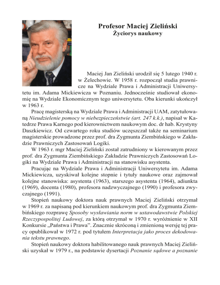 Profesor Maciej Zieliński Życiorys naukowy Maciej Jan Zieliński urodził się 5 lutego 1940 r. w Żelechowie. W 1958 r. rozpoczął studia prawnicze na Wydziale Prawa i Administracji Uniwersytetu im. Adama Mickiewicza w Poznaniu. Jednocześnie studiował ekonomię na Wydziale Ekonomicznym tego uniwersytetu. Oba kierunki ukończył w 1963 r. Pracę magisterską na Wydziale Prawa i Administracji UAM, zatytułowaną Nieudzielenie pomocy w niebezpieczeństwie (art. 247 k.k.), napisał w Katedrze Prawa Karnego pod kierownictwem naukowym doc. dr hab. Krystyny Daszkiewicz. Od czwartego roku studiów uczęszczał także na seminarium magisterskie prowadzone przez prof. dra Zygmunta Ziembińskiego w Zakładzie Prawniczych Zastosowań Logiki. W 1963 r. mgr Maciej Zieliński został zatrudniony w kierowanym przez prof. dra Zygmunta Ziembińskiego Zakładzie Prawniczych Zastosowań Logiki na Wydziale Prawa i Administracji na stanowisku asystenta. Pracując na Wydziale Prawa i Administracji Uniwersytetu im. Adama Mickiewicza, uzyskiwał kolejne stopnie i tytuły naukowe oraz zajmował kolejne stanowiska: asystenta (1963), starszego asystenta (1964), adiunkta (1969), docenta (1980), profesora nadzwyczajnego (1990) i profesora zwyczajnego (1991). Stopień naukowy doktora nauk prawnych Maciej Zieliński otrzymał w 1969 r. za napisaną pod kierunkiem naukowym prof. dra Zygmunta Ziembińskiego rozprawę Sposoby wysławiania norm w ustawodawstwie Polskiej Rzeczypospolitej Ludowej, za którą otrzymał w 1970 r. wyróżnienie w XII Konkursie „Państwa i Prawa”. Znacznie skróconą i zmienioną wersję tej pracy opublikował w 1972 r. pod tytułem Interpretacja jako proces dekodowania tekstu prawnego. Stopień naukowy doktora habilitowanego nauk prawnych Maciej Zieliński uzyskał w 1979 r., na podstawie dysertacji Poznanie sądowe a poznanie naukowe. Rozprawa ta została wyróżniona w XXIII Konkursie „Państwa i Prawa” w 1981 r. Dnia 28 października 1991 r. Prezydent Rzeczypospolitej Polskiej nadał Maciejowi Zielińskiemu tytuł profesora nauk prawnych. Natomiast sześć lat później – w 1997 r. – Profesor Maciej Zieliński został mianowany na stanowisko profesora zwyczajnego w Uniwersytecie im. Adama Mickiewicza i był na nim zatrudniony do 30 września 2002 r. Maciej Zieliński jako asystent odbył staże: w 1964 r. na Uniwersytecie Warszawskim w Katedrze Logiki II u Profesor Janiny Kotarbińskiej oraz rok później na Uniwersytecie Łódzkim, uczestnicząc w seminariach naukowych prowadzonych przez Profesora Jerzego Wróblewskiego na Wydziale Prawa i Administracji tego uniwersytetu, a także w seminariach z zakresu filozofii, zwłaszcza etyki, na Wydziale Filozoficzno-Historycznym UŁ. Maciej Zieliński przebywał także, na zaproszenie Profesora Oty Weinbergera, na stypendium naukowym w 1985 r. na Uniwersytecie Karola Franciszka w Grazu (Austria). Jako pracownik Uniwersytetu im. Adama Mickiewicza Maciej Zieliński prowadził na kolejno zajmowanych stanowiskach zajęcia dydaktyczne dla studentów prawa i administracji: ćwiczenia, wykłady, proseminaria i seminaria – ze wstępu do prawoznawstwa, logiki, etyki, teorii państwa i prawa, teorii prawa, informatyki prawniczej, a także z etyki i cybernetyki społecznej na studium podyplomowym dla dziennikarzy. Zajęcia ze studentami zainteresowanymi problematyką teoretyczną prawoznawstwa prowadził również całkowicie społecznie, poza jakimkolwiek przydziałem zajęć dydaktycznych. W 1971 r. Minister Nauki i Szkolnictwa Wyższego przyznał doktorowi Maciejowi Zielińskiemu nagrodę III stopnia za szczególne osiągnięcia dydaktyczne. Wyrazem uznania ze strony studentów dla Jego pracy dydaktycznej było przyznanie Mu w 1986 r. tytułu najlepszego wykładowcy wszystkich wyższych uczelni Poznania. Za osiągnięcia dydaktyczne, tym razem jako docent, Maciej Zieliński otrzymał w 1985 r. od Ministra Nauki i Szkolnictwa Wyższego nagrodę II stopnia. W okresie pracy na Uniwersytecie im. Adama Mickiewicza Maciej Zieliński pełnił rozliczne funkcje. W pierwszych wyłonionych demokratycznie władzach Wydziału Prawa i Administracji UAM w latach 1980–1981 – wybrany przez studentów tego wydziału – pełnił funkcję prodziekana do spraw studiów stacjonarnych. W latach 1990–1993 Profesor Maciej Zieliński był z wyboru członkiem Senatu UAM. Związki Profesora Macieja Zielińskiego ze Szczecinem sięgają roku 1963, kiedy rozpoczął zajęcia dydaktyczne w Punkcie Konsultacyjnym Wy- działu Prawa i Administracji UAM w Szczecinie, a po utworzeniu w 1985 r. Uniwersytetu Szczecińskiego prowadził zajęcia w Instytucie Prawa i Administracji nowej szczecińskiej uczelni. Z dniem 1 października 1986 r. został zatrudniony na stanowisku docenta w Instytucie Prawa i Administracji US, w Zakładzie Prawa Sądowego, a od 1988 r. w Zakładzie Teorii Państwa i Prawa, którego został kierownikiem. W tym samym roku kierowany przez Niego zakład stał się jednostką organizacyjną nowo powstałego Wydziału Prawa i Administracji Uniwersytetu Szczecińskiego. Od roku 1990 Maciej Zieliński był zatrudniony w Uniwersytecie Szczecińskim na stanowisku profesora nadzwyczajnego w Katedrze Teorii Państwa i Prawa (przemianowanej następnie na Katedrę Teorii i Filozofii Prawa), pełniąc nieprzerwanie do 1996 r. funkcję kierownika katedry, której był twórcą. Od 1997 r. Profesor Maciej Zieliński jest zatrudniony w Katedrze Teorii i Filozofii Prawa na stanowisku profesora zwyczajnego. Od roku 2012 kieruje Katedrą Tworzenia i Wykładni Prawa. Od 1993 r. do chwili obecnej – już pięć kadencji – jest członkiem Komitetu Nauk Prawnych Polskiej Akademii Nauk, a w latach 1996–2000 pełnił funkcję wiceprzewodniczącego. Z ramienia komitetu opracował i przedstawił całościową syntetyczną diagnozę stanu nauk prawnych (w 2000 r. – Uwagi o stanie nauk prawnych, a w 2004 r. – Raport o stanie nauk prawnych). Od roku 2000 – przez 