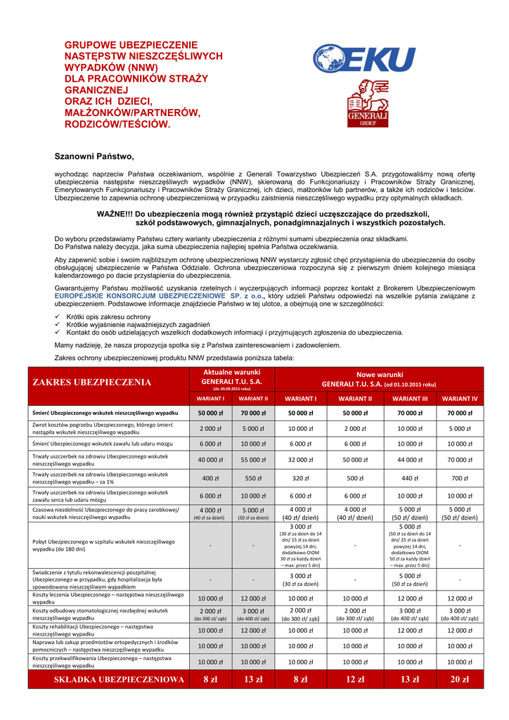 GRUPOWE UBEZPIECZENIE NASTĘPSTW NIESZCZĘŚLIWYCH WYPADKÓW (NNW) DLA PRACOWNIKÓW STRAŻY GRANICZNEJ ORAZ ICH DZIECI, MAŁŻONKÓW/PARTNERÓW, RODZICÓW/TEŚCIÓW. Szanowni Państwo, wychodząc naprzeciw Państwa oczekiwaniom, wspólnie z Generali Towarzystwo Ubezpieczeń S.A. przygotowaliśmy nową ofertę ubezpieczenia następstw nieszczęśliwych wypadków (NNW), skierowaną do Funkcjonariuszy i Pracowników Straży Granicznej, Emerytowanych Funkcjonariuszy i Pracowników Straży Granicznej, ich dzieci, małżonków lub partnerów, a także ich rodziców i teściów. Ubezpieczenie to zapewnia ochronę ubezpieczeniową w przypadku zaistnienia nieszczęśliwego wypadku przy optymalnych składkach. WAŻNE!!! Do ubezpieczenia mogą również przystąpić dzieci uczęszczające do przedszkoli, szkół podstawowych, gimnazjalnych, ponadgimnazjalnych i wszystkich pozostałych. Do wyboru przedstawiamy Państwu cztery warianty ubezpieczenia z różnymi sumami ubezpieczenia oraz składkami. Do Państwa należy decyzja, jaka suma ubezpieczenia najlepiej spełnia Państwa oczekiwania. Aby zapewnić sobie i swoim najbliższym ochronę ubezpieczeniową NNW wystarczy zgłosić chęć przystąpienia do ubezpieczenia do osoby obsługującej ubezpieczenie w Państwa Oddziale. Ochrona ubezpieczeniowa rozpoczyna się z pierwszym dniem kolejnego miesiąca kalendarzowego po dacie przystąpienia do ubezpieczenia. Gwarantujemy Państwu możliwość uzyskania rzetelnych i wyczerpujących informacji poprzez kontakt z Brokerem Ubezpieczeniowym EUROPEJSKIE KONSORCJUM UBEZPIECZENIOWE SP. z o.o., który udzieli Państwu odpowiedzi na wszelkie pytania związane z ubezpieczeniem. Podstawowe informacje znajdziecie Państwo w tej ulotce, a obejmują one w szczególności: Krótki opis zakresu ochrony Krótkie wyjaśnienie najważniejszych zagadnień Kontakt do osób udzielających wszelkich dodatkowych informacji i przyjmujących zgłoszenia do ubezpieczenia. Mamy nadzieję, że nasza propozycja spotka się z Państwa zainteresowaniem i zadowoleniem. Zakres ochrony ubezpieczeniowej produktu NNW przedstawia poniższa tabela: ZAKRES UBEZPIECZENIA Aktualne warunki GENERALI T.U. S.A. Nowe warunki GENERALI T.U. S.A. (od 01.10.2015 roku) (do 30.09.2015 roku) WARIANT I WARIANT II WARIANT I WARIANT II WARIANT III WARIANT IV Śmierć Ubezpieczonego wskutek nieszczęśliwego wypadku 50 000 zł 70 000 zł 50 000 zł 50 000 zł 70 000 zł 70 000 zł Zwrot kosztów pogrzebu Ubezpieczonego, którego śmierć nastąpiła wskutek nieszczęśliwego wypadku 2 000 zł 5 000 zł 10 000 zł 2 000 zł 10 000 zł 5 000 zł Śmierć Ubezpieczonego wskutek zawału lub udaru mózgu 6 000 zł 10 000 zł 6 000 zł 6 000 zł 10 000 zł 10 000 zł Trwały uszczerbek na zdrowiu Ubezpieczonego wskutek nieszczęśliwego wypadku 40 000 zł 55 000 zł 32 000 zł 50 000 zł 44 000 zł 70 000 zł Trwały uszczerbek na zdrowiu Ubezpieczonego wskutek nieszczęśliwego wypadku – za 1% 400 zł 550 zł 320 zł 500 zł 440 zł 700 zł Trwały uszczerbek na zdrowiu Ubezpieczonego wskutek zawału serca lub udaru mózgu 6 000 zł 10 000 zł 6 000 zł 6 000 zł 10 000 zł 10 000 zł 4 000 zł 5 000 zł (40 zł za dzień) (50 zł za dzień) 4 000 zł (40 zł/ dzień) 3 000 zł 4 000 zł (40 zł/ dzień) 5 000 zł (50 zł/ dzień) 5 000 zł 5 000 zł (50 zł/ dzień) Czasowa niezdolność Ubezpieczonego do pracy zarobkowej/ nauki wskutek nieszczęśliwego wypadku Pobyt Ubezpieczonego w szpitalu wskutek nieszczęśliwego wypadku (do 180 dni) Świadczenie z tytułu rekonwalescencji poszpitalnej Ubezpieczonego w przypadku, gdy hospitalizacja była spowodowana nieszczęśliwym wypadkiem Koszty leczenia Ubezpieczonego – następstwa nieszczęśliwego wypadku Koszty odbudowy stomatologicznej niezbędnej wskutek nieszczęśliwego wypadku Koszty rehabilitacji Ubezpieczonego – następstwa nieszczęśliwego wypadku Naprawa lub zakup przedmiotów ortopedycznych i środków pomocniczych – następstwa nieszczęśliwego wypadku Koszty przekwalifikowania Ubezpieczonego – następstwa nieszczęśliwego wypadku SKŁADKA UBEZPIECZENIOWA - - - - 10 000 zł 12 000 zł (30 zł za dzień do 14 dni/ 15 zł za dzień powyżej 14 dni, dodatkowo OIOM 30 zł za każdy dzień – max. przez 5 dni) 3 000 zł (30 zł za dzień) 10 000 zł - 10 000 zł (50 zł za dzień do 14 dni/ 25 zł za dzień powyżej 14 dni, dodatkowo OIOM 50 zł za każdy dzień – max. przez 5 dni) 5 000 zł (50 zł za dzień) 12 000 zł - 12 000 zł 2 000 zł 3 000 zł 2 000 zł 2 000 zł 3 000 zł 3 000 zł (do 300 zł/ ząb) (do 400 zł/ ząb) (do 300 zł/ ząb) (do 300 zł/ ząb) (do 400 zł/ ząb) (do 400 zł/ ząb) 10 000 zł 12 000 zł 10 000 zł 10 000 zł 12 000 zł 12 000 zł 10 000 zł 10 000 zł 10 000 zł 10 000 zł 10 000 zł 10 000 zł 10 000 zł 10 000 zł 10 000 zł 10 000 zł 10 000 zł 10 000 zł 8 zł 13 zł 8 zł 12 zł 13 zł 20 zł Dodatkowe korzyści • • • • • • • • • Dodatkowe świadczenie z tytułu śmierci Ubezpieczonego wskutek zawału serca lub udaru mózgu, Dodatkowe świadczenie z tytułu trwałego uszczerbku wskutek zawału serca lub udaru mózgu, Dodatkowe świadczenie za pobyt Ubezpieczonego w szpitalu wskutek nieszczęśliwego wypadku, Dodatkowe świadczenie z tytułu rekonwalescencji poszpitalnej Ubezpieczonego w przypadku gdy hospitalizacja była spowodowana nieszczęśliwym wypadkiem, Koszty rehabilitacji Ubezpieczonego wskutek nieszczęśliwego wypadku, Koszty odbudowy stomatologicznej niezbędnej wskutek nieszczęśliwego wypadku, Całodobowa ochrona ubezpieczeniowa od NNW zaistniałych na całym świecie, Brak franszyzy redukcyjnej w świadczeniu z tytułu uszczerbku na zdrowiu, Brak wymogu wypełniania odrębnych deklaracji dla każdego Ubezpieczonego (lista imienna). Warto wiedzieć, że: Ubezpieczony ma możliwość wyboru wariantu ubezpieczenia. Członkowie rodziny mogą przystąpić do ubezpieczenia bez względu na przystąpienie funkcjonariusza / 
