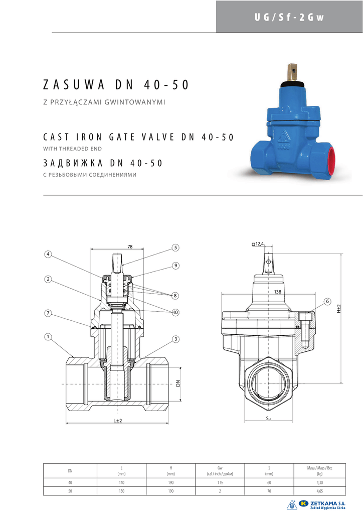 UG/Sf-2Gw ZASUWA DN 40-50 Z PRZYŁĄCZAMI GWIN TOWA NYMI CAST IRON GATE VALVE DN 40-5 WITH THRE ADE D E N D ЗАДВИЖКА DN 40-50 С РЕ З ЬБОВ Ы М И СОЕ Д И НЕ НИ ЯМ И 78 12,4 5 4 9 2 138 8 10 1 3 DN 7 H±2 6 S -1 L±2 DN L (mm) H (mm) Gw (cal / inch / дюйм) S (mm) Masa / Mass / Вес (kg) 40 140 190 1½ 60 4,30 50 150 190 2 70 4,65 S.A. Zakład Węgierska Górka UG/Sf-2Gw ZAKRES ZASTOSOWANIA / APPLICATION RANGE / ОБЛАС ТЬ ПРИМЕНЕНИЯ Średnica nominalna Nominal Diameter Номинальный диаметр DN (mm) Ciśnienie nominalne Nominal Pressure Номинальное давление (bar) Ciśnienie próbne kadłuba wodą Leaktightness Test of the Shell Испытательное давление корпуса водой (bar) Ciśnienie próbne zamknięcia wodą Seat Tightness Test Испытательное давление закрытия водой (bar) Dopuszczalne ciśnienie robocze Allowable Operating Pressure Допускаемое рабочее давление (bar) 40-50 16 24 18 16 PRZEZNACZENIE przeznaczone są do pitnej lub przemysłowej rzeciona w prawo. ykanie w lewo. ególnione w niniejszej karcie katalogowej mogą być montowane w rurociągach poziomych farba proszkowa poliestrowa „Faproxyd” lub wg APPLICATION НАЗНАЧЕНИЕ The gate valves with threaded end are designed for building in installations of potable clear or industrial water at the temperature of 70°C and the pressure up to 16 bar. Closing of the gate valve proceeds by turning the stem in the clockwise direction. On the Purchaser’s request, the anticlockwise closing is also available. All the gate valves specified in this leaflet may be installed into horizontal or vertical pipelines. Задвижки с патрубками с резьбой предназначены для сборки в установках чистой питьевой воды или промышленной при температуре 70°C и давлении до 16 бaр. Закрытие задвижки происходит с помощью оборота шпинделя вправо. По желанию клиента, производятся задвижки закрываемые влево. Все задвижки, перечисленные в настоящем каталоговом листе, могут быть установлены в вертикальных и горизонтальных трубопроводах. Face To Face Dimensions: series 14 according to PN-EN 558:2008 Thread acc. to: PN-EN ISO 228-1 Protective coating: powder polyester Faproxyd coating or acc. to buyer’s request Coating thickness: 250 µm ZH. Монтажная длина: ряд 14 согласно PN- EN 558:2008 Pезьба по: PN-EN ISO 228-1 Защита от коррозии: порошковая полизфирная краска „Faproxyd” или по желанию заказчика Толщина покрытия минимум: 250 µm C Z Ę Ś C I S K Ł A D O W E Z A S U W Y I U Ż Y T E M AT E R I A ŁY SPECIFICATION / СОС ТАВНЫЕ ЧАС ТИ ЗАДВИЖКИ И ИСПОЛЬЗУЕМЫЕ МАТЕРИАЛЫ Lp. Określenie części / Component / Наименование детали Użyte materiały / Material / Использованные материалы 1 Kadłub Body Корпyс EN-GJS-500-7* EN-GJS-500-7* EN-GJS-500-7* 2 Pokrywa Bonnet Крышка EN-GJS-500-7* EN-GJS-500-7* EN-GJS-500-7* 3 Klin miękko uszczelniający Resilient wedge Мягкоyплотняющий клин CuZn39Pb2 / NBR lub EPDM CuZn39Pb2 / NBR or EPDM CuZn39Pb2 / NBR или EPDM 4 Tuleja z gwintem Threaded bush Втyлка с резьбой CuZn39Pb2 CuZn39Pb2 CuZn39Pb2 5 Wrzeciono monolityczne z gwintem trapezowym symetrycznym Monolithic stem with symmetrical trapezoid thread Монолитный шпидель с трапецеидальной симметрической резьбой X20Cr13 X20Cr13 X20Cr13 6 Śruby z łbem walcowym i gniazdem 6-kątnym, zalane masą uszczelniającą Internal wrenching bolts sealed with sealing compound Винты с цилиндрической головкой и шестигранным гнездом залитые yплотняющей массой Stal ocynkowana lub nierdzewna** Galvanised steel or stainless steel** Оцинковання или нержавеющая сталь** 7 Uszczelnienie pokrywy z kadłubem Body bonnet seal Уплотнение крышки с корпyсом NBR lub EPDM NBR or EPDM NBR или EPDM 8 Uszczelnienie wrzeciona Stem sealing Уплотнение шпинделя NBR lub EPDM NBR or EPDM NBR или EPDM 9 Kapturek ochronny Protective cap Защитный колпачок NBR NBR NBR 10 Uszczelnienie zwrotne Back seat Обратное yплотнение CuZn39Pb2 CuZn39Pb2 CuZn39Pb2 * na życzenie Nabywcy zasuwy mogą być wykonywane z innego gatunku żeliwa sferoidalnego: EN-GJS-400-15, EN-GJS-600-3 ** na życzenie / on the request / по желанию заказчика S.A. Zakład Węgierska Górka Zastrzega się prawo do zmian konstrukcyjnych / Data given can be changed without notice / Оговаривается право к сменам конструктивным