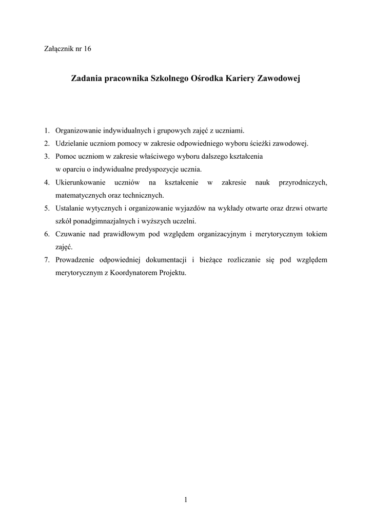 Załącznik nr 16 Zadania pracownika Szkolnego Ośrodka Kariery Zawodowej 1. Organizowanie indywidualnych i grupowych zajęć z uczniami. 2. Udzielanie uczniom pomocy w zakresie odpowiedniego wyboru ścieżki zawodowej. 3. Pomoc uczniom w zakresie właściwego wyboru dalszego kształcenia w oparciu o indywidualne predyspozycje ucznia. 4. Ukierunkowanie uczniów na kształcenie w zakresie nauk przyrodniczych, matematycznych oraz technicznych. 5. Ustalanie wytycznych i organizowanie wyjazdów na wykłady otwarte oraz drzwi otwarte szkół ponadgimnazjalnych i wyższych uczelni. 6. Czuwanie nad prawidłowym pod względem organizacyjnym i merytorycznym tokiem zajęć. 7. Prowadzenie odpowiedniej dokumentacji i bieżące rozliczanie się pod względem merytorycznym z Koordynatorem Projektu. 1
