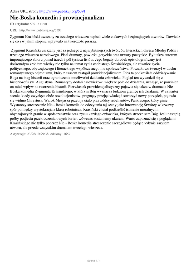 Adres URL strony http://www.publikuj.org/5391 Nie-Boska komedia i prowincjonalizm ID artykułu: 5391 / 1250 URL: http://www.publikuj.org/5391 Zygmunt Krasiński uważany za trzeciego wieszcza napisał wiele ciekawych i zajmujących utworów. Dowiedz się co i w jakim stopniu wpływało na twórczość pisarza. Zygmunt Krasiński uważany jest za jednego z najwybitniejszych twórców literackich okresu Młodej Polski i trzeciego wieszcza narodowego. Pisał dramaty, powieści gotyckie oraz utwory poetyckie. Był także autorem imponującego zbioru ponad trzech i pól tysiąca listów. Jego bogaty dorobek epistolograficzny jest doskonałym źródłem wiedzy nie tylko na temat życia osobistego Krasińskiego, ale również życia politycznego, obyczajowego i literackiego współczesnego mu społeczeństwa. Początkowo tworzył w duchu romantycznego bajronizmu, który z czasem zastąpił prowidencjalizmem. Idea ta podkreślała oddziaływanie Boga na bieg historii oraz ograniczenie możliwości działania człowieka. Pogląd ten wywodził się z historiozofii św. Augustyna. Romantycy dodali człowiekowi większe pole do działania, uznając, że powinien on mieć wpływ na tworzenie historii. Pierwiastek prowidencjalistyczny pojawia się także w dramacie Nie Boska komedia Zygmunta Krasińskiego, w którym Bóg wyznacza ludziom granicę ich działania. W czwartej scenie, kiedy zwycięża obóz rewolucjonistów, pragnący przejąć władzę i stworzyć nowy porządek, pojawia się widmo Chrystusa. Wzrok Mesjasza przebija ciało przywódcy rebeliantów, Pankracego, który ginie. Wystarczy streszczenie Nie - Boska komedia do odczytania tej sceny jako interwencję Stwórcy w krwawy spór pomiędzy arystokracją a klasą robotniczą. Krasiński chciał podkreślić istnienie moralnych i obyczajowych granic w społeczeństwie oraz życiu każdego człowieka, których strzeże sam Bóg. Jeśli nastąpią próby podjęcia przekroczenia owych barier, wówczas zostaniemy ukarani. Warto zapoznać się z poglądami Krasińskiego nie tylko poprzez Nie - Boska komedia streszczenie szczegółowe będące jedynie zarysem utworu, ale przede wszystkim dramatem trzeciego wieszcza. Aktywacja: 23/06/10 09:38, odsłony: 1657 Strona 1 / 1