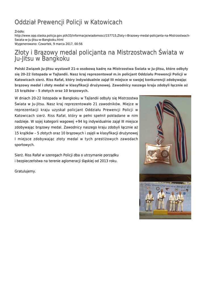Oddział Prewencji Policji w Katowicach Źródło: http://www.opp.slaska.policja.gov.pl/k33/informacje/wiadomosci/157715,Zloty-i-Brazowy-medal-policjanta-na-MistrzostwachSwiata-w-Ju-Jitsu-w-Bangkoku.html Wygenerowano: Czwartek, 9 marca 2017, 00:56 Złoty i Brązowy medal policjanta na Mistrzostwach Świata w Ju-Jitsu w Bangkoku Polski Związek Ju-Jitsu wystawił 21-o osobową kadrę na Mistrzostwa Świata w Ju-Jitsu, które odbyły się 20-22 listopada w Tajlandii. Nasz kraj reprezentował m.in policjant Oddziału Prewencji Policji w Katowicach sierż. Riss Rafał, który indywidualnie zajął III miejsce w swojej konkurencji zdobywając brązowy medal i złoty medal w klasyfikacji drużynowej. Zawodnicy naszego kraju zdobyli łącznie aż 15 krążków – 5 złotych oraz 10 brązowych. W dniach 20-22 listopada w Bangkoku w Tajlandii odbyły się Mistrzostwa Świata w Ju-Jitsu. Nasz kraj reprezentowało 21 zawodników. Miejce w reprezentacji kraju uzyskał policjant Oddziału Prewencji Policji w Katowicach sierż. Riss Rafał, który w pełni spełnił pokładane w nim nadzieje. W sojej kategorii wagowej +94 kg indywidualnie zajął III miejsce zdobywając brązowy medal. Zawodnicy naszego kraju zdobyli łącznie aż 15 krążków – 5 złotych oraz 10 brązowych i zajęli w klasyfikacji drużynowej I miejsce zdobywając złoty medal w tych prestiżowych zawodach sportowych. Sierż. Riss Rafał w szeregach Policji dba o utrzymanie porządku i bezpieczeństwa na terenie aglomeracji śląskiej od 2013 roku. Gratulujemy. Ocena: 0/5 (0) Tweetnij