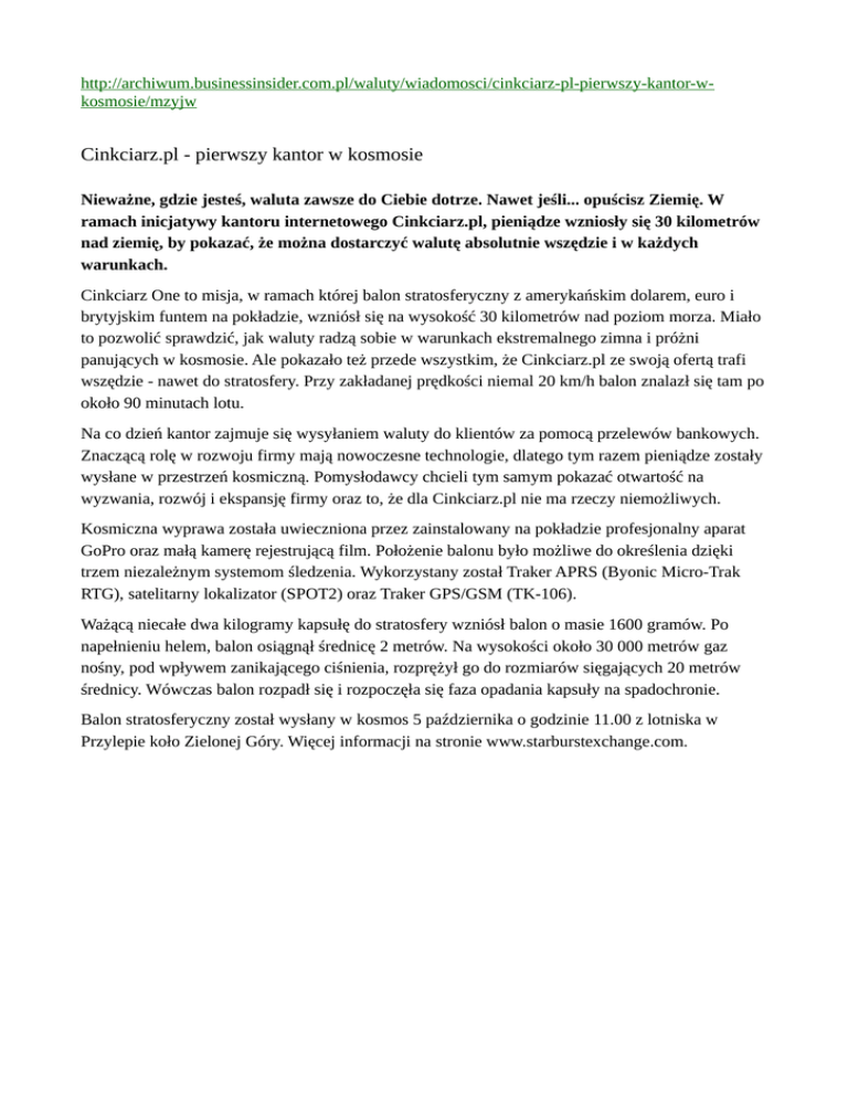 http://archiwum.businessinsider.com.pl/waluty/wiadomosci/cinkciarz-pl-pierwszy-kantor-wkosmosie/mzyjw Cinkciarz.pl - pierwszy kantor w kosmosie Nieważne, gdzie jesteś, waluta zawsze do Ciebie dotrze. Nawet jeśli... opuścisz Ziemię. W ramach inicjatywy kantoru internetowego Cinkciarz.pl, pieniądze wzniosły się 30 kilometrów nad ziemię, by pokazać, że można dostarczyć walutę absolutnie wszędzie i w każdych warunkach. Cinkciarz One to misja, w ramach której balon stratosferyczny z amerykańskim dolarem, euro i brytyjskim funtem na pokładzie, wzniósł się na wysokość 30 kilometrów nad poziom morza. Miało to pozwolić sprawdzić, jak waluty radzą sobie w warunkach ekstremalnego zimna i próżni panujących w kosmosie. Ale pokazało też przede wszystkim, że Cinkciarz.pl ze swoją ofertą trafi wszędzie - nawet do stratosfery. Przy zakładanej prędkości niemal 20 km/h balon znalazł się tam po około 90 minutach lotu. Na co dzień kantor zajmuje się wysyłaniem waluty do klientów za pomocą przelewów bankowych. Znaczącą rolę w rozwoju firmy mają nowoczesne technologie, dlatego tym razem pieniądze zostały wysłane w przestrzeń kosmiczną. Pomysłodawcy chcieli tym samym pokazać otwartość na wyzwania, rozwój i ekspansję firmy oraz to, że dla Cinkciarz.pl nie ma rzeczy niemożliwych. Kosmiczna wyprawa została uwieczniona przez zainstalowany na pokładzie profesjonalny aparat GoPro oraz małą kamerę rejestrującą film. Położenie balonu było możliwe do określenia dzięki trzem niezależnym systemom śledzenia. Wykorzystany został Traker APRS (Byonic Micro-Trak RTG), satelitarny lokalizator (SPOT2) oraz Traker GPS/GSM (TK-106). Ważącą niecałe dwa kilogramy kapsułę do stratosfery wzniósł balon o masie 1600 gramów. Po napełnieniu helem, balon osiągnął średnicę 2 metrów. Na wysokości około 30 000 metrów gaz nośny, pod wpływem zanikającego ciśnienia, rozprężył go do rozmiarów sięgających 20 metrów średnicy. Wówczas balon rozpadł się i rozpoczęła się faza opadania kapsuły na spadochronie. Balon stratosferyczny został wysłany w kosmos 5 października o godzinie 11.00 z lotniska w Przylepie koło Zielonej Góry. Więcej informacji na stronie www.starburstexchange.com.