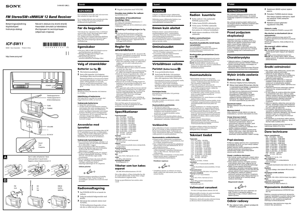 3-048-851-24(1) Dansk ADVARSEL FM Stereo/SW1-9/MW/LW 12 Band Receiver Betjeningsvejledning Käyttöohjeet Instrukcja obsługi Návod k obsluze (na druhé straně) Használati útmutató (a hátoldalon) Инструкция по эксплуатации (обpaтнaя cтоpонa) ICF-SW11 ©2000 Sony Corporation For at forhindre brand eller stød, må receiveren ikke udsættes for regn eller fugt. For at undgå elektrrisk stød, må kabinettet ikke åbnes. Overlad alt reparationsarbejde til kvalificeret servicepersonale. Før du begynder Tak fordi du har valgt denne Sony world band receiver! Den vil give dig mange timers sikker drift og lyttefornøjelse i fremtiden. Læs venligst nærværende betjeningsvejledning grundigt, inden world band receiveren tages i brug. Gem denne betjeningsvejledning til fremtidig brug. Egenskaber Printed in China • FM stereo/KB1-9/MB/LB 12-bånds receiver med høj følsomhed og selektivitet. • Båndspredningssystem muliggør nem indstilling på KB-stationer. • FM-stereomodtagning via stereohovedtelefoner (medfølger ikke). Valg af strømkilder Batterier (se fig. A) 1 2 Åbn batterirumsdækslet. Isæt to R6 (størrelse AA) batterier (medfølger ikke) med korrekt polaritet. Batterirumsdækslet er forsynet med et bånd, som forhindrer dækslet i at falde ud ved et uheld. Anbring båndet over de isatte batterier og luk batterirumsdækslet. Træk ikke for kraftigt i båndet. Ellers kan båndet gå af. Batterilevetid Med brug af Sony R6 (størrelse AA) batterier: Ca. 30 timer. Teleskoppantenne Teleskooppiantenni Antena teleskopowa Udskiftning af batterierne Når lyden bliver svag eller forvrænget, skal begge batterierne skiftes ud med nye. Vedrørende batterierne • Oplad ikke tørbatterierne. • Gå ikke rundt med tørbatterierne sammen med mønter eller andre metalgenstande. Der kan frembringes varme, hvis batteriernes positive og negative terminaler ved et uheld kommer i berøring med en metalgenstand. • Tag batterierne ud, hvis apparatet ikke skal anvendes i længere tid, således at beskadigelse forårsaget af batterilækage og korrosion undgås. TUNE TUNING Anvendelse med lysnettet VOLUME 2 Forbind lysnetadapteren (medfølger ikke) til DC IN 3V-jackstikket og sæt den i en stikkontakt i væggen. Sørg for trykke stikproppen godt ind i jackstikket. Receiveren strømforsynes fra strømkilden, selv om der er sat batterier i. DC IN 3V Vedrørende lysnetadapteren • For at forhindre batterilækage, anbefaler vi at batterierne tages ud, når receiveren forbindes til en stikkontakt i væggen. • Når lysnetadapteren ikke skal anvendes i længere tid, skal den tages ud af forbindelse med såvel DC IN 3V-jackstikket som stikkontakten i væggen. • Brug en almindelig tilgængelig AC-adapter* (nominel udgangseffekt/spænding: 3 V DC/ 700 mA). Anvend ikke nogen anden lysnetadapter. • Der kan muligvis høres støj, mens enheden bruges, afhængigt af lysnetadapteren. Yderligere oplysninger findes i betjeningsvejledningen til AC-adapteren. Stand Tuki Podpórka A Sæt ’ siden af batteriet i først Aseta pariston ’ puoli ensin Najpierw włożyć baterię końcem ’ Stikkets polaritet 4 Reguler lydstyrken med VOLUME. Hvordan man slukker for radioen Sæt POWER til OFF. Anvendelse af hovedtelefoner (medfølger ikke) FM-stereo: Sæt stereohovedtelefonerne i 2 (hovedtelefon) jackstikket. Højttaleren kobles ud, når hovedtelefonen sættes i forbindelse. Forbedring af modtagningen (se fig. B) FM: Forlæng teleskopantennen og find den vinkel, der giver den bedste modtagning. KB: Forlæng teleskopantennen i vertikal retning. MB/LB: Drej receiveren horisontalt, indtil den bedste modtagning opnås. Apparatet har en indbygget ferrit-antenne. Regler for anvendelsen • Benyt kun apparatet på 3V DC. Anvend to R6 (størrelse AA) batterier til batteridrift. Anvend kun den anbefalede lysnetadapter til lysnetdrift. • Apparatet vil stadig være tilsluttet lysnettet, så længe dets netledning sidder i en stikkontakt i væggen, selv hvis der er afbrudt på selve apparatet. • Efterlad ikke apparatet på et sted med varmekilder eller hvor det er udsat for direkte sol, sand, støv eller stød. • Navnepladen med angivelse af driftsspænding etc. sidder udvendigt på apparatets bagside. • Skulle der komme en genstand eller væske ind i apparatet, skal lysnetadapteren tages ud af forbindelse og batterierne tages ud. Få apparatet efterset af en kvalificeret fagmand, inden det tages i brug igen. • Eftersom der anvendes en kraftig magnet for højttaleren, bør personlige kreditkort etc. med magnetkoder ikke bringes i nærheden af apparatet. • Hvis apparatets ydre er blevet snavset, skal det rengøres med en blød klud, der er fugtet med en mild rengøringsopløsning. Anvend aldrig ridsende rengøringsmidler eller kemiske opløsningsmidler, da de kan ødelægge apparatets overfladefinish. • Radiomodtagningen kan være vanskelig og behæftet med støj i biler eller bygninger. Prøv at lytte i nærheden af en vindue. Henvend Dem gerne til nærmeste Sony forhandler, hvis De har spørgsmål om eller problemer med dette apparat. Specifikationer Frekvensområde: FM: 87,5 MHz - 108 MHz KB1: 4,750 MHz - 5,060 MHz KB2: 5,900 MHz - 6,200 MHz KB3: 7,100 MHz - 7,350 MHz KB4: 9,400 MHz - 9,990 MHz KB5: 11,600 MHz - 12,100 MHz KB6: 13,570 MHz - 13,870 MHz KB7: 15,100 MHz - 15,800 MHz KB8: 17,480 MHz - 17,900 MHz KB9: 21,450 MHz - 21,750 MHz MB: 525 kHz - 1,620 kHz LB: 141 kHz - 290 kHz Højttaler Ca. 5,7 cm diam., 4 Ω Udgangseffekt 140 mW (ved 10% total harmonisk forvrængning) Udgang 2 (hovedtelefon) jackstik (stereo-minijackstik, 3,5 mm diam.) Strømforsyning 3V DC, to R6 (størrelse AA) batterier Ekstern strømkilde DC IN 3V Mål Ca. 162 x 93,8 x 34,8 mm (b x h x d) Vægt Ca. 340 g, inkl. batterier Medfølgende tilbehør Kortbølgeguide (1) B FM ULA KB LA SW MB/LB KA/PA MW/LW Radiomodtagning 1 2 3 Sæt POWER til ON for at tænde for radioen. Vælg det ønskede bølgeområde med