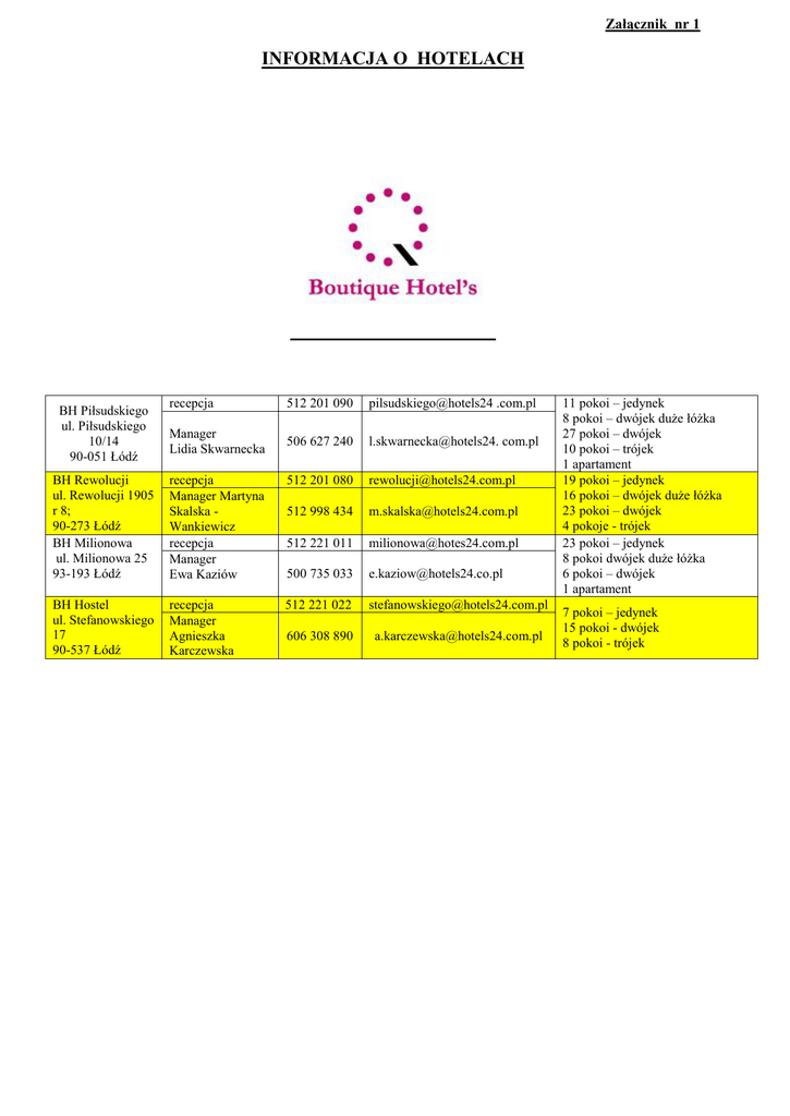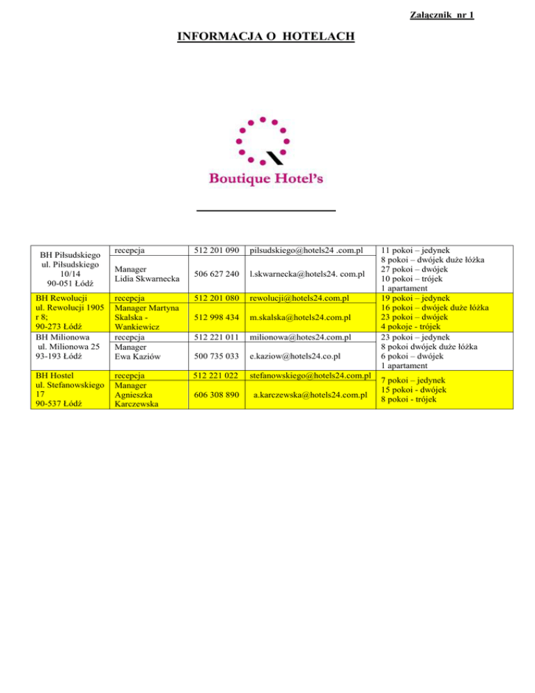 Załącznik nr 1 INFORMACJA O HOTELACH BH Piłsudskiego ul. Piłsudskiego 10/14 90-051 Łódź recepcja 512 201 090 pilsudskiego@hotels24 .com.pl Manager Lidia Skwarnecka 506 627 240 l.skwarnecka@hotels24. com.pl BH Rewolucji ul. Rewolucji 1905 r 8; 90-273 Łódź BH Milionowa ul. Milionowa 25 93-193 Łódź recepcja Manager Martyna Skalska Wankiewicz recepcja Manager Ewa Kaziów 512 201 080 [email protected] 512 998 434 [email protected] 512 221 011 [email protected] 500 735 033 [email protected] BH Hostel ul. Stefanowskiego 17 90-537 Łódź recepcja Manager Agnieszka Karczewska 512 221 022 [email protected] 606 308 890 [email protected] 11 pokoi – jedynek 8 pokoi – dwójek duże łóżka 27 pokoi – dwójek 10 pokoi – trójek 1 apartament 19 pokoi – jedynek 16 pokoi – dwójek duże łóżka 23 pokoi – dwójek 4 pokoje - trójek 23 pokoi – jedynek 8 pokoi dwójek duże łóżka 6 pokoi – dwójek 1 apartament 7 pokoi – jedynek 15 pokoi - dwójek 8 pokoi - trójek FORMULARZ REZERWACYJNY GRAND PRIX – PUCHAR POLSKI 2015 Numer rezerwacji 06 – 08.11.2015 ( wypełnia hotel) Nazwa klubu sportowego składającego zapytanie o rezerwację w hotelu: W imieniu Klubu Sportowego zamawiam rezerwację usług w obiekcie należącym do ………………………. w Łodzi na okres Grand Prix – Puchar Polski dla następujących liczby osób Nazwa hotelu: Zamawiam pakiet 1 lub 2-dniowy ( noclegi z wyżywieniem): TERMIN POBYTU (data przyjazdu i wyjazdu) ILOŚĆ DÓB ILOŚĆ OSÓB Razem liczba pokoi: Rodzaj pokoju ( jedno-, dwu-, trzyosobowy) ILOŚĆ OSÓB W POKOJU Razem liczba osób: CENA JEDNOSTKOW A ZA PAKIET (1 lub 2-dniowy) ŁĄCZNIE zł RAZEM OBOWIĄZUJE OPŁATA ZA PAKIET: 1 lub 2-dniowy ( bez możliwości rezygnacji z posiłków). PAKIET 1-dniowy obejmuje: 1 nocleg, 1 śniadanie ujęte w cenie noclegu, 1 obiad, 1 kolację; od kolacji w dniu przyjazdu do obiadu w dniu wyjazdu; PAKIET 2- dniowy obejmuje: 2 noclegi, 2 śniadania ujęte w cenie noclegu , 2 obiady, 2 kolacje; od kolacji w dniu 06.11.2015 do obiadu w dniu 08.11.2015 DANE KONTAKTOWE ZAMAWIAJĄCEGO (PROSZĘ PODAĆ IMIĘ, NAZWISKO, TELEFON, FAKS, ADRES E-MAIL DANE DO WYSTAWIENIA FAKTURY VAT: Płatność w wysokości 100% nastąpi przed zakwaterowaniem w terminie wskazanym przez Recepcję Hotelu w potwierdzeniu rezerwacji. Płatność nastąpi: przelewem, kartą płatniczą, gotówką. Za usługi nie wymienione w zamówieniu, a domówione przez Gości hotelowych podczas pobytu dokonują Goście w recepcji hotelu. Warunki zmian i rezygnacji zostaną przesłane wraz z potwierdzeniem rezerwacji przez recepcję Hotelu. Parking samochodowy dla gości hotelowych bezpłatnie.