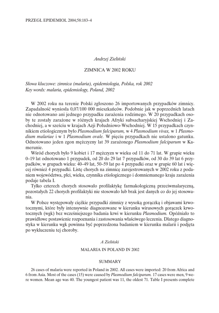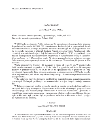 PRZEGL EPIDEMIOL 2004;58:183–4 Andrzej Zieliński ZIMNICA W 2002 ROKU Słowa kluczowe: zimnica (malaria), epidemiologia, Polska, rok 2002 Key words: malaria, epidemiology, Poland, 2002 W 2002 roku na terenie Polski zgłoszono 26 importowanych przypadków zimnicy. Zapadalność wyniosła 0,07/100 000 mieszkańców. Podobnie jak w poprzednich latach nie odnotowano ani jednego przypadku zarażenia rodzimego. W 20 przypadkach osoby te zostały zarażone w różnych krajach Afryki subsacharyjskiej Wschodniej i Zachodniej, a w sześciu w krajach Azji Południowo-Wschodniej. W 15 przypadkach czynnikiem etiologicznym było Plasmodium falciparum, w 4 Plasmodium vivax, w 1 Plasmodium malariae i w 1 Plasmodium ovale. W pięciu przypadkach nie ustalono gatunku. Odnotowano jeden zgon mężczyzny lat 39 zarażonego Plasmodium falciparum w Kamerunie. Wśród chorych było 9 kobiet i 17 mężczyzn w wieku od 11 do 71 lat. W grupie wieku 0–19 lat odnotowano 1 przypadek, od 20 do 29 lat 7 przypadków, od 30 do 39 lat 6 przypadków, w grupach wieku: 40–49 lat, 50–59 lat po 4 przypadki oraz w grupie 60 lat i więcej również 4 przypadki. Listę chorych na zimnicę zarejestrowanych w 2002 roku z podaniem województwa, płci, wieku, czynnika etiologicznego i domniemanego kraju zarażenia podaje tabela I. Tylko czterech chorych stosowało profilaktykę farmakologiczną przeciwmalaryczną, pozostałych 22 chorych profilaktyki nie stosowało lub brak jest danych co do jej stosowania. W Polsce występowały ciężkie przypadki zimnicy z wysoką gorączką i objawami krwotocznymi, które były intensywnie diagnozowane w kierunku wirusowych gorączek krwotocznych (wgk) bez wcześniejszego badania krwi w kierunku Plasmodium. Opóźniało to prawidłowe postawienie rozpoznania i zastosowania właściwego leczenia. Dlatego diagnostyka w kierunku wgk powinna być poprzedzona badaniem w kierunku malarii i podjęta po wykluczeniu tej choroby. A Zieliński MALARIA IN POLAND IN 2002 SUMMARY 26 cases of malaria were reported in Poland in 2002. All cases were imported: 20 from Africa and 6 from Asia. Most of the cases (15) were caused by Plasmodium falciparum. 17 cases were men, 9 were women. Mean age was 40. The youngest patient was 11, the oldest 71. Table I presents complete 184 Nr 1 A Zieliński Tabela 1. Table 1. Przypadki zimnicy zawleczone do Polski w 2002 roku Cases of malaria imported to Poland in 2002 Województwo Dolnośląskie Kujawsko-Pomorskie Płeć Wiek Plasmodium Kraj pobytu M 53 malariae Zambia, Malavi M 45 falciparum Kongo, Tanzania K 23 falciparum Kenia M 26 falciparum Kenia M 11 vivax Mali Lubelskie K 25 falciparum Kenia Lubuskie M 35 falciparum Rep. Płd. Afryki Łódzkie Małopolskie Mazowieckie K 62 sp. Turcja M 46 falciparum Cejlon M 26 sp. Kongo K 68 sp. Kenia K 22 vivax Indonezja M 71 falciparum Etiopia K 51 falciparum Rep. Płd. Afryki M 69 falciparum Kenia K 44 vivax Indie, Chiny K 50 falciparum Tanzania K 27 falciparum Ghana Podkarpackie M 31 sp. Uganda Podlaskie M 28 sp. (nie falciparum) Ceylon Śląskie M 47 falciparum Kamerun M 52 vivax Nowa Gwinea Warmińsko-Mazurskie Zachodnio-Pomorskie M 39 falciparum Kamerun M 36 falciparum Angola M 30 falciparum Kamerun M 30 ovale Rep. Płd. Afryki list of cases by gender (M-male, K-female), age, etiologic factor and presumed country of infection. In only 4 cases some kind of chemoprophylaxis was documented. In other prophylaxis was not used or not documented. One death resulted from falciparum malaria in Poland in 2002. Adres autora: Andrzej Zieliński Zakład Epidemiologii Państwowego Zakładu Higieny ul. Chocimska 24, 00-791 Warszawa
