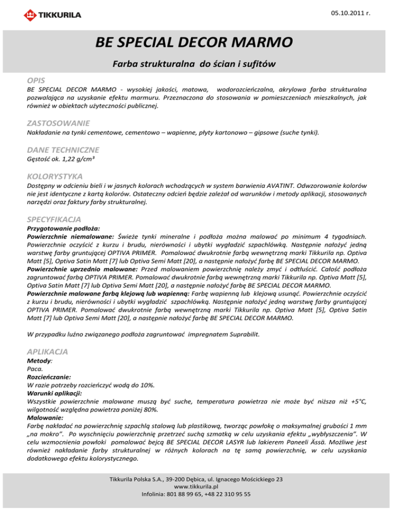 05.10.2011 r. BE SPECIAL DECOR MARMO Farba strukturalna do ścian i sufitów OPIS . BE SPECIAL DECOR MARMO - wysokiej jakości, matowa, wodorozcieoczalna, akrylowa farba strukturalna pozwalająca na uzyskanie efektu marmuru. Przeznaczona do stosowania w pomieszczeniach mieszkalnych, jak również w obiektach użyteczności publicznej. ZASTOSOWANIE Nakładanie na tynki cementowe, cementowo – wapienne, płyty kartonowo – gipsowe (suche tynki). DANE TECHNICZNE Gęstośd ok. 1,22 g/cm³ KOLORYSTYKA Dostępny w odcieniu bieli i w jasnych kolorach wchodzących w system barwienia AVATINT. Odwzorowanie kolorów nie jest identyczne z kartą kolorów. Ostateczny odcieo będzie zależał od warunków i metody aplikacji, stosowanych narzędzi oraz faktury farby strukturalnej. SPECYFIKACJA Przygotowanie podłoża: Powierzchnie niemalowane: Świeże tynki mineralne i podłoża można malowad po minimum 4 tygodniach. Powierzchnie oczyścid z kurzu i brudu, nierówności i ubytki wygładzid szpachlówką. Następnie nałożyd jedną warstwę farby gruntującej OPTIVA PRIMER. Pomalowad dwukrotnie farbą wewnętrzną marki Tikkurila np. Optiva Matt [5], Optiva Satin Matt [7] lub Optiva Semi Matt [20], a następnie nałożyd farbę BE SPECIAL DECOR MARMO. Powierzchnie uprzednio malowane: Przed malowaniem powierzchnię należy zmyd i odtłuścid. Całośd podłoża zagruntowad farbą OPTIVA PRIMER. Pomalowad dwukrotnie farbą wewnętrzną marki Tikkurila np. Optiva Matt [5], Optiva Satin Matt [7] lub Optiva Semi Matt [20], a następnie nałożyd farbę BE SPECIAL DECOR MARMO. Powierzchnie malowane farbą klejową lub wapienną: Farbę wapienną lub klejową usunąd. Powierzchnie oczyścid z kurzu i brudu, nierówności i ubytki wygładzid szpachlówką. Następnie nałożyd jedną warstwę farby gruntującej OPTIVA PRIMER. Pomalowad dwukrotnie farbą wewnętrzną marki Tikkurila np. Optiva Matt [5], Optiva Satin Matt [7] lub Optiva Semi Matt [20], a następnie nałożyd farbę BE SPECIAL DECOR MARMO. W przypadku luźno związanego podłoża zagruntowad impregnatem Suprabilit. APLIKACJA Metody: Paca. Rozcieoczanie: W razie potrzeby rozcieoczyd wodą do 10%. Warunki aplikacji: Wszystkie powierzchnie malowane muszą byd suche, temperatura powietrza nie może byd niższa niż +5°C, wilgotnośd względna powietrza poniżej 80%. Malowanie: Farbę nakładad na powierzchnię szpachlą stalową lub plastikową, tworząc powłokę o maksymalnej grubości 1 mm „na mokro”. Po wyschnięciu powierzchnię przetrzed suchą szmatką w celu uzyskania efektu „wybłyszczenia”. W celu wzmocnienia powłoki pomalowad bejcą BE SPECIAL DECOR LASYR lub lakierem Paneeli Ässä. Możliwe jest również nakładanie farby strukturalnej w różnych kolorach na tę samą powierzchnię, w celu uzyskania dodatkowego efektu kolorystycznego. Tikkurila Polska S.A., 39-200 Dębica, ul. Ignacego Mościckiego 23 www.tikkurila.pl Infolinia: 801 88 99 65, +48 22 310 95 55 05.10.2011 r. BE SPECIAL DECOR MARMO Farba strukturalna do ścian i sufitów Uwaga! Należy zwrócid szczególną uwagę na dokładne i równomierne zagruntowanie całej powierzchni. Kolor . farby wewnętrznej służącej za podkład ma wpływ na ostateczny efekt. Zabarwiony produkt powinien byd mieszany minimum 6 minut. Zaleca się użycie narzędzi malarskich ANZA. Wydajnośd: Do 10 m2/l przy jednokrotnym malowaniu. Wydajnośd w dużej mierze uzależniona jest od takich czynników jak chłonnośd, tekstura podłoża, metoda aplikacji oraz kolor. Czas schnięcia: W temperaturze + 23°C, przy wilgotności względnej powietrza 50%, farba schnie ok. 3 godziny. Czyszczenie narzędzi: Narzędzia należy czyścid wodą, bezpośrednio po zakooczeniu prac. Przed umyciem narzędzia należy dobrze wytrzed, w celu usunięcia możliwie największej ilości produktu . OCHRONA ŚRODOWISKA Płynnych pozostałości nie wylewad do kanalizacji. Należy je przekazad firmom specjalistycznym posiadającym stosowne zezwolenie, w celu utylizacji. Puste opakowania należy oddad do odzysku. WSKAZÓWKI BHP I PPOŻ. Produkt przechowywad w miejscu niedostępnym dla dzieci. Pomieszczenia zamknięte po zastosowaniu farby należy wietrzyd do zaniku zapachu i po tym czasie nadają się one do użytkowania. Produkt nie jest sklasyfikowany jako niebezpieczny. Karta charakterystyki produktu dostępna na życzenie Klienta. Należy zachowad ostrożnośd, unikad dłuższego kontaktu ze skórą. SKŁADOWANIE ORAZ TRANSPORT Produkt powinien byd transportowany i magazynowany w opakowaniach zabezpieczających przed wpływem czynników atmosferycznych. Temperatura magazynowania i transportowania powinna wynosid od +5°C do +25°C. Chronid farbę przed mrozem. OPAKOWANIA 0,9 l; 2,7 l Kat. A /l. Dopuszczalna zawartośd LZO od 2010 r. – 200g/l. Produkt zawiera poniżej 200 g/l LZO. Produkt posiada Atest Higieniczny. Tikkurila Polska S.A., 39-200 Dębica, ul. Ignacego Mościckiego 23 www.tikkurila.pl Infolinia: 801 88 99 65, +48 22 310 95 55 05.10.2011 r. BE SPECIAL DECOR MARMO Farba strukturalna do ścian i sufitów . Tikkurila Polska S.A. gwarantuje właściwą jakośd produktu, nie ma jednak wpływu na warunki i sposób jego zastosowania. Producent nie odpowiada za pracę Projektanta i Wykonawcy. Przedstawione powyżej informacje zostały podane w dobrej wierze, według aktualnego stanu wiedzy i doświadczenia praktycznego, co nie zwalnia od odpowiedzialności za wykonanie prac zgodnie z zasadami sztuki budowlanej i BHP. Tikkurila Polska S.A. nie ponosi odpowiedzialności za wady i szkody powstałe w wyniku łącznego stosowania naszych produktów z materiałami pochodzącymi z oferty innych producentów, a także w przypadku wprowadzania jakichkolwiek modyfikacji recepturowych przez nabywców i użytkowników. Producent zastrzega sobie prawo do zmiany treści w kolejnych edycjach karty technicznej bez wcześniejszego informowania o tym fakcie odbiorców. Tikkurila Polska S.A. zastrzega sobie również peł