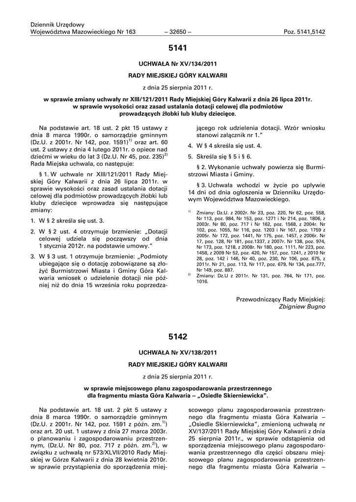 Dziennik Urzędowy Województwa Mazowieckiego Nr 163 – 32650 – Poz. 5141,5142 5141 5 14 1 UCHWAŁA Nr XV/134/2011 RADY MIEJSKIEJ GÓRY KALWARII z dnia 25 sierpnia 2011 r. w sprawie zmiany uchwały nr XIII/121/2011 Rady Miejskiej Góry Kalwarii z dnia 26 lipca 2011r. w sprawie wysokości oraz zasad ustalania dotacji celowej dla podmiotów prowadzących żłobki lub kluby dziecięce. Na podstawie art. 18 ust. 2 pkt 15 ustawy z dnia 8 marca 1990r. o samorządzie gminnym (Dz.U. z 2001r. Nr 142, poz. 1591)1) oraz art. 60 ust. 2 ustawy z dnia 4 lutego 2011r. o opiece nad dziećmi w wieku do lat 3 (Dz.U. Nr 45, poz. 235)2) Rada Miejska uchwala, co następuje: jącego rok udzielenia dotacji. Wzór wniosku stanowi załącznik nr 1.” 4. W § 4 skreĝla się ust. 4. § 1. W uchwale nr XIII/121/2011 Rady Miejskiej Góry Kalwarii z dnia 26 lipca 2011r. w sprawie wysokoĝci oraz zasad ustalania dotacji celowej dla podmiotów prowadzących ġłobki lub kluby dziecięce wprowadza się następujące zmiany: § 3. Uchwała wchodzi w ġycie po upływie 14 dni od dnia ogłoszenia w Dzienniku Urzędowym Województwa Mazowieckiego. 5. Skreĝla się § 5 i § 6. § 2. Wykonanie uchwały powierza się Burmistrzowi Miasta i Gminy. 1) 1. W § 2 skreĝla się ust. 3. 2. W § 2 ust. 4 otrzymuje brzmienie: „Dotacji celowej udziela się począwszy od dnia 1 stycznia 2012r. na podstawie umowy.” 3. W § 3 ust. 1 otrzymuje brzmienie: „Podmioty ubiegające się o dotację zobowiązane są złoġyć Burmistrzowi Miasta i Gminy Góra Kalwaria wniosek o udzielenie dotacji nie póğniej niġ do dnia 15 wrzeĝnia roku poprzedza- 2) Zmiany: Dz.U. z 2002r. Nr 23, poz. 220, Nr 62, poz. 558, Nr 113, poz. 984, Nr 153, poz. 1271 i Nr 214, poz. 1806, z 2003r. Nr 80, poz. 717 i Nr 162, poz. 1568, z 2004r. Nr 102, poz. 1055, Nr 116, poz. 1203 i Nr 167, poz. 1759 z 2005r. Nr 172, poz. 1441, Nr 175, poz. 1457, z 2006r. Nr 17, poz. 128, Nr 181, poz.1337, z 2007r. Nr 138, poz. 974, Nr 173, poz. 1218, z 2008r. Nr 180, poz. 1111, Nr 223, poz. 1458, z 2009 Nr 52, poz. 420, Nr 157, poz. 1241, z 2010 Nr 28, poz. 142 i 146, Nr 40, poz. 230, Nr 106, poz. 675, z 2011r. Nr 21, poz. 113, Nr 117, poz. 679, Nr 134, poz.777, Nr 149, poz. 887. Zmiany: Dz.U z 2011r. Nr 131, poz. 764, Nr 171, poz. 1016. Przewodniczący Rady Miejskiej: Zbigniew Bugno 5 14 1 5142 5 142 UCHWAŁA Nr XV/138/2011 RADY MIEJSKIEJ GÓRY KALWARII z dnia 25 sierpnia 2011 r. w sprawie miejscowego planu zagospodarowania przestrzennego dla fragmentu miasta Góra Kalwaria – „Osiedle Skierniewicka”. Na podstawie art. 18 ust. 2 pkt 5 ustawy z dnia 8 marca 1990r. o samorządzie gminnym (Dz.U. z 2001r. Nr 142, poz. 1591 z póğn. zm.1)) oraz art. 20 ust. 1 ustawy z dnia 27 marca 2003r. o planowaniu i zagospodarowaniu przestrzennym, (Dz.U. Nr 80, poz. 717 z póğn. zm.2)), w związku z uchwałą nr 573/XLVII/2010 Rady Miejskiej w Górze Kalwarii z dnia 28 kwietnia 2010r. w sprawie przystąpienia do sporządzenia miej- scowego planu zagospodarowania przestrzennego dla fragmentu miasta Góra Kalwaria – „Osiedle Skierniewicka”, zmienioną uchwałą nr XV/137/2011 Rady Miejskiej Góry Kalwarii z dnia 25 sierpnia 2011r., w sprawie odstąpienia od sporządzenia miejscowego planu zagospodarowania przestrzennego dla częĝci obszaru miejscowego planu zagospodarowania przestrzennego dla fragmentu miasta Góra Kalwaria – Dziennik Urzędowy Województwa Mazowieckiego Nr 163 – 32651 – „Osiedle Skierniewicka”. Po stwierdzeniu, ġe niniejszy plan jest zgodny z ustaleniami Studium Uwarunkowaě i Kierunków Zagospodarowania Przestrzennego Miasta i Gminy Góra Kalwaria, przyjętego uchwałą nr 700/XLVII/2006 Rady Miejskiej w Górze Kalwarii z dnia 13 wrzeĝnia 2006r., Rada Miejska Góry Kalwarii uchwala, co następuje: Poz. 5142 5) parametrów i wskağników kształtowania zabudowy oraz zagospodarowania terenu; 6) granic i sposobów zagospodarowania terenów i obiektów podlegających ochronie, ustalonych na podstawie odrębnych przepisów; 7) zasad i warunków scalania i podziału nieruchomoĝci objętych planem miejscowym; 8) § 1. Uchwala się miejscowy plan zagospodarowania przestrzennego dla fragmentu miasta Góra Kalwaria – „Osiedle Skierniewicka”, zwany dalej „planem”, którego granice wyznaczają kolejno: szczególnych warunków zagospodarowania terenów oraz ograniczeě w ich uġytkowaniu, w tym zakaz zabudowy; 9) zasad modernizacji, rozbudowy i budowy systemów komunikacji oraz infrastruktury technicznej; 1) od północy - fragment północnej linii rozgraniczającej ul. Skierniewickiej oraz granica terenów kolejowych; 10) sposobu i terminu tymczasowego zagospodarowania, urządzania i uġytkowania terenów; 2) od wschodu - zachodnia linia rozgraniczająca ul. Budowlanych; 11) stawek procentowych, na podstawie których ustala się opłatę, o której mowa w art. 36 ust. 4 ustawy o planowaniu i zagospodarowaniu przestrzennym. Rozdział 1 Przepisy ogólne 3) od południa - oĝ istniejącej drogi (ul. Rybie); 4) zachodnia linia rozgraniczająca projektowanej drogi 3KDD oraz odcinek dochodzący prostopadle do osi istniejącej drogi - ul. Rybie; linia prosta biegnąca wzdłuġ zachodnich granic działek ewidencyjnych o numerach 4/31, 4/10 dochodząca do północnej linii rozgraniczającej ul. Skierniewickiej. § 2. Granice obszaru objętego planem, o których mowa w ust. 1, przedstawiono na rysunku planu sporządzonym w skali 1:1000. § 3. Załącznikami do uchwały są: 1) rysunek planu – stanowiący załącznik nr 1 do uchwały; 2) rozstrzygnięcia o sposobie rozpatrzenia nieuwzględnionych uwag do projektu planu stanowiące załącznik nr 2 do uchwały; 3) rozstrzygnięcie o sposobie realizacji inwestycji z zakresu infrastruktury technicznej, które naleġą do zadaě własnych gminy, oraz zasadach ich finansowania – stanowiące załącznik nr 3 do uchwały. § 5.1. Następujące ustalenia graficzne na rysunku planu są obowiązującymi ustaleniami pl